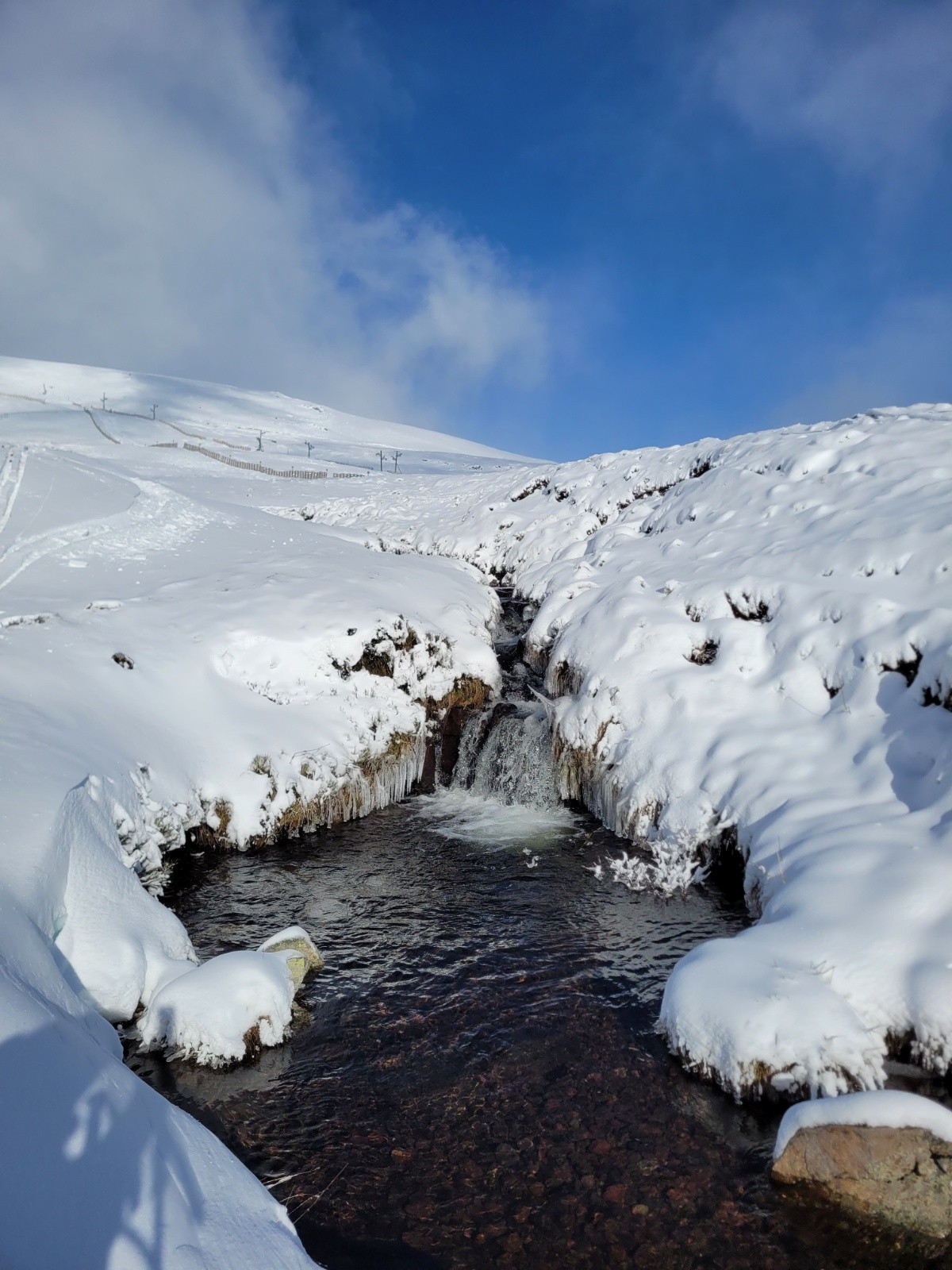Après un mois de novembre exceptionnel concernant la quantité de pluie reçue par le Cantal (Le Lioran 634mm, Mandailles 696mm!!), les rus descendants des sommets sont encore bien larges et ce ne sont pas quelques cm de poudreuse qui ont pu figer des ponts de neige.