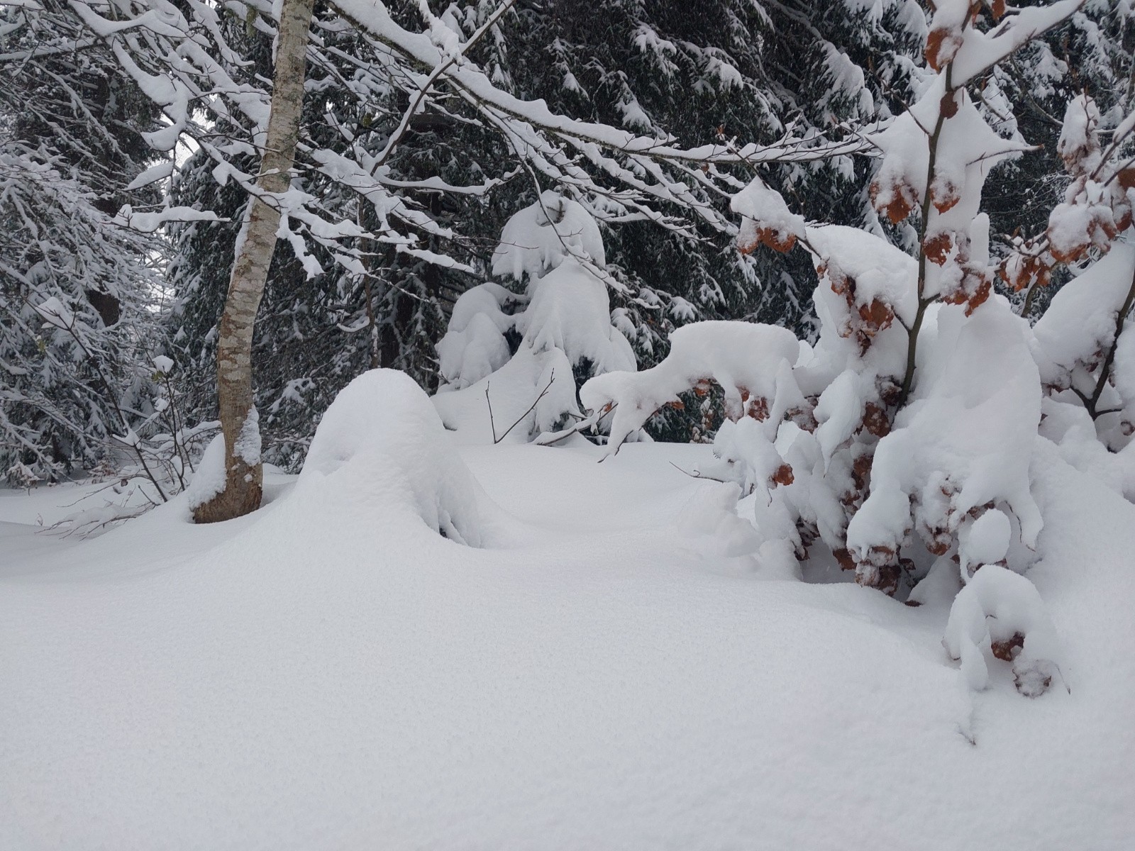 Quel plaisir de retrouver la Chartreuse bien blanche ! J'avais loupé les quelques créneaux de la saison passée... Alors évidemment on l'a connue sous plus de neige, cette Chartreuse mais vu ce qui est tombé jusqu'à hier, on ne va pas faire les difficiles. Evidemment, pour la solitude contemplative, faudra revenir une autre fois : piétons, raquettes, fondeurs, fondeuses, et aussi quelques skieurs de randos, tout le monde est là. Mais la plupart monte par la route, du coup il y a un peu moins de monde en montant par les crêtes. La montée est bien tracée, la descente par l'ancienne piste est quasiment damée. Par contre, la végétation arbustive est encore bien visible sur le haut. Mais il y a suffisamment de neige pour skier sans peur de toucher le fond à découvert d'autant que la sous-couche restante qui a pris la pluie est bien compacte. En revanche à couvert : je n'ai pas essayé, sans regret !