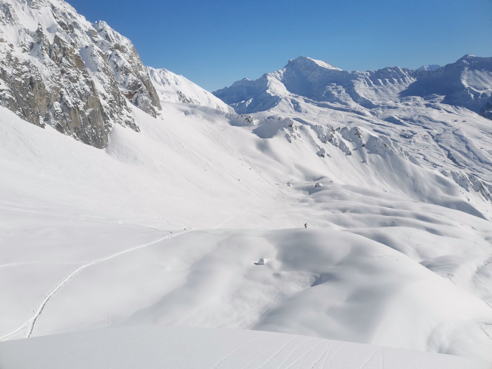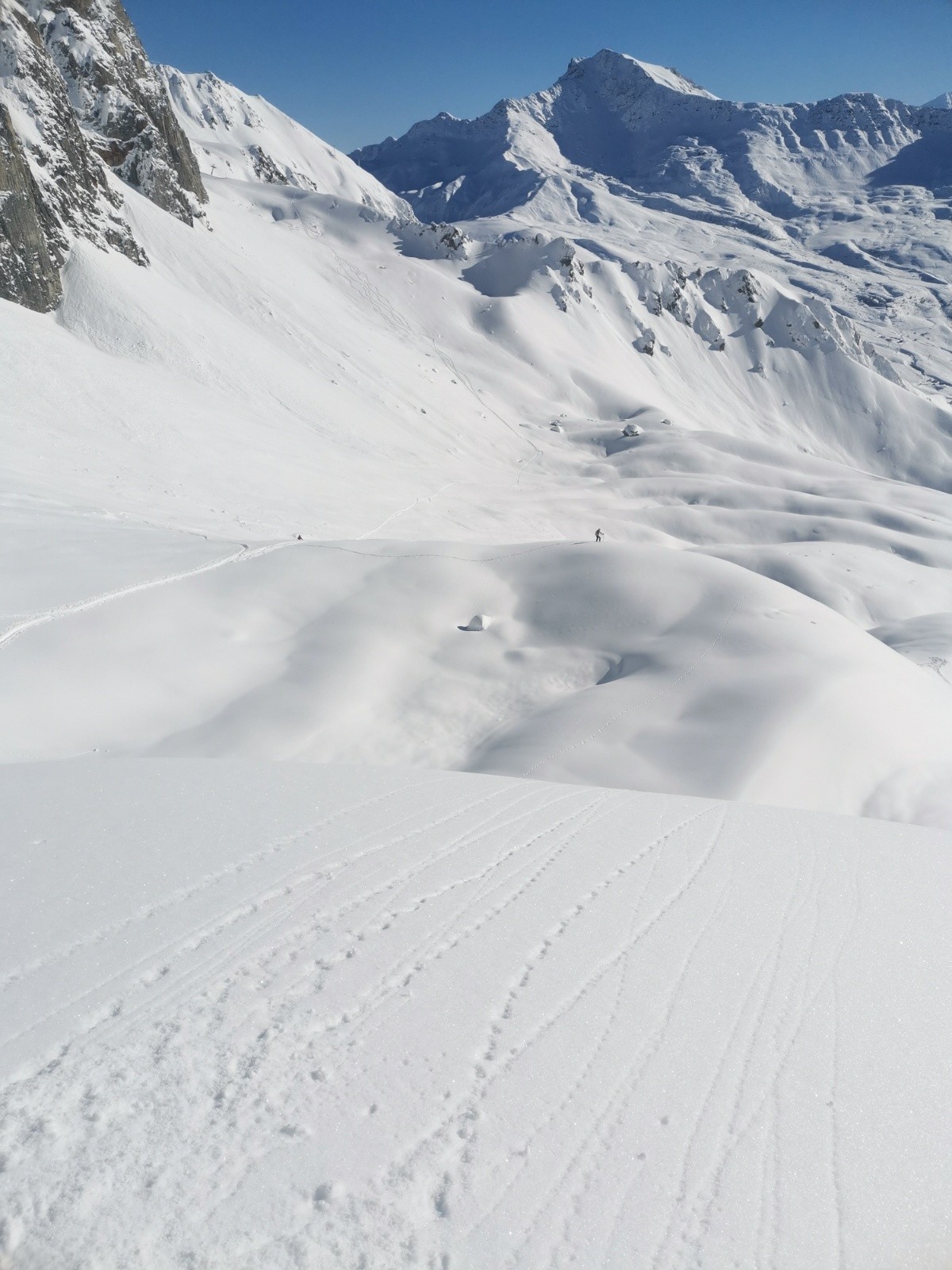 Activité avalancheuse : de grosses accus donc pas toujours serein dans les raidars, mais rien n'a bougé. Par contre des purges en S raide, dont une qui embarque le bord de la trace et Patrice au passage qui descend de 50m.