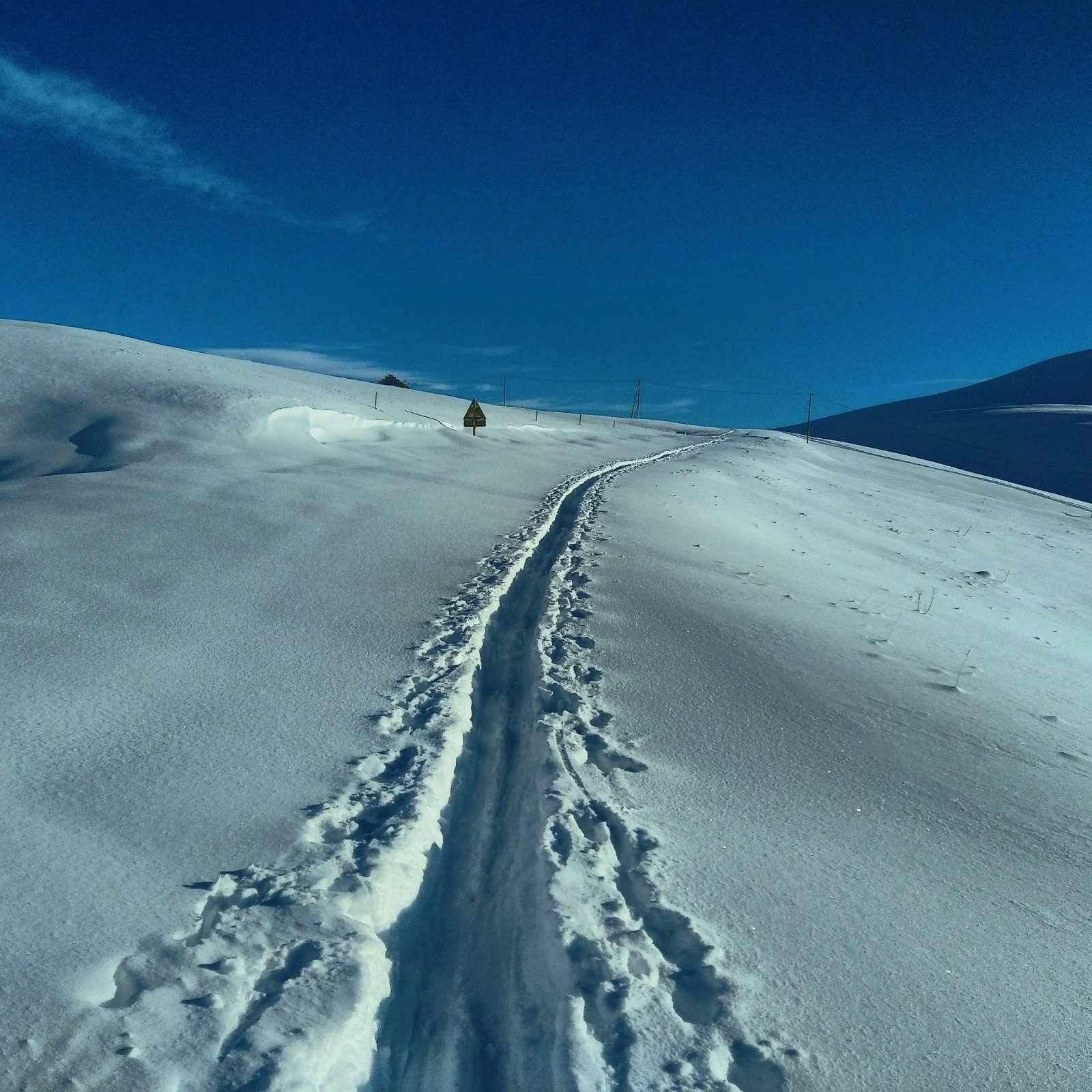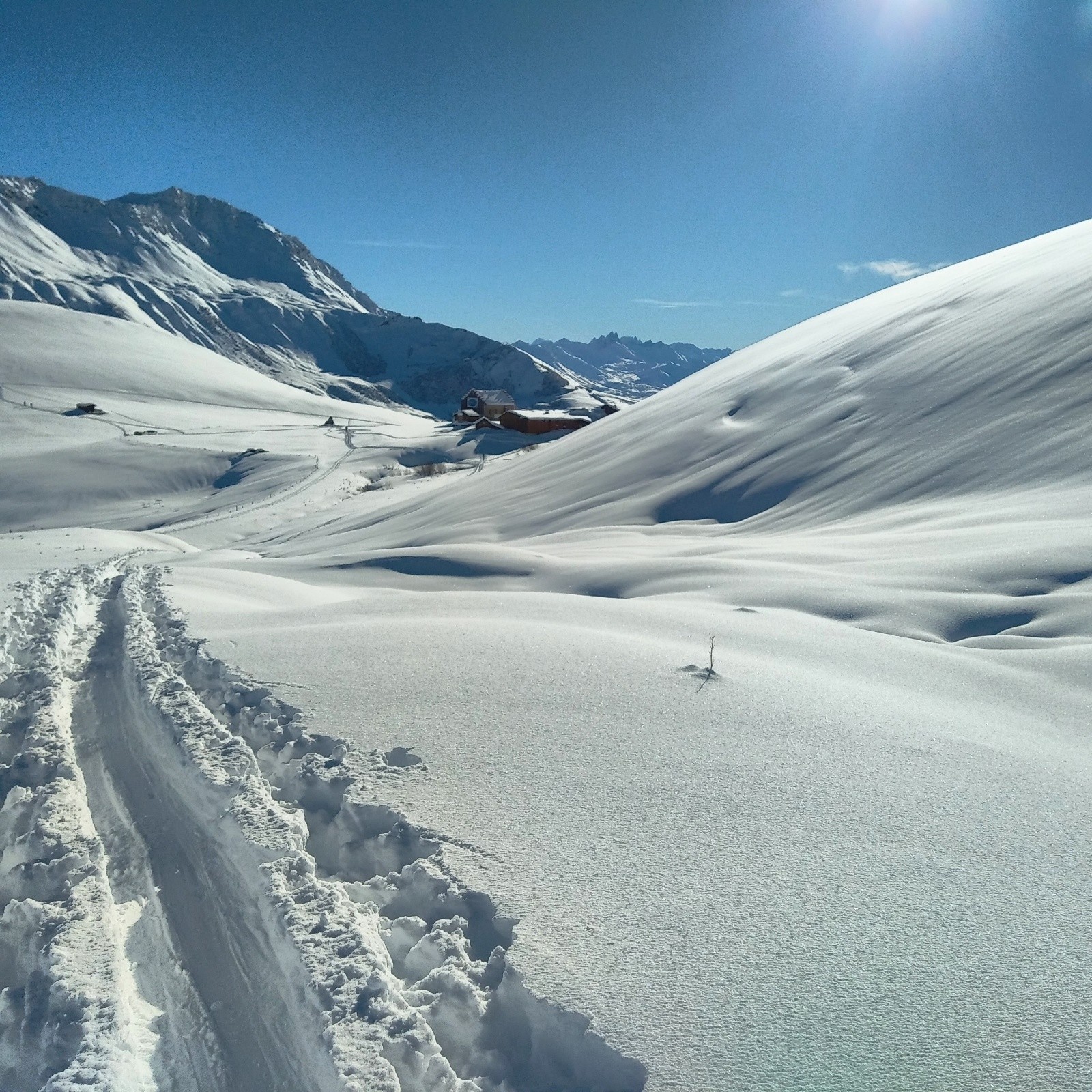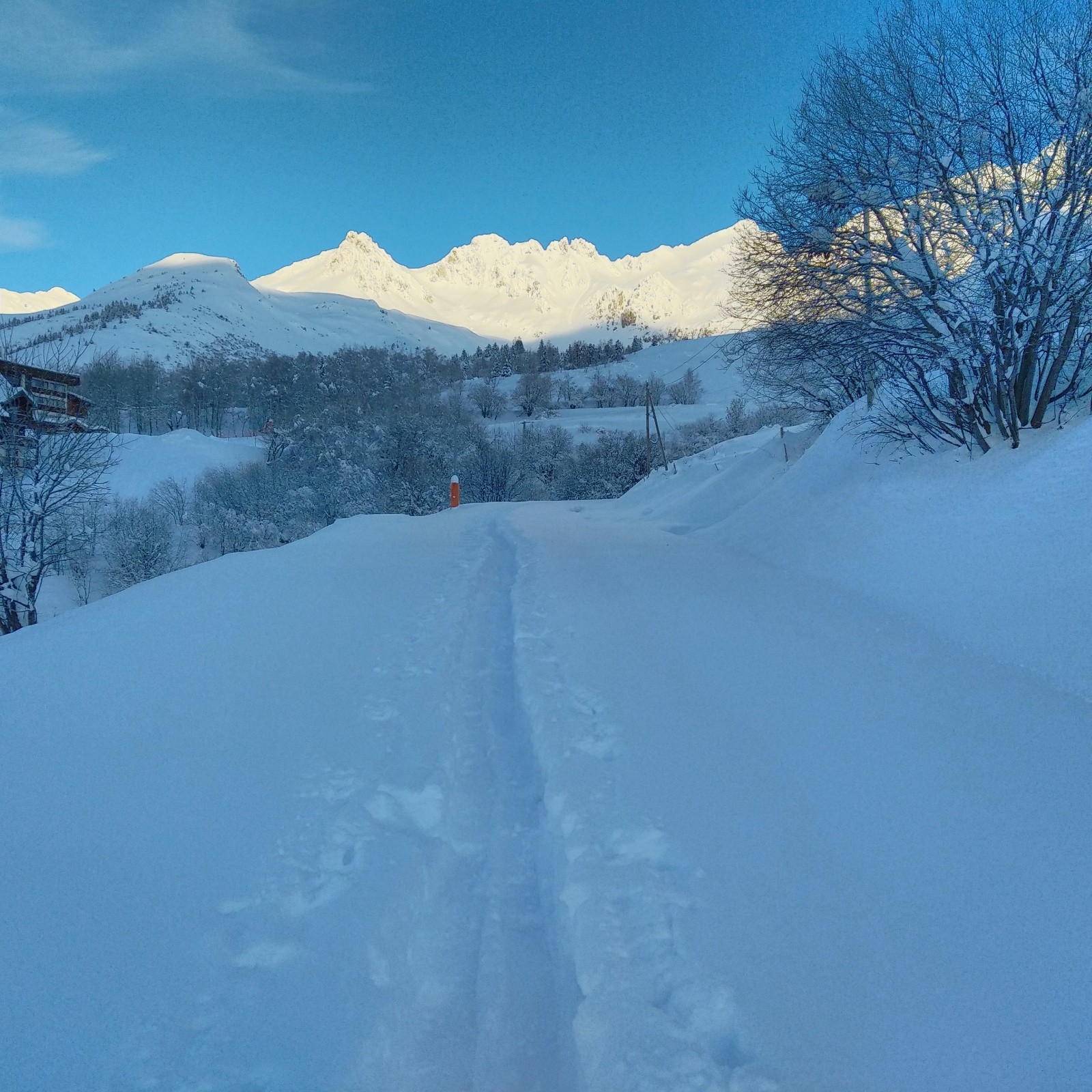 Doublé deux personnes rapidement...c'est tracé jusqu'au col de la madeleine...ensuite...tout vierge...gloups... j'attaque donc a tracer dans 30 a 60 cm par moment... jusqu'au Vallon qui mene au col...