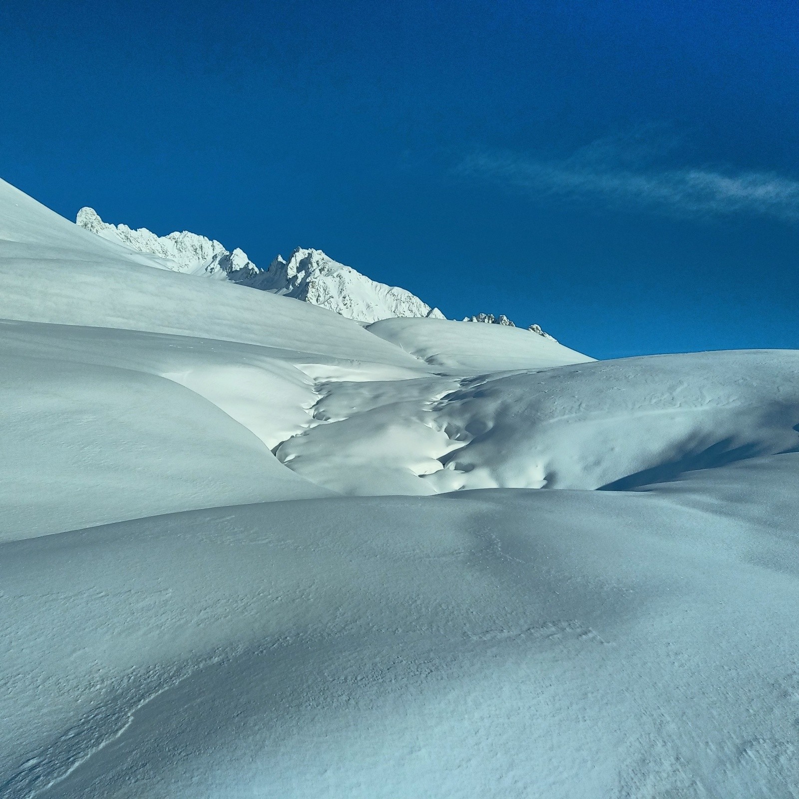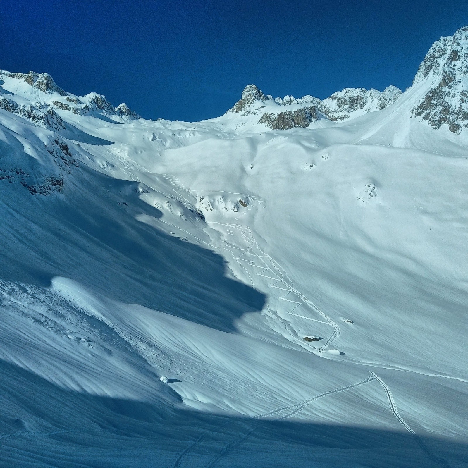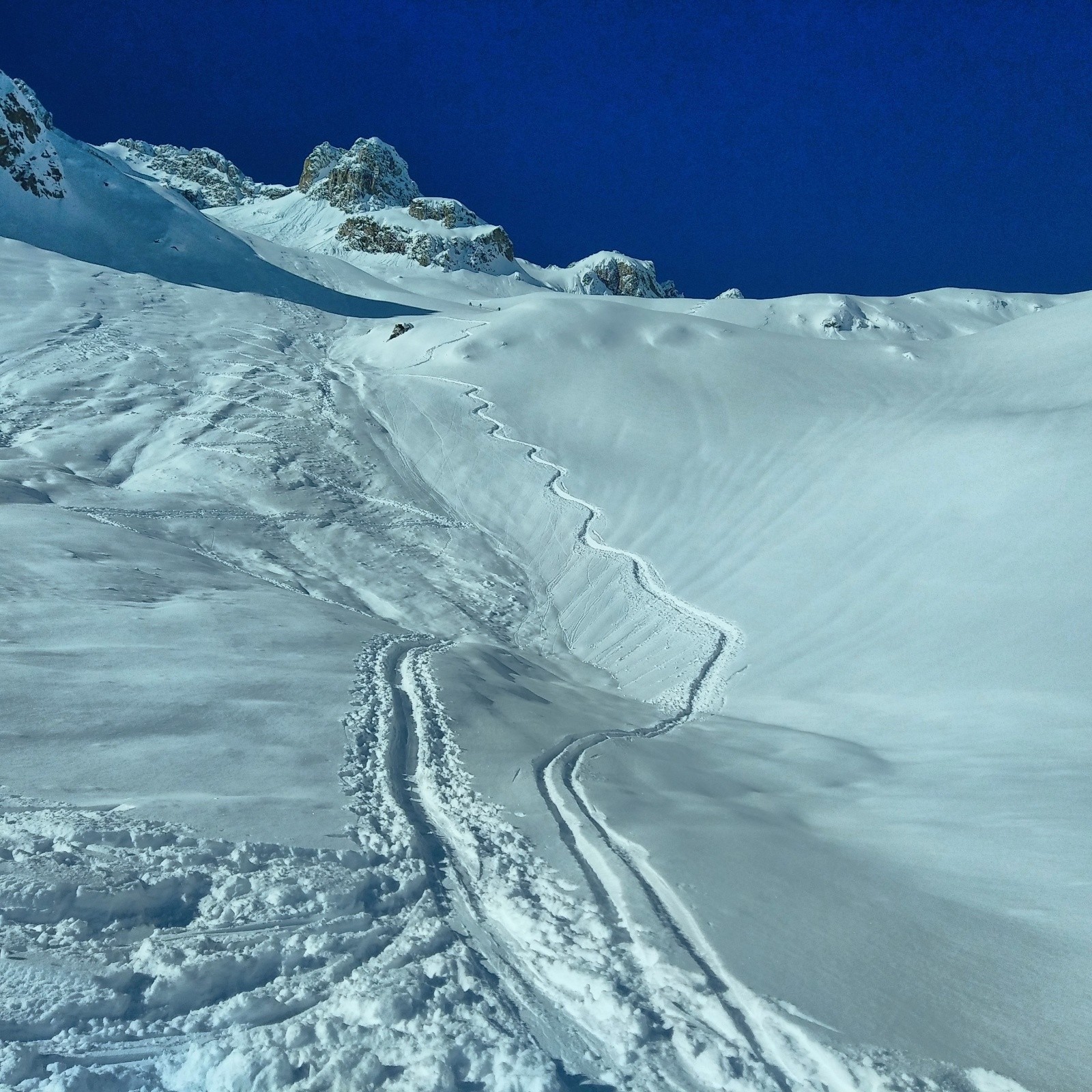 J'arriverai derrière la dernière traceuse...on voit pas mal de monde derrière qui arrivent...je ne traine pas trop...et je profite des pentes vierges...mais la neige est dure a brasser...c'est physique...mais c'est bon...je repaute en bas pour revenir sur le col de la madeleine...le reste de la descente est moyenne...trop de neige et requins par endroits.