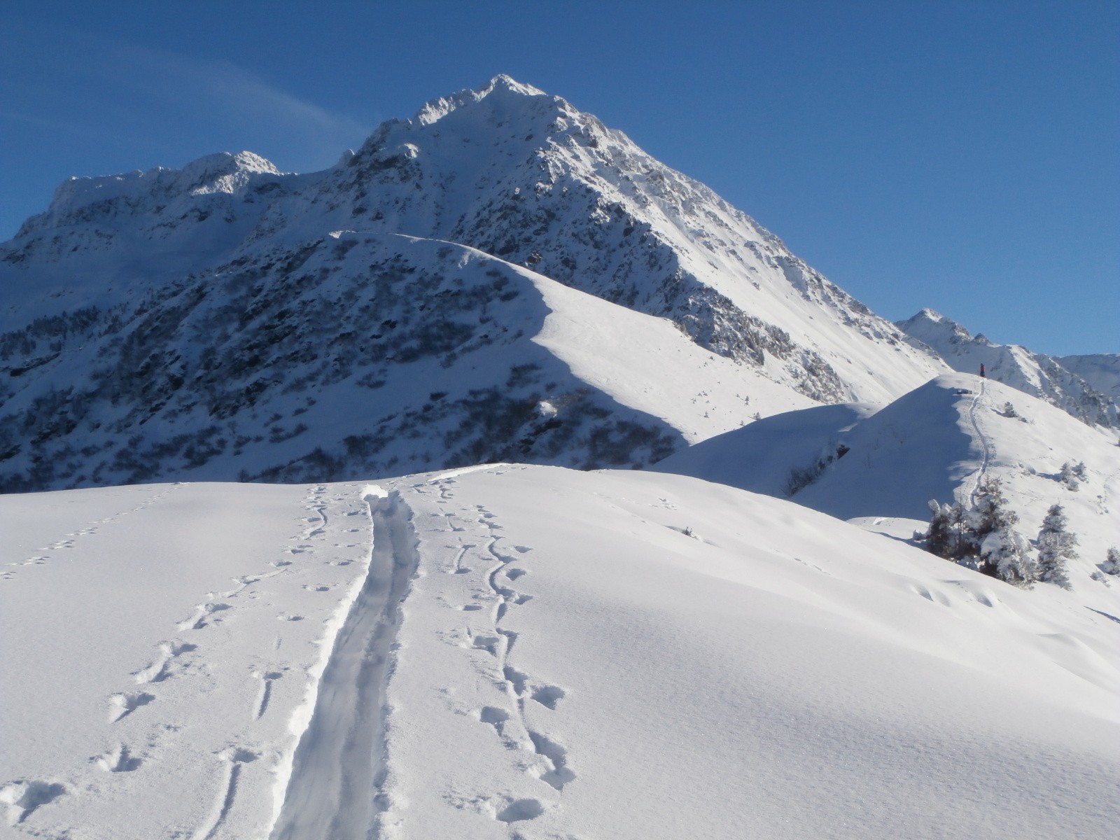 À signaler que le bulletin d'avalanche était complètement erroné en ce qui concerne l'enneigement. Il indiquait "Limites skiables vers 1800 à 2000 m, là où la sous-couche était plus importante. Skiable aussi un peu en-dessous mais avec précaution, car les cailloux ne sont parfois pas loin."