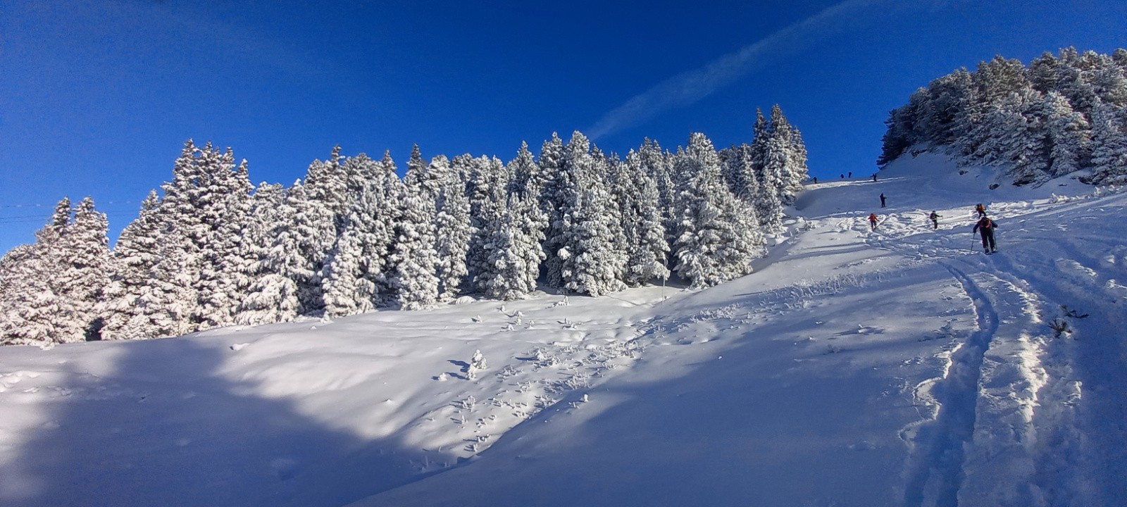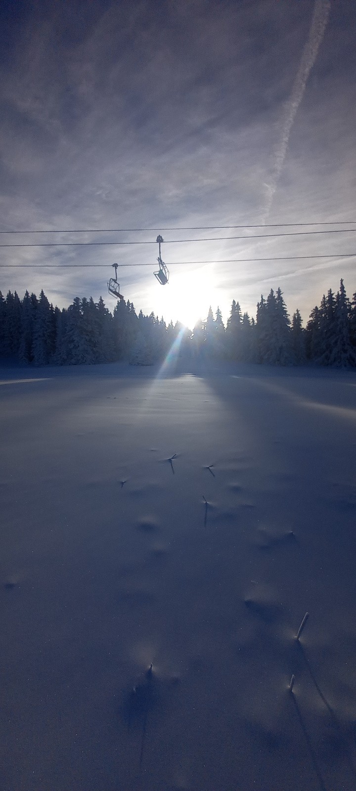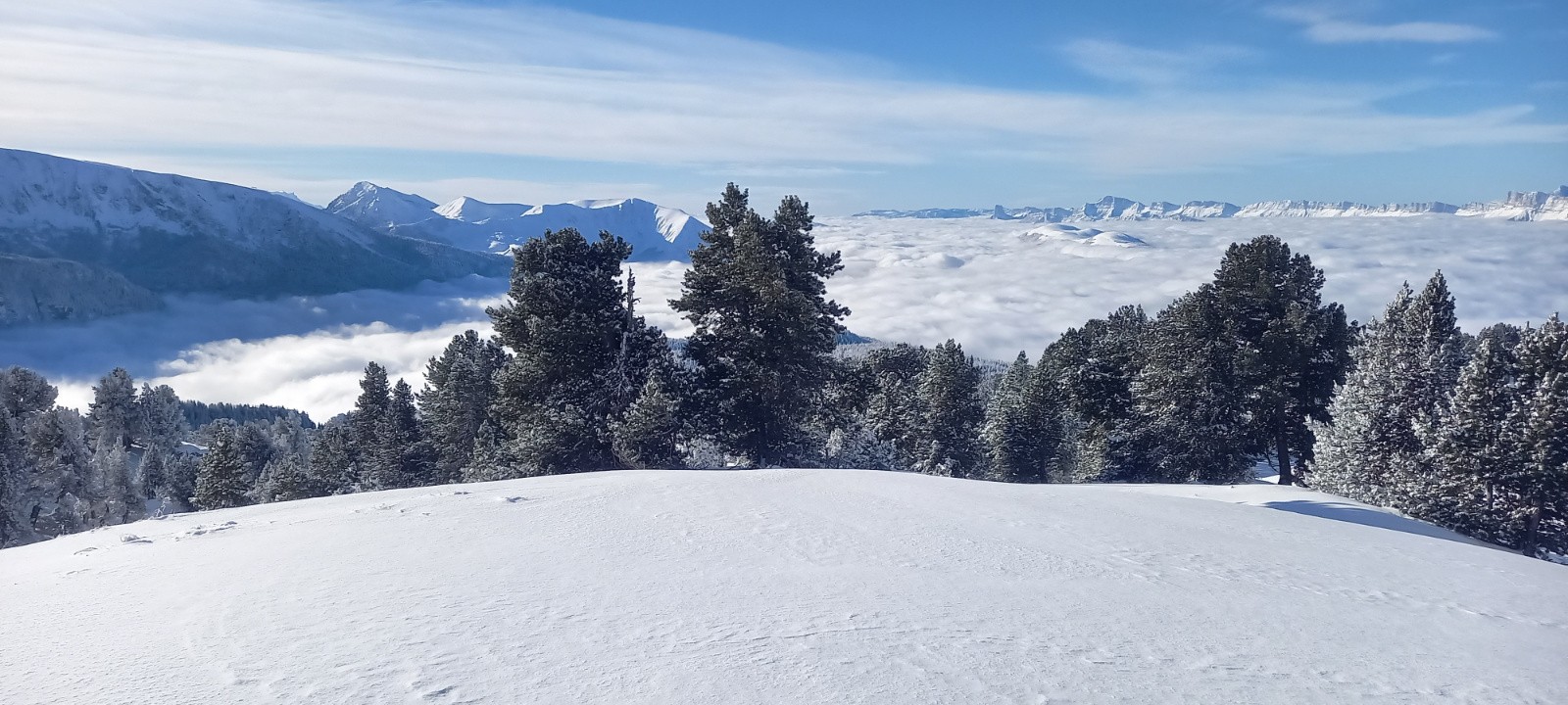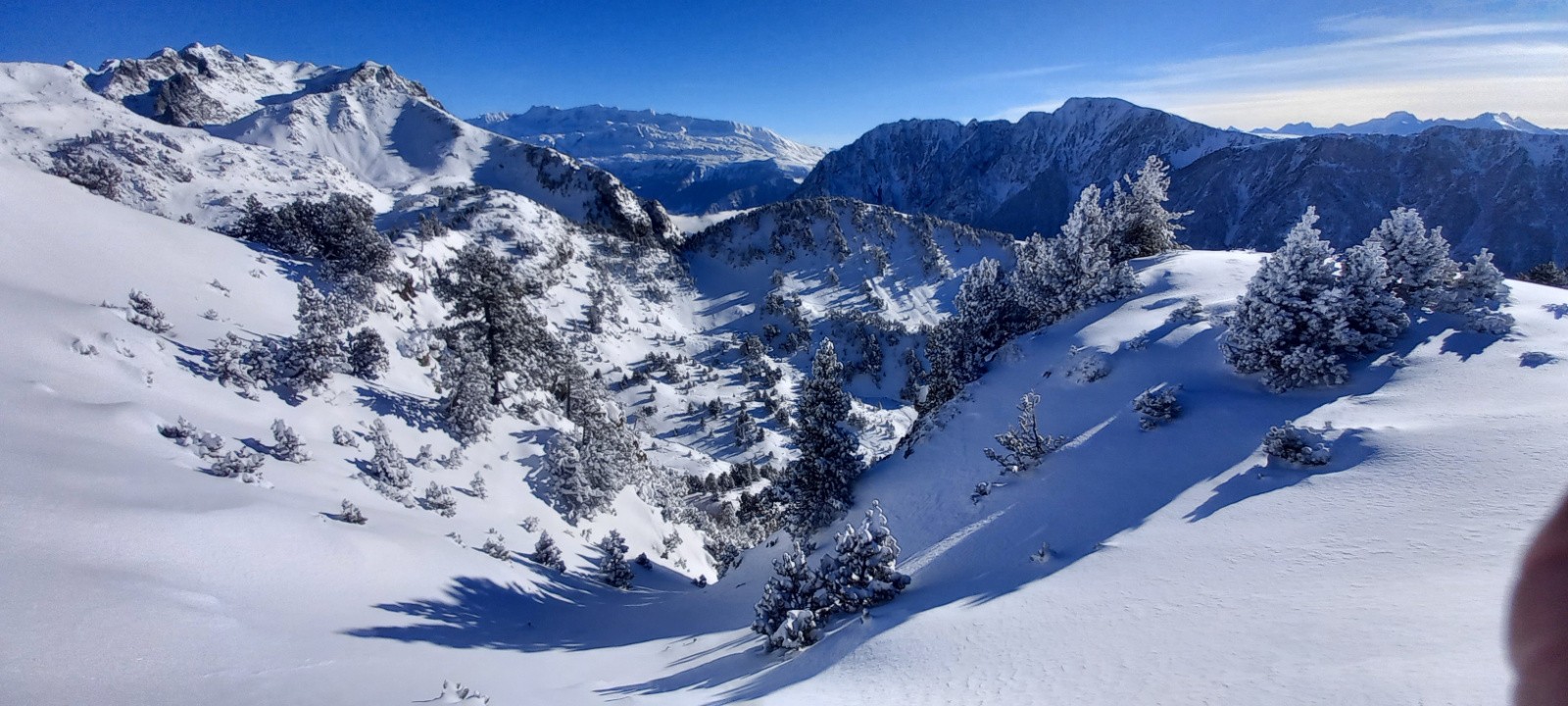 Conditions pour le ski : Très bonne pour une première couche. Poudre légère dans les valons. Soufflée sur les crêtes. Croutée parfois à cause du travail du vent.