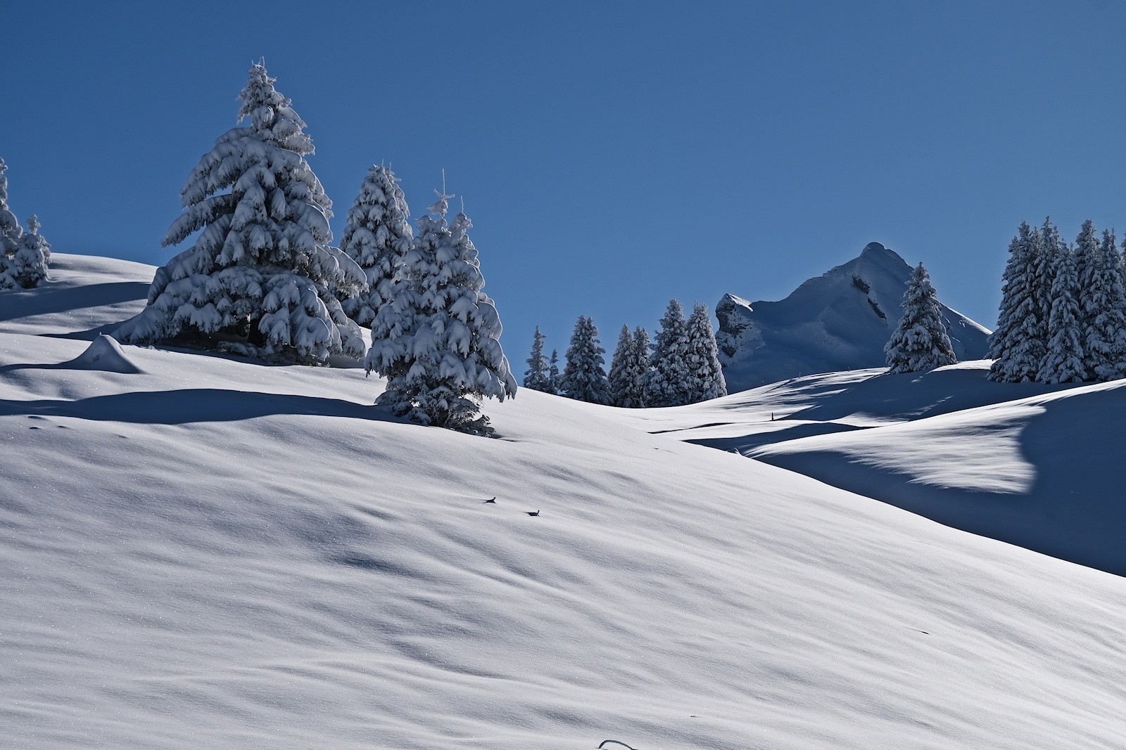 La descente en direction du Macheux est agréable mais...l'épaisseur du manteau neigeux freine nos envies de virages !!! A l'ombre de la forêt traversée par le Nant Bargat, nous repeautons pour rejoindre les 1404 mètres de l'Arbarète, dont le décor alentour de ronces et arbustes redessinés par la neige invitent à la contemplation. Un peu plus de monde dans le secteur (à raquettes ou à skis) nous incite à suivre la trace qui remonte au Plan des Mouilles, à travers les sombres épicéas, avant de retrouver le versant ensoleillé de la combe de Riondaz. A nous de tracer pour en atteindre les 1746 mètres du sommet, et s'offrir un nouveau tour d'horizon, notamment vers les abrupts calcaires du Parmelan, au delà duquel quelques mers de nuages comblent les vallées lointaines. Plusieurs traces de skieurs et de … coulées sous la Pointe de la Mandellaz confirment la fréquentation du jour.