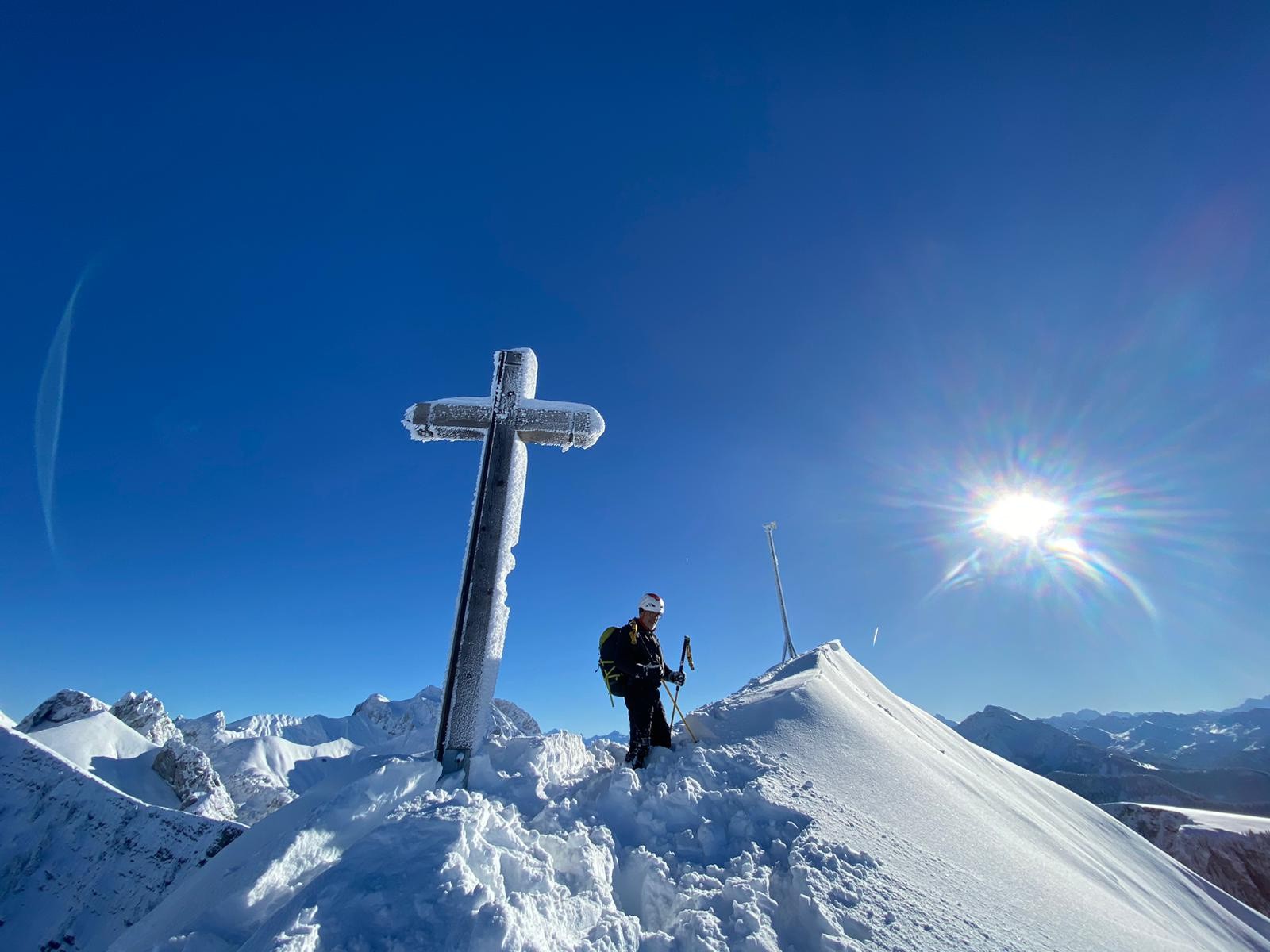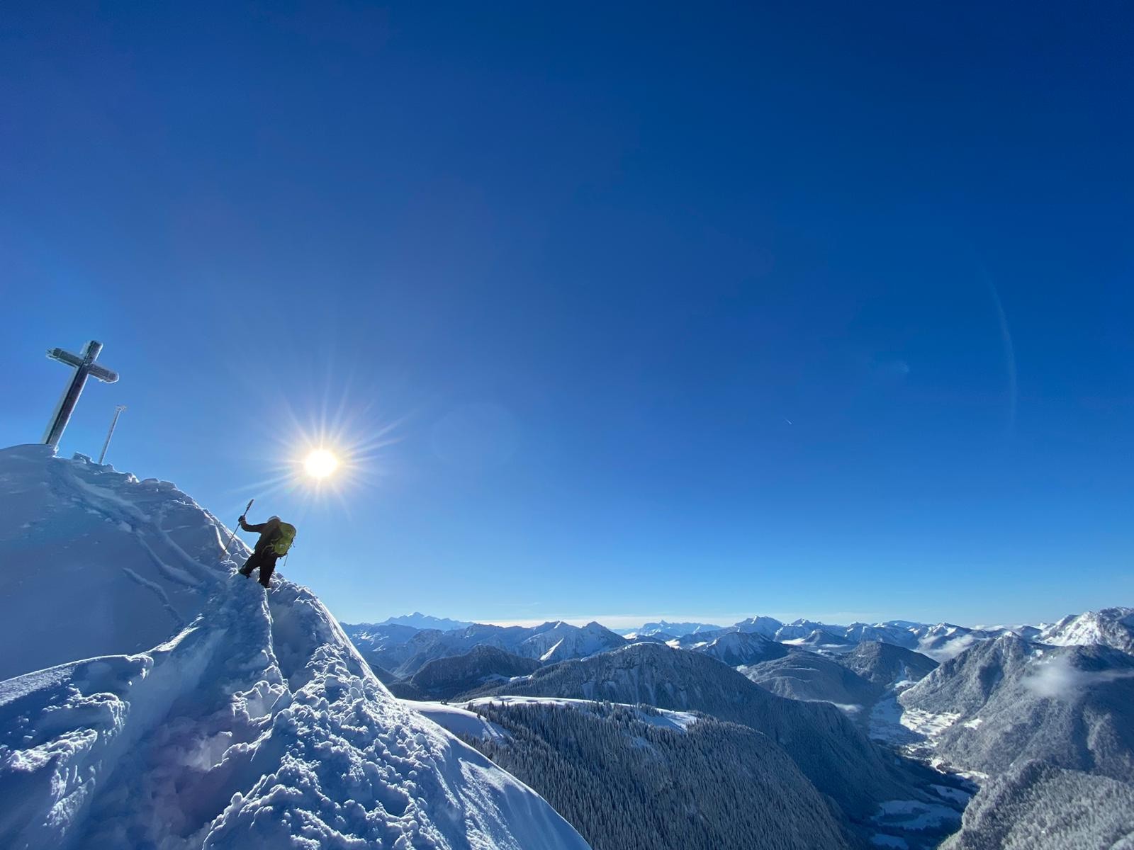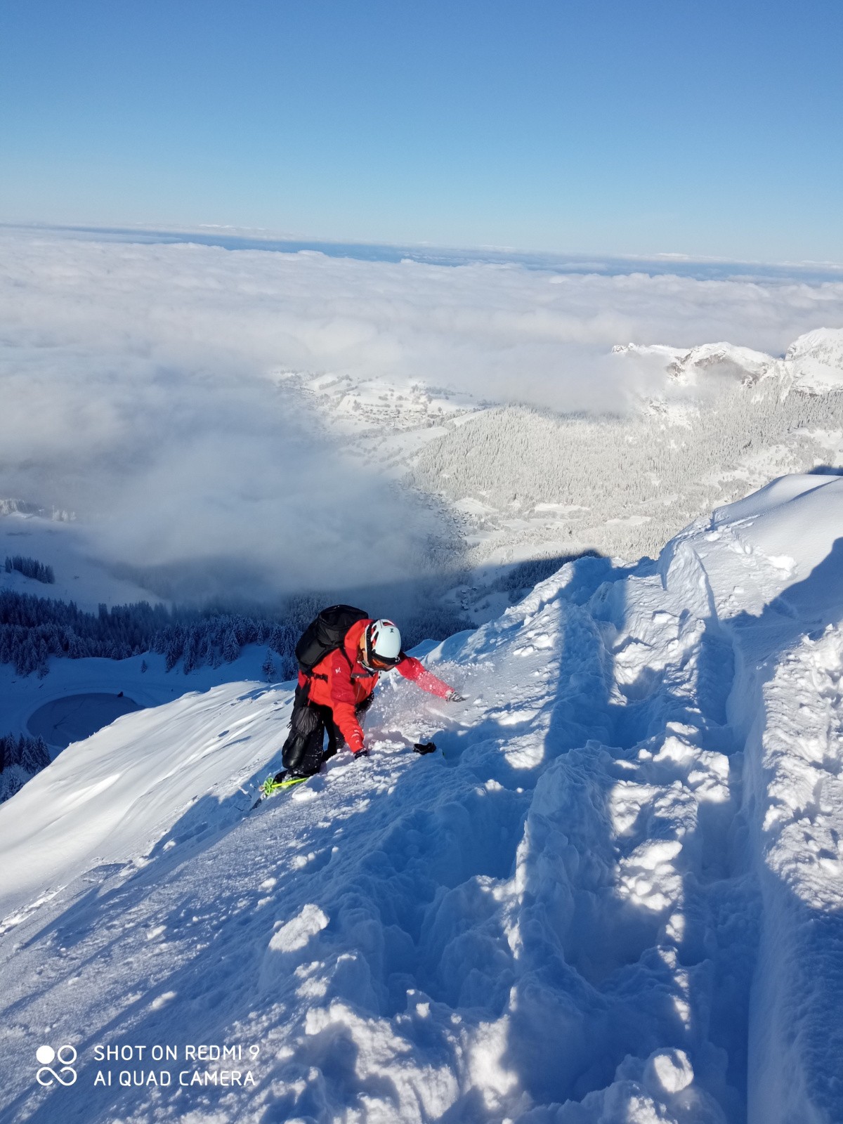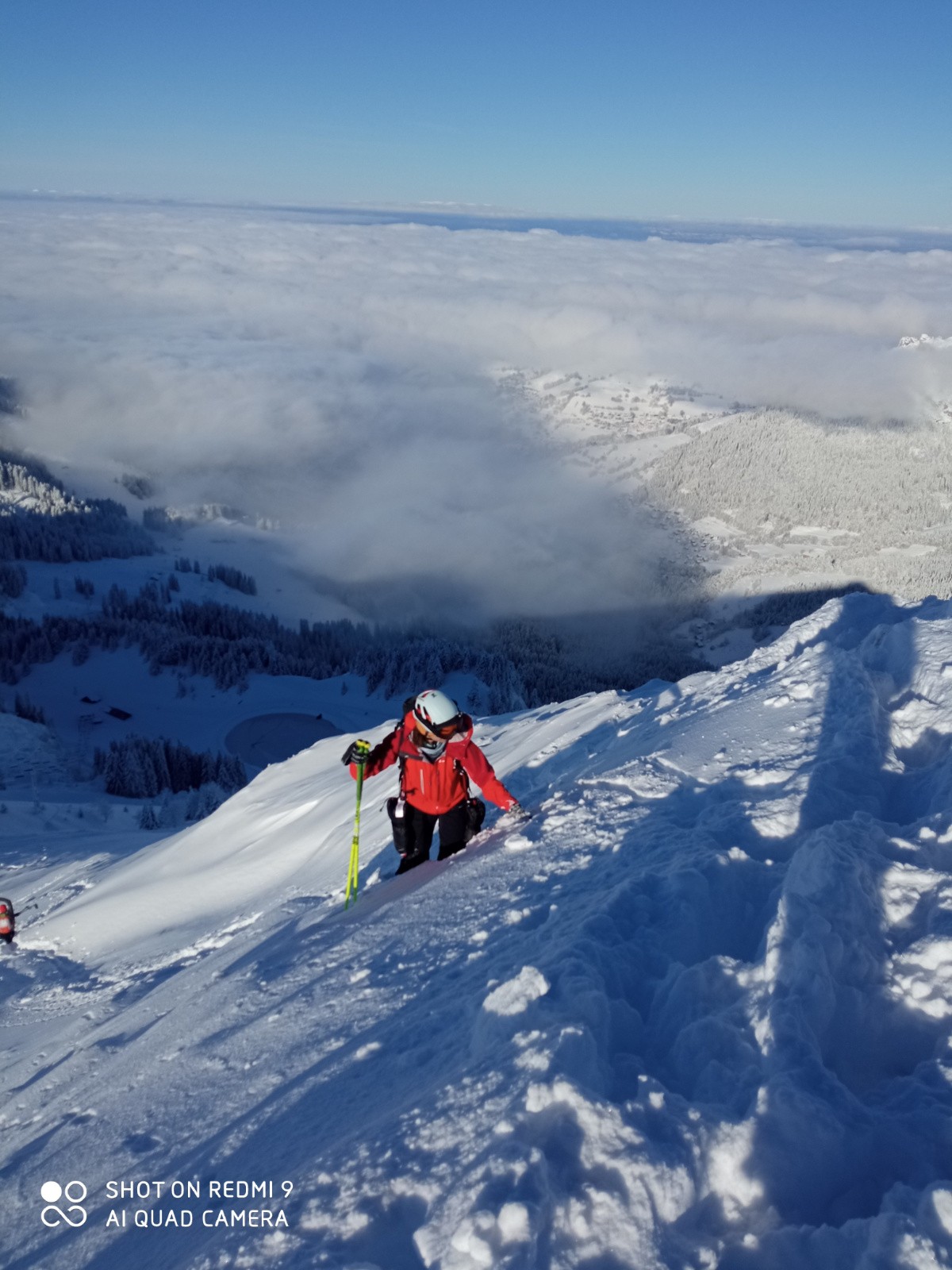 La descente directe du sommet l'a un peu impressionnée , mais après quelques virages dans la pente poudreuse tout allait mieux 😊