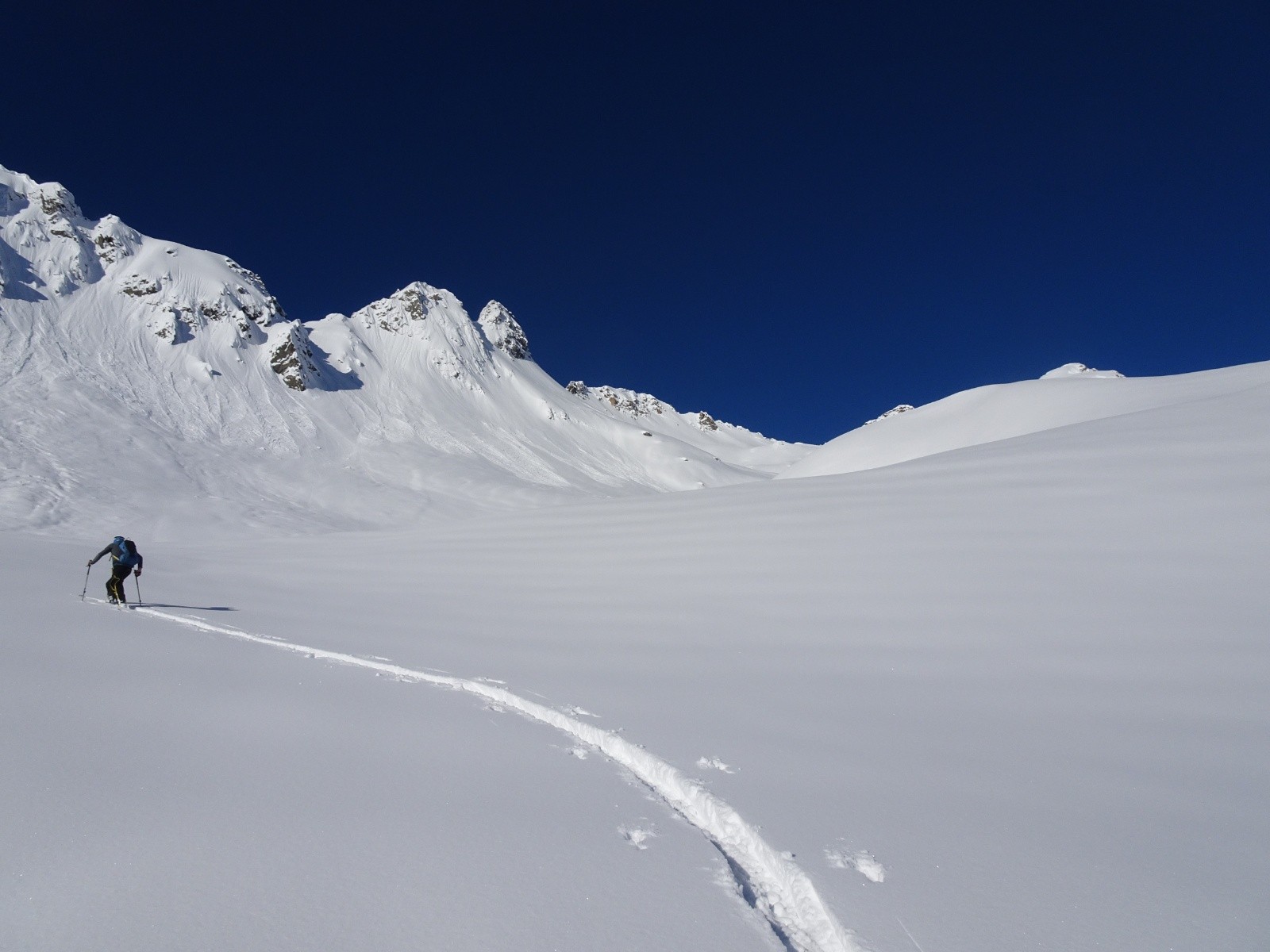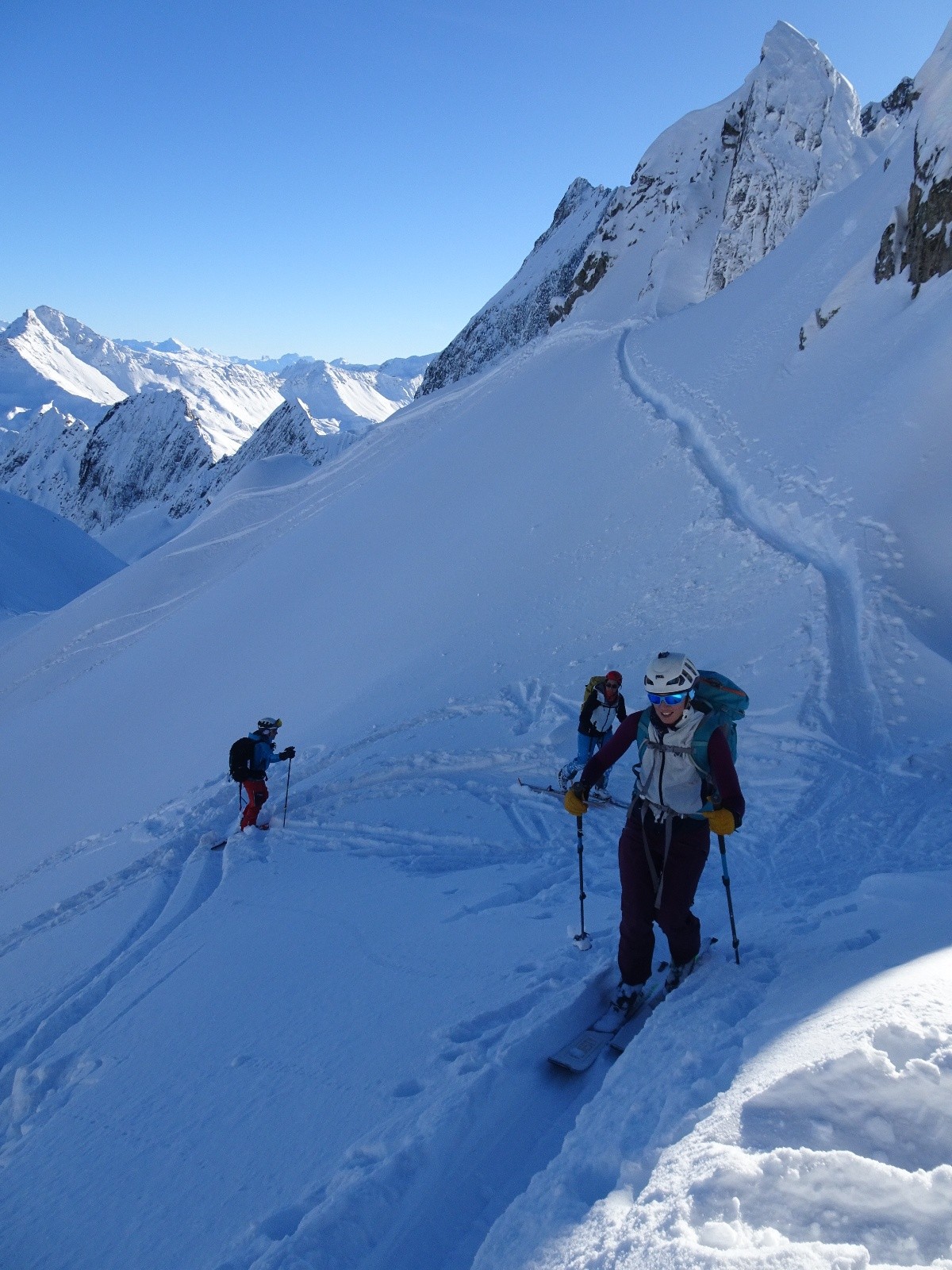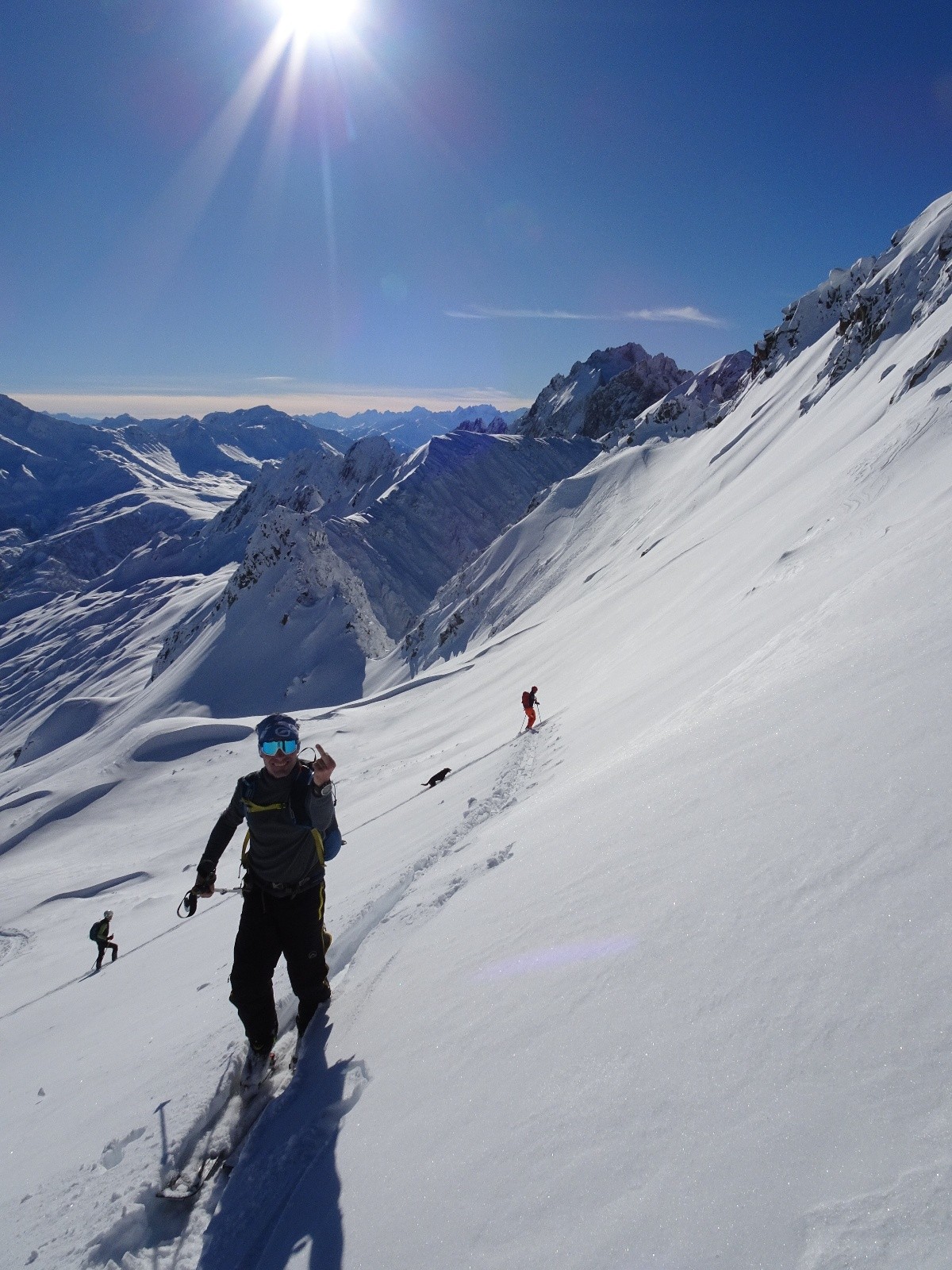 Conditions pour le ski : grosse poudre, presque trop même avec 100mm, sous couche dès le départ à 1300.
