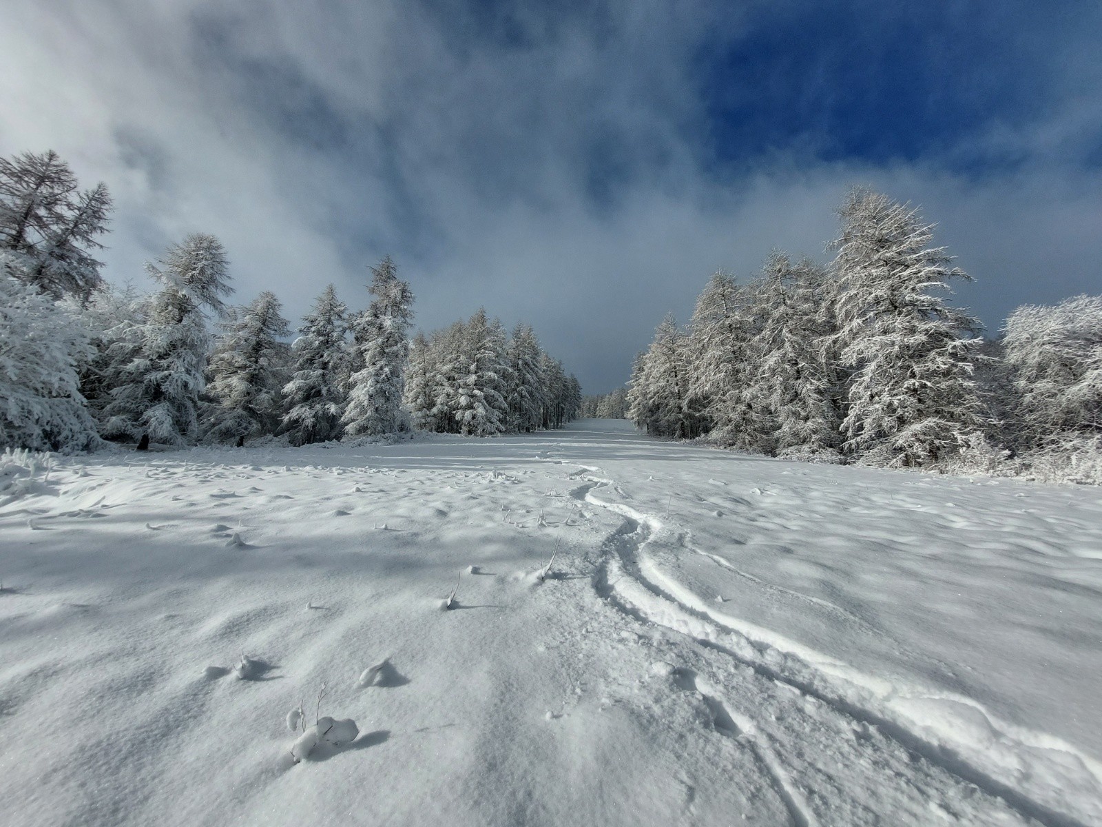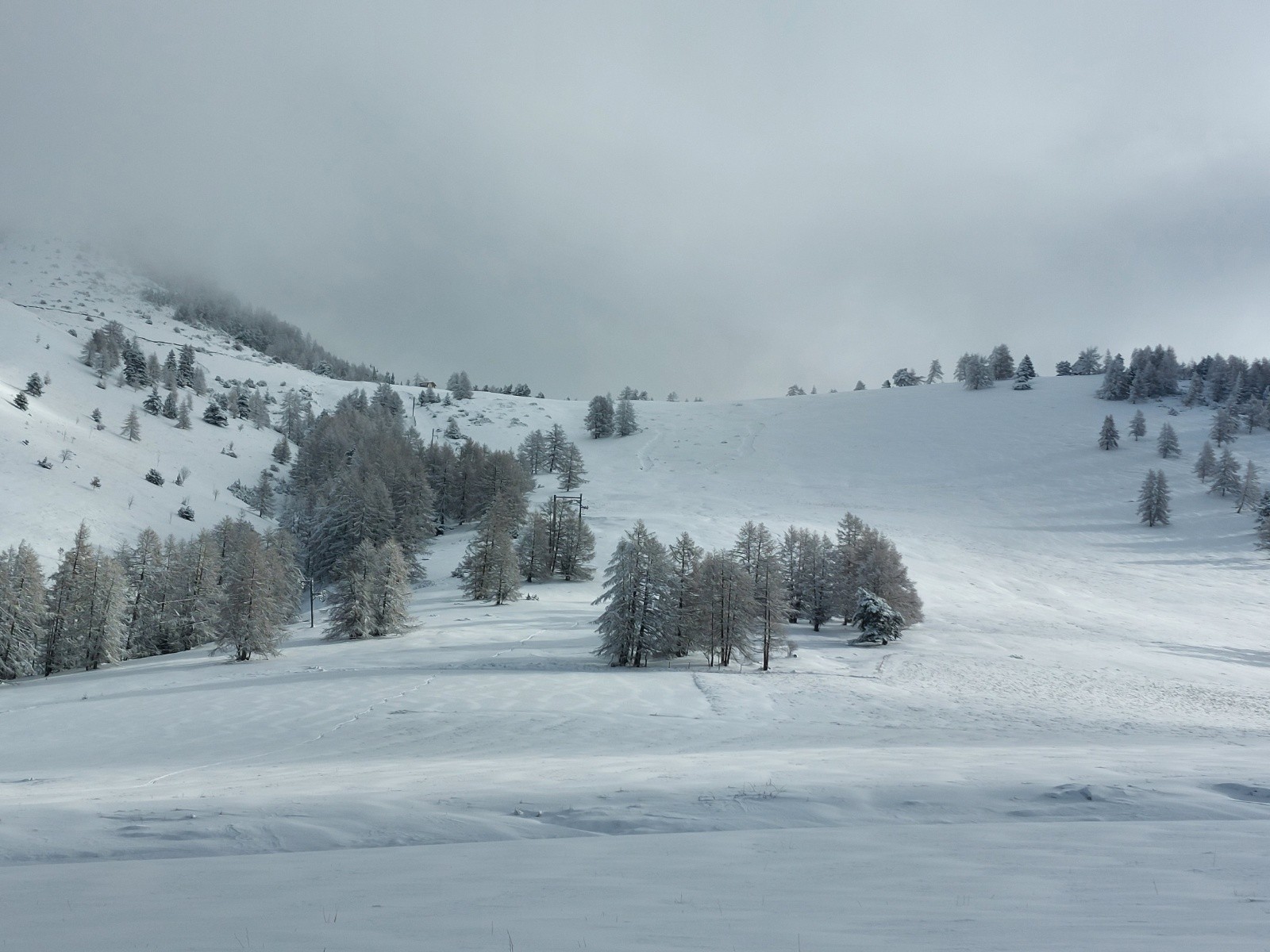 Sans objectif précis ce matin, la neige tombe encore et les routes sont pas top. Je me pose donc a Ancelle où la couche de neige et les Melèzes platrés