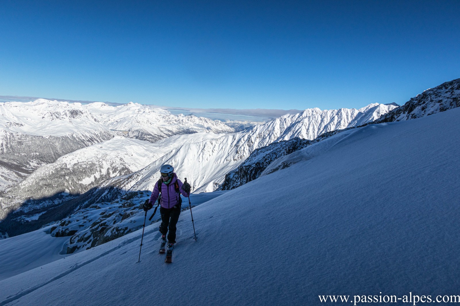 Après une montée glaciale, dans une ambiance un peu austère à cause du froid - mais qui est toujours aussi chaleureuse par la beauté du panorama; nous chaussons donc les skis pour cette belle descente 🤩