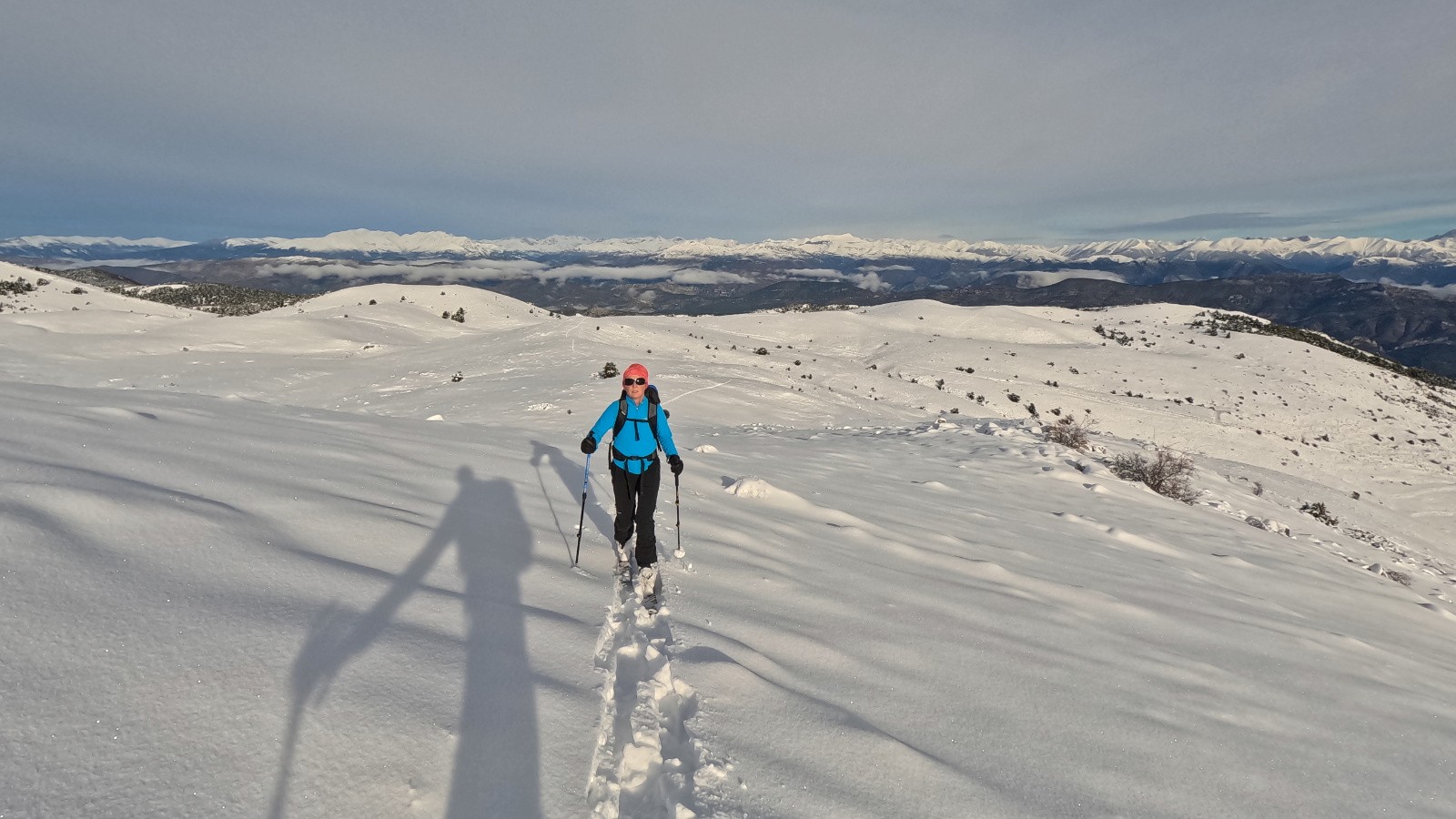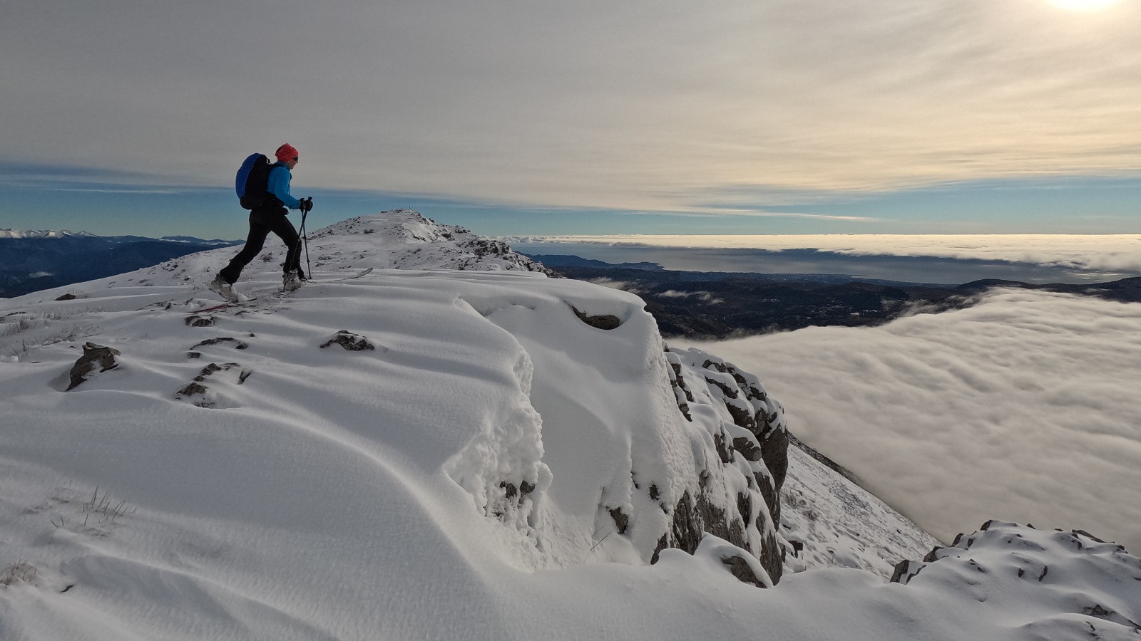 Vue magnifique sur la mer de nuages au-dessus de la Méditerannée depuis la Croix de Verse, on continue par les crêtes jusqu'au Jérusalem où on va déchausser pour descendre en bonne poudreuse au milieu des skieurs qui montent sous un ciel qui se couvre.
