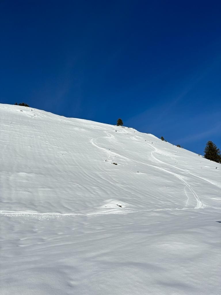 Bim, nous réglons le matos et basculons dans la combe "beber" pour quelques virages de plaisir, que nous déciderons de refaire une seconde fois pour s'assurer de la qualité de la neige.