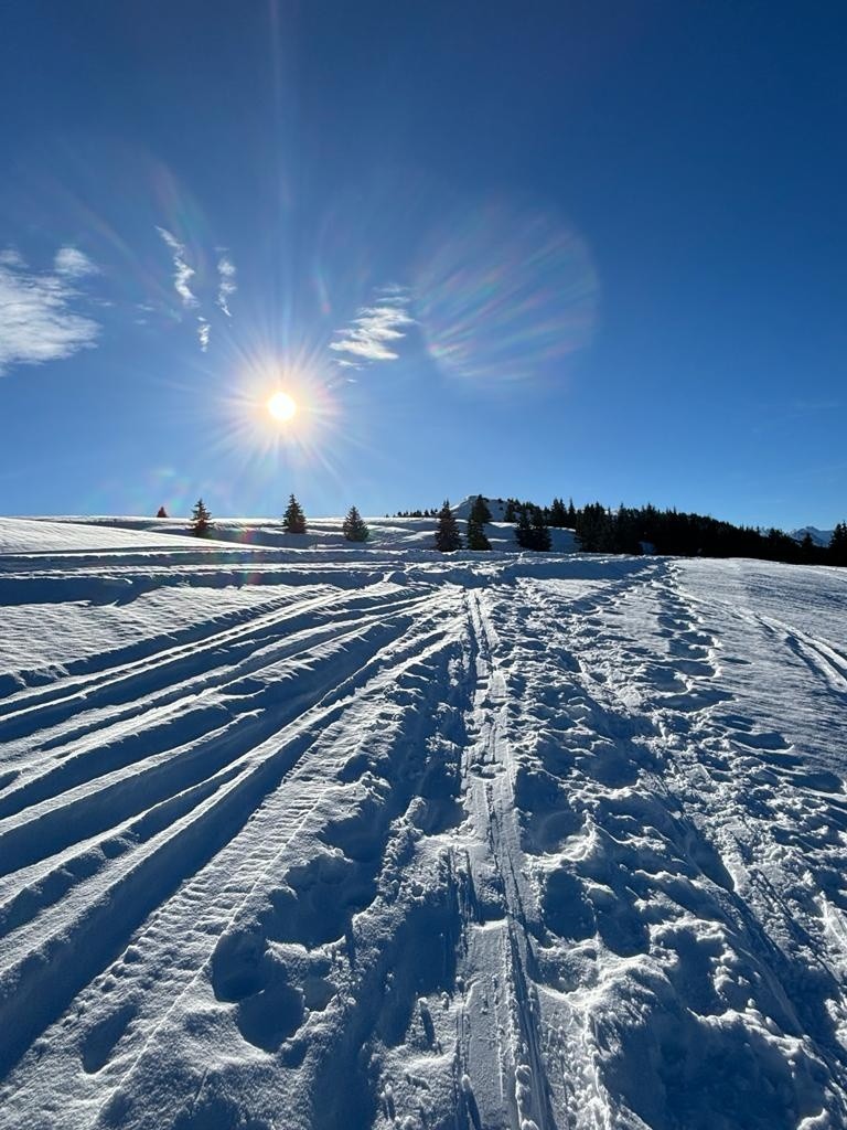 Ah, la montée… Cette ascension qui transforme nos cuisses en acier et notre souffle en fanfare hivernale. Mais ce n'est pas seulement un exercice physique. C'est un moment où la nature s'éveille sous nos yeux, où les sapins s'étirent et où le silence devient une mélodie apaisante (bon il faut également avouer que nous nous rencontrons pas mal de petits groupes de skieurs et de raquettes qui ont eu la même idée que nous).