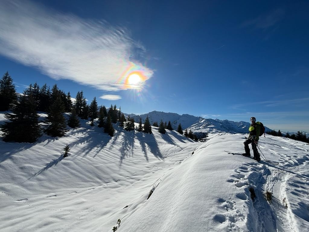 Grand Rocher en vue ! La vue à 360 degrés sur les sommets enneigés de Belledonne, Chartreuse et Vercors à perte de vue, ça vaut bien quelques petits effort, non ? Au vu du monde regroupé au sommet Grand Rocher où tout le monde pose en mode "Je suis au sommet du monde" , nous décidons de continuer notre voyage, le long de la crête, direction "Cul de Pet" à la recherche d'un petit "Drop" versant EST avec vue sur Fond de France.15 min plus tard nous identifions notre bonheur !