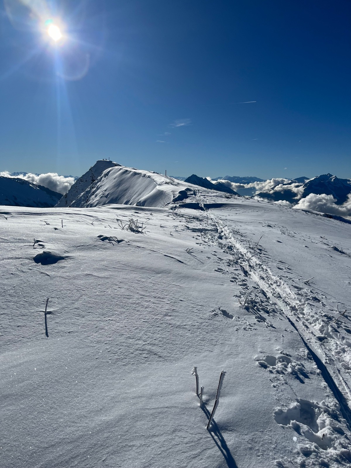 Conditions nivo et activité avalancheuse : Ca soufflait fort sur la crête et générait des petites accumulations. Mais vu le volume de neige à cette altitude... RAS.