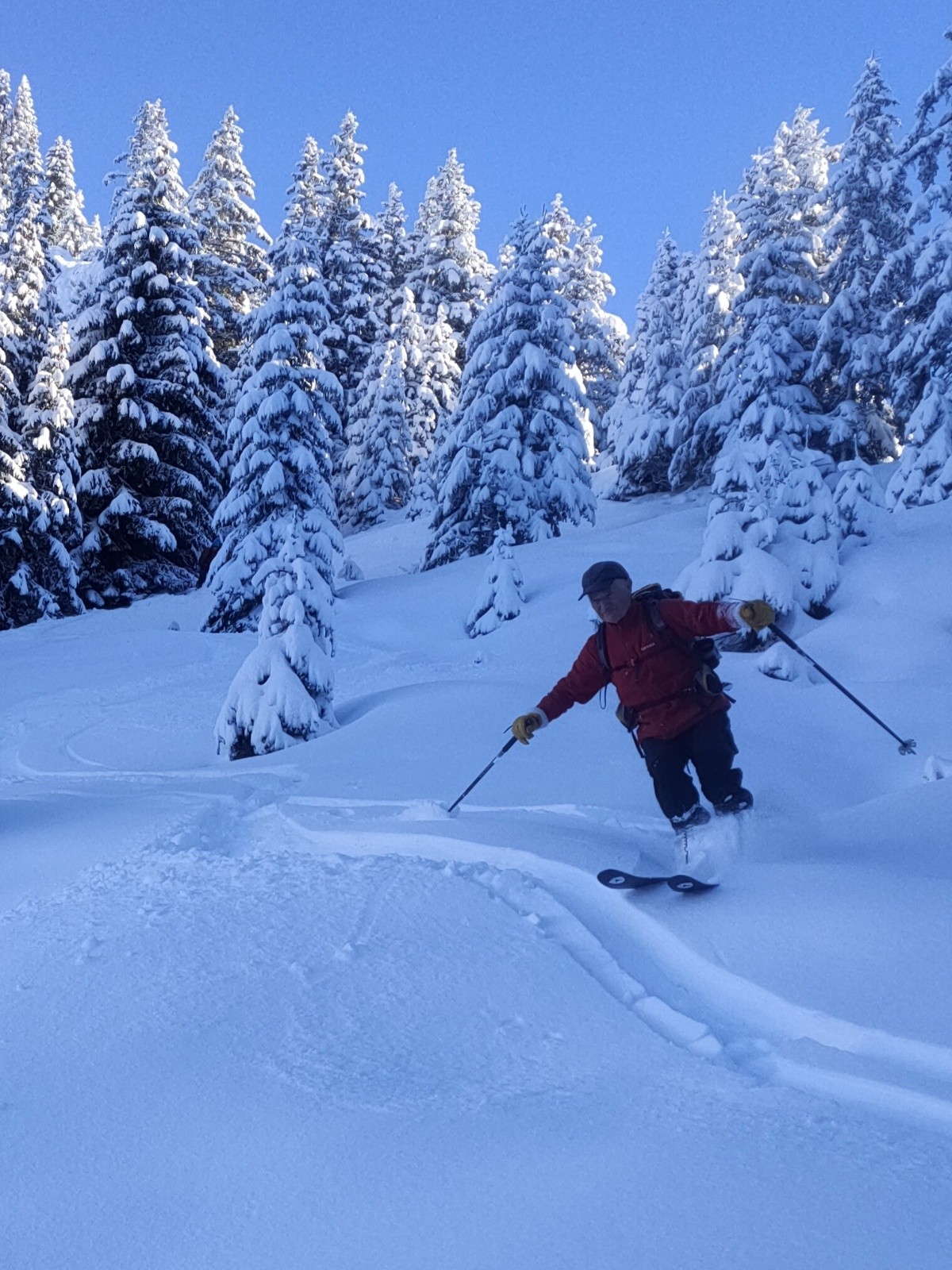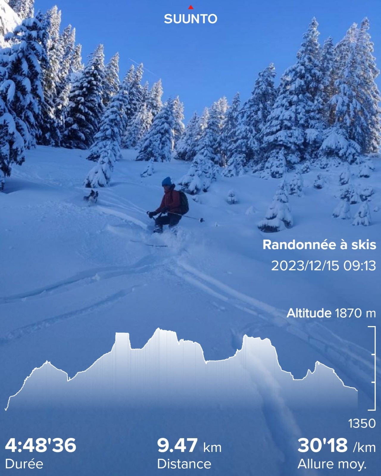 Conditions pour le ski : conditions parfaite à cette altitude il ne faut pas chausser en dessous de 1300 m là où la sous-couche a disparu. Se méfier dans les versions Sud justement par le manque de sous-couche.. j'ai relevé au nord à l'abri du vent à 1650 m 1,50 m de neige. !