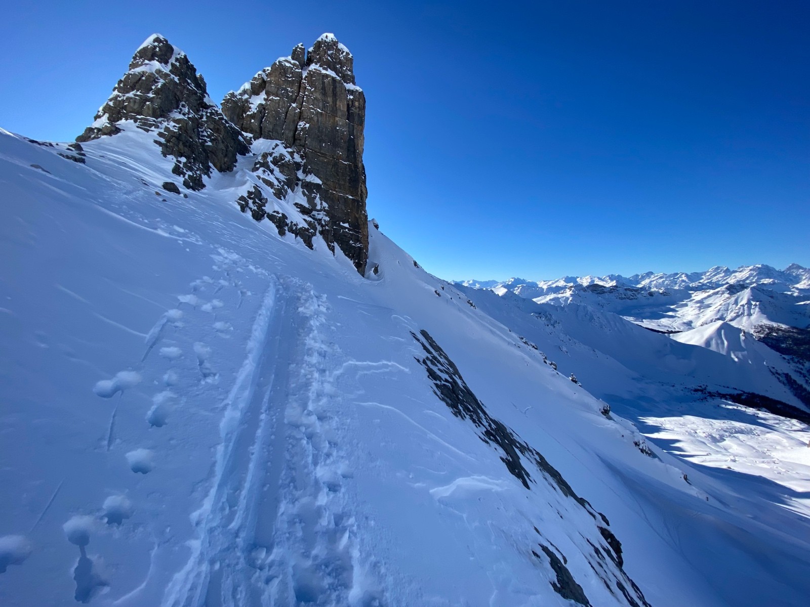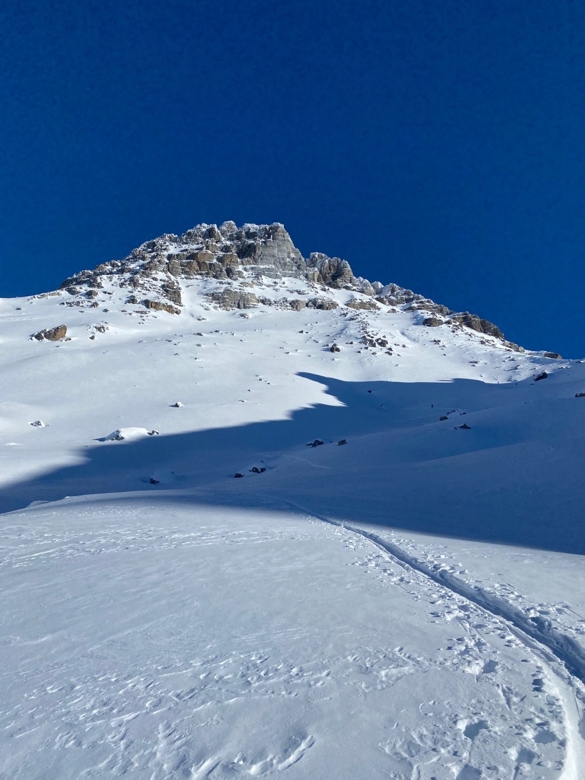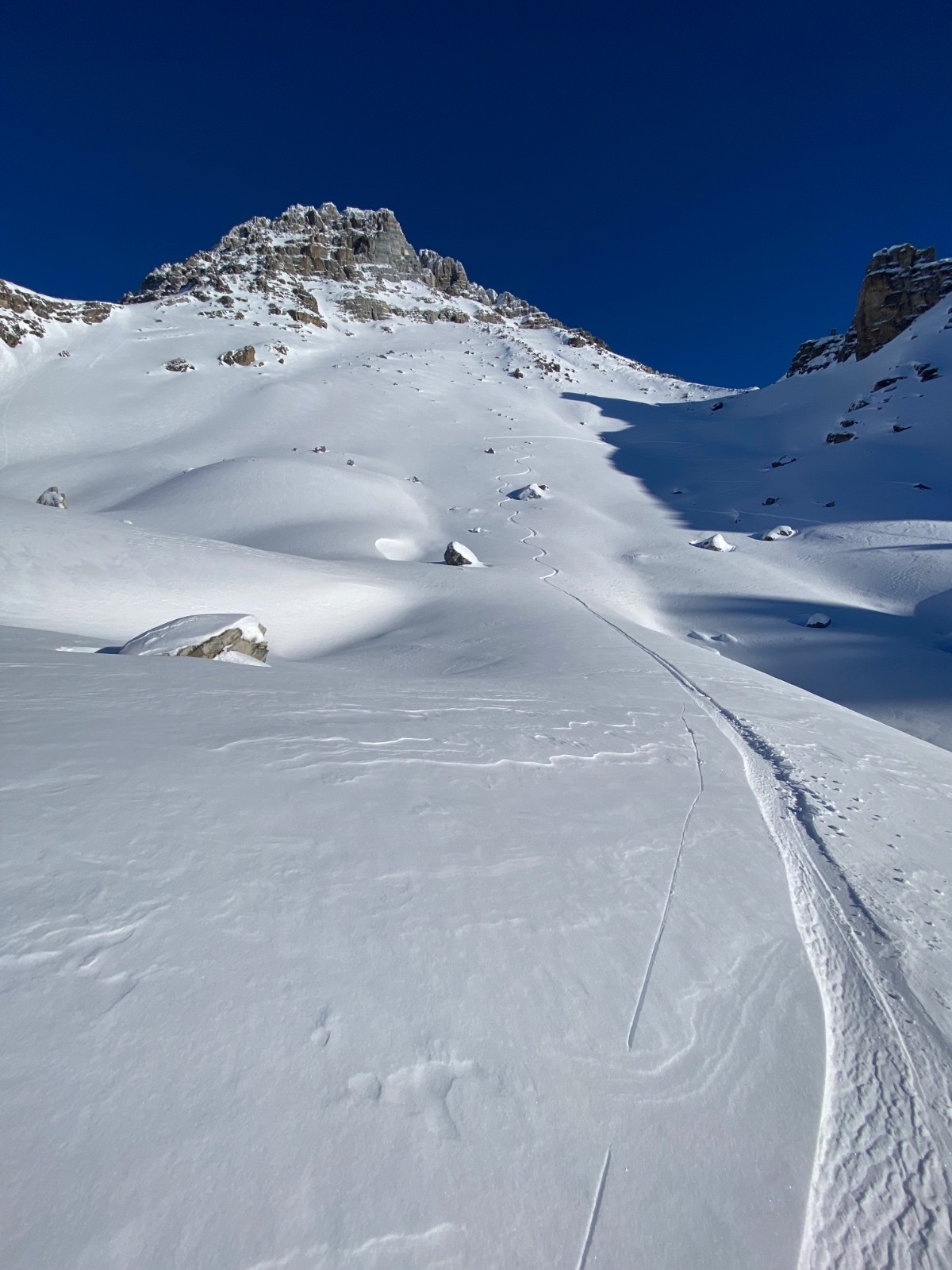 Itinéraire suivi : départ du Laus en suivant l’itinéraire pour Côte Belle, puis bifurcation vers le Col des Portes sur le replat. Montée par le vallon sous le Col en restant un peu à droite dans l’ombre pour avoir une neige fraîche et froide.