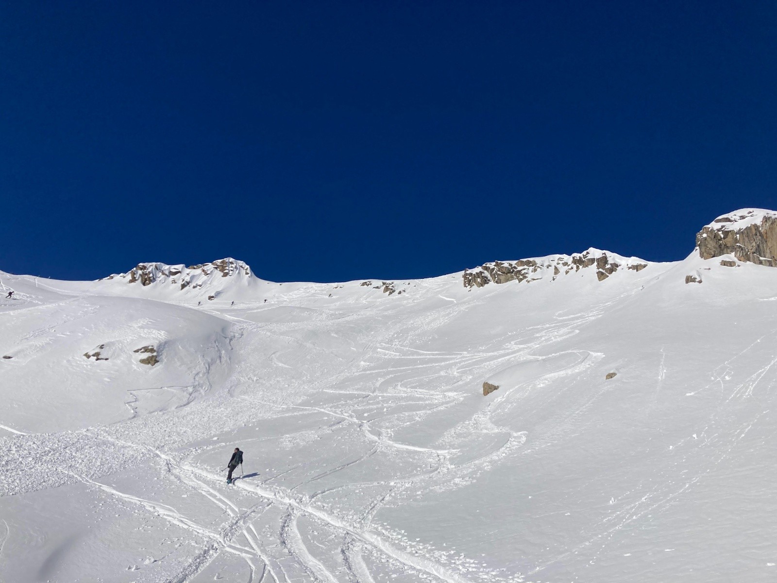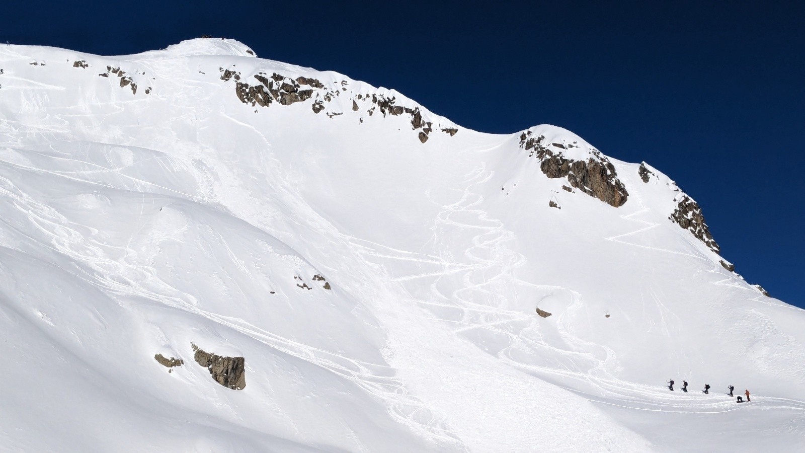 En montant, je repère une petite facette un peu plus raide et vierge sur la droite en montant – je me dis que c’est un possible bon plan de descente car tout le monde redescendra par la trace de montée. [NDLR : en écrivant, je me rends compte qu’a ce moment la, je perds le lien avec mon analyse de qq minutes plus tôt qui me dit qu’il y a un risque de plaque dans cette face pour passer dans un mode ou je commence à considérer dans ma tête qu’il faudra aller vite en skiant ces pentes a la descente mais que ce devrait le faire – je garde une certaine inquiétude pour la descente mais plutôt neige lourde, coulante, sluff-fauchant ; plus du tout risque de plaque]
