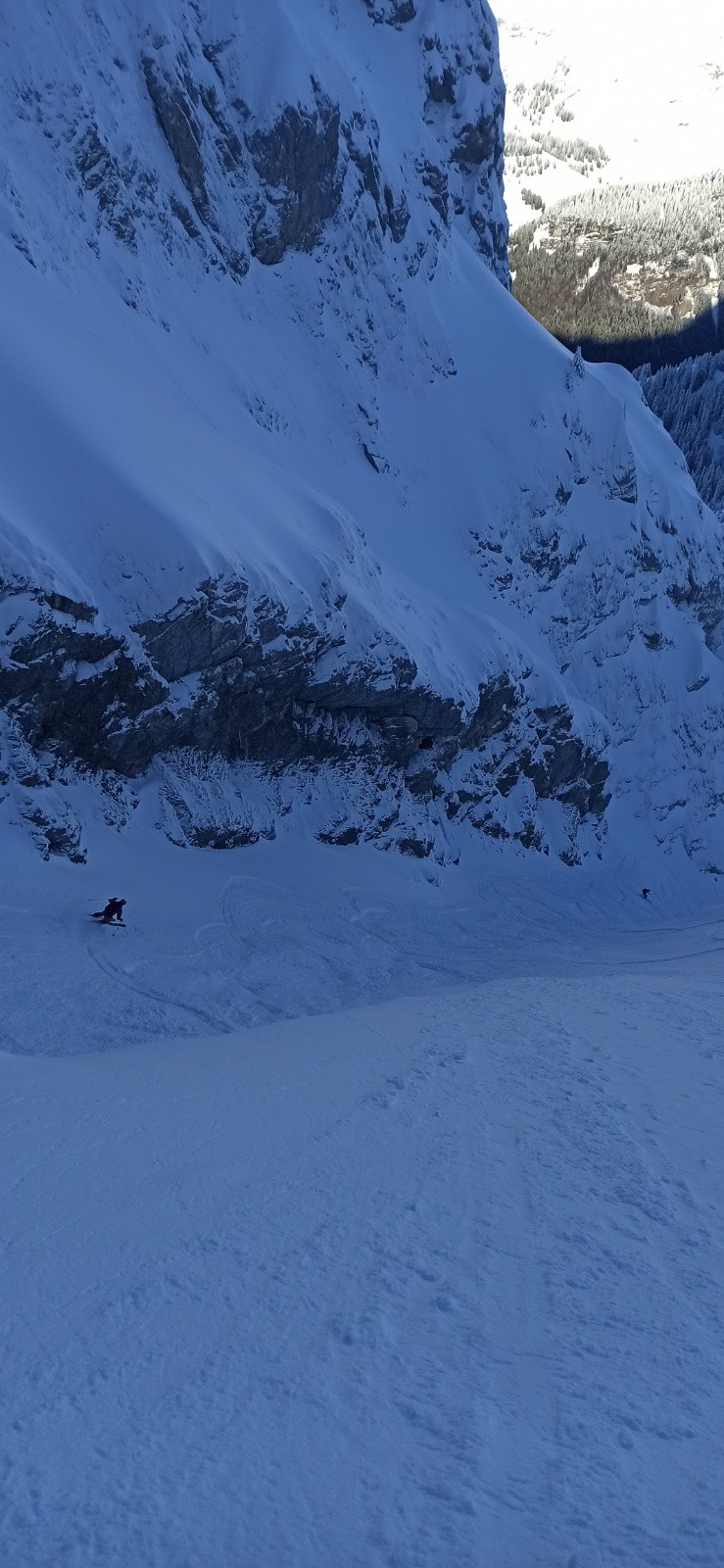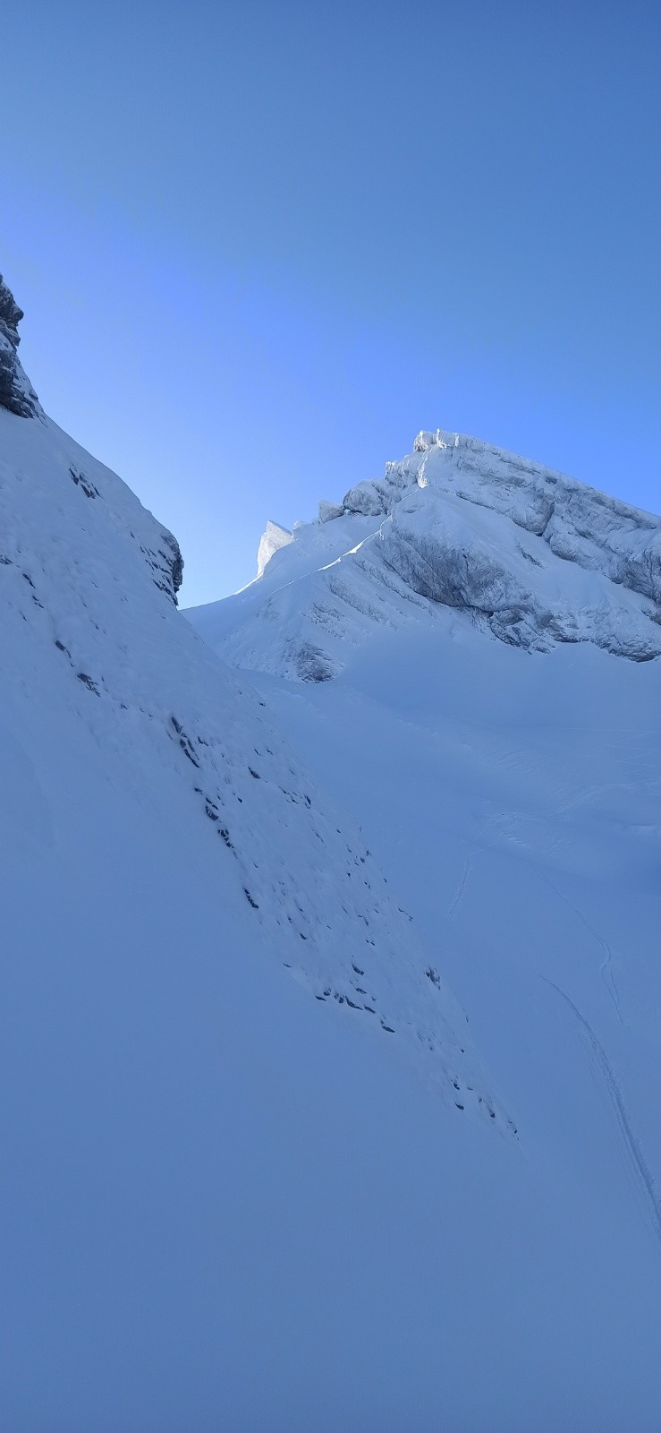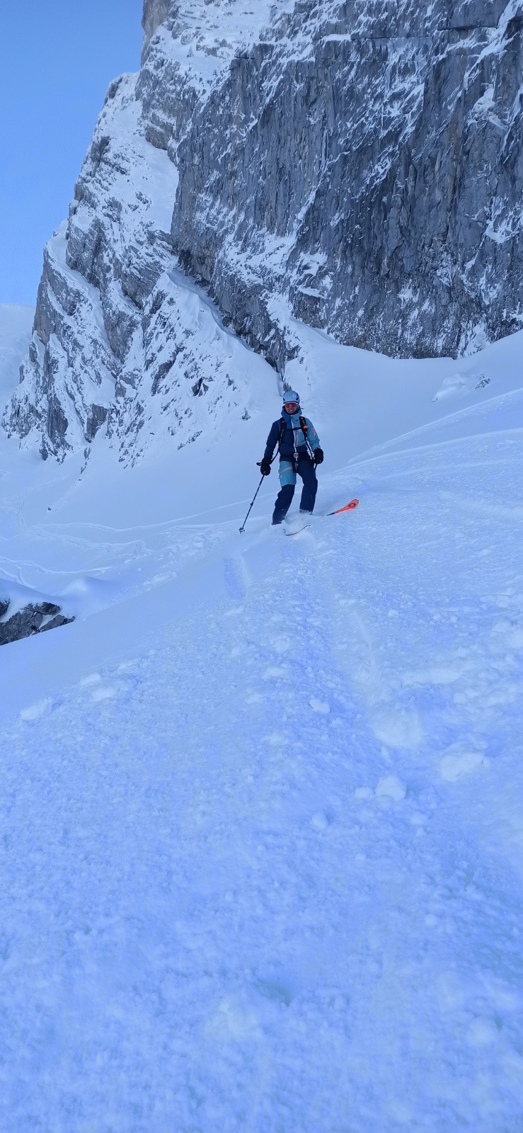 Rando accompagnée de ma fille et de son amoureux, traçage jusqu' a l'entrée du couloir, plusieurs skieurs sont arrivés d'en face, nous étions une dizaine dans le traçage du couloir a la montée . Honneur aux traceurs du jour pour entamé une très belle descente . Rive droite, hors couloir, les rochers ne sont pas loin, attention .