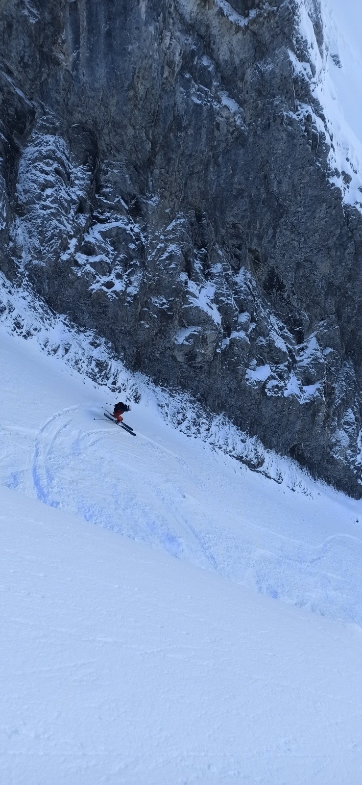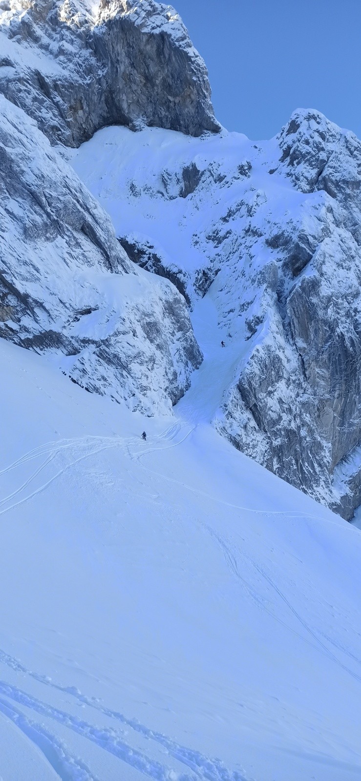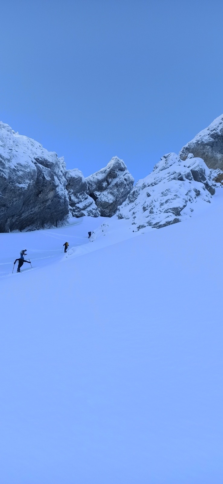 Rando accompagnée de ma fille et de son amoureux, traçage jusqu' a l'entrée du couloir, plusieurs skieurs sont arrivés d'en face, nous étions une dizaine dans le traçage du couloir a la montée . Honneur aux traceurs du jour pour entamé une très belle descente . Rive droite, hors couloir, les rochers ne sont pas loin, attention .