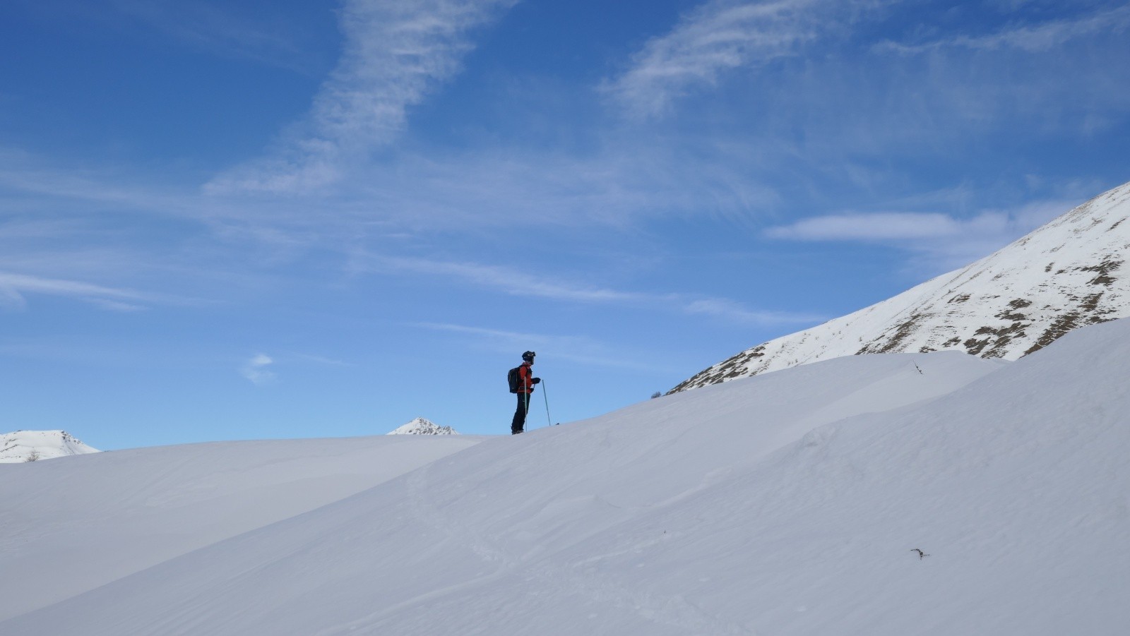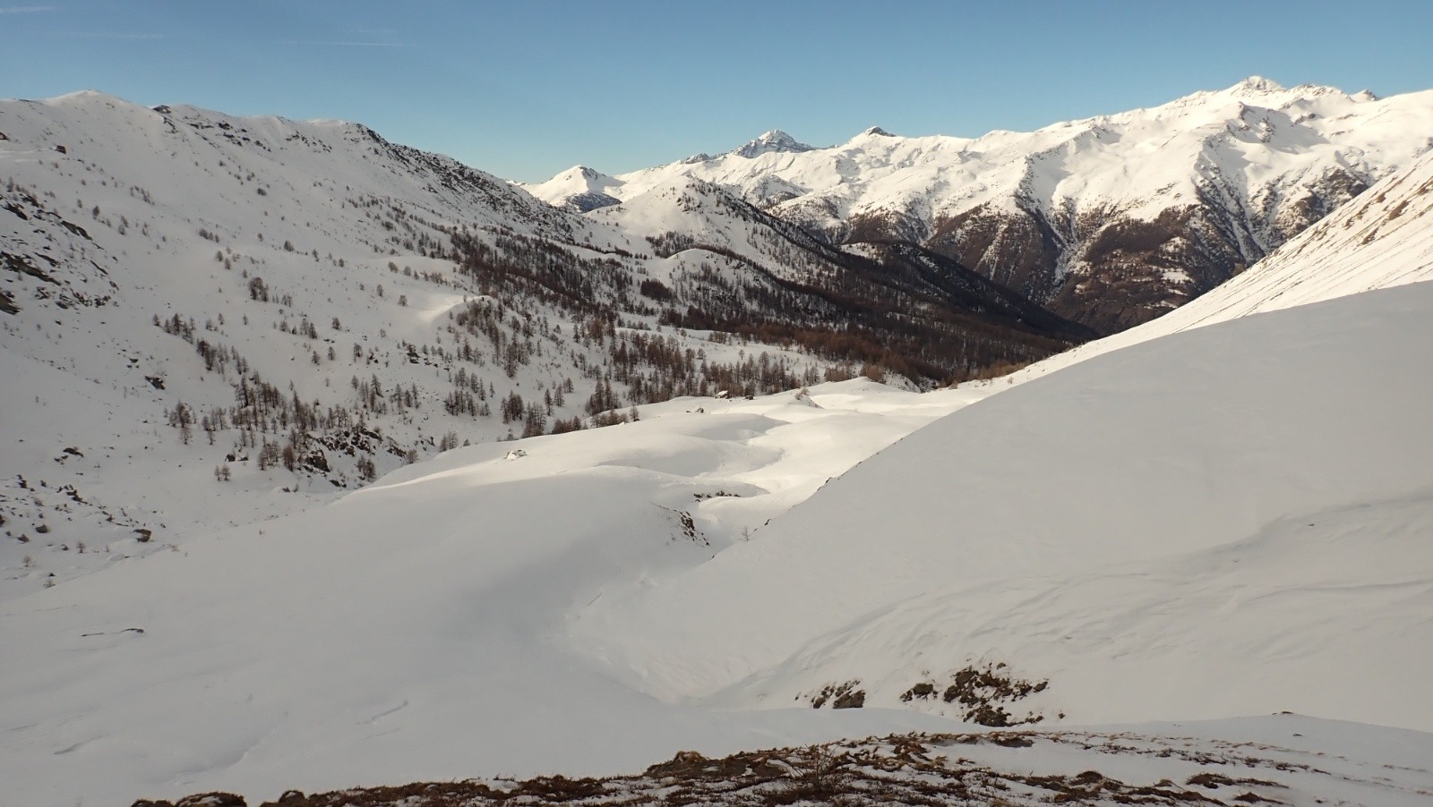 La descente de l'autre côté se fera en mode peu de virage et grande traversée dans une alternance de croûte qui casse et de neige gelée.