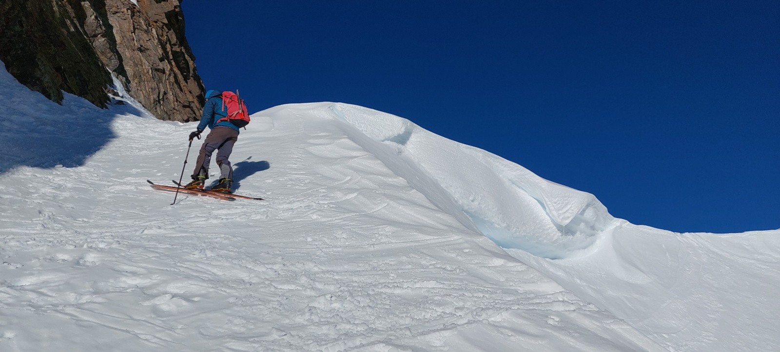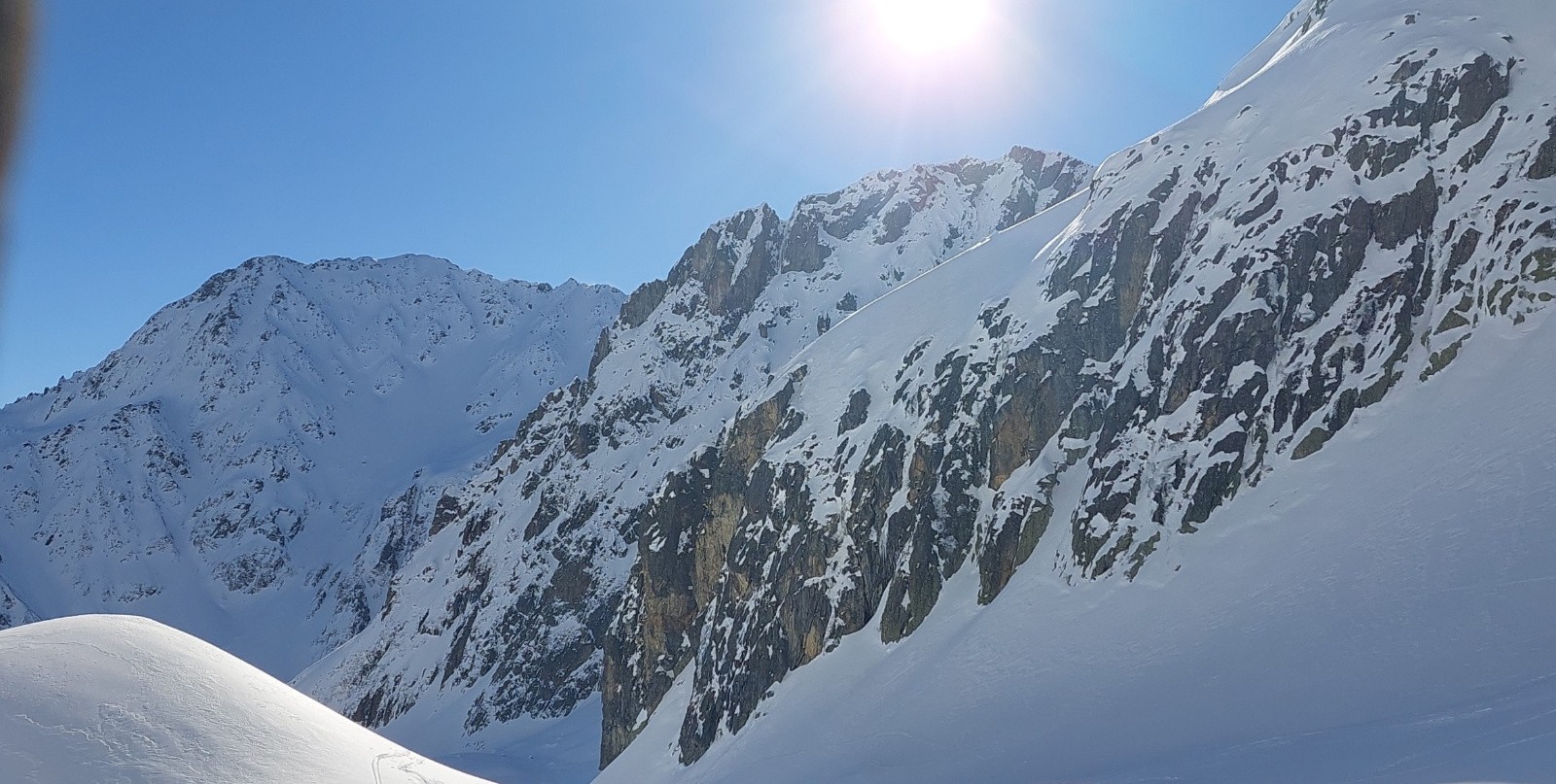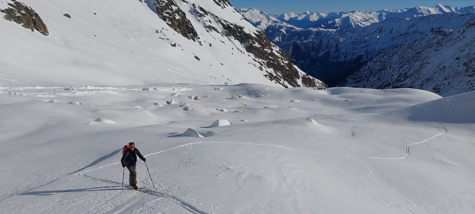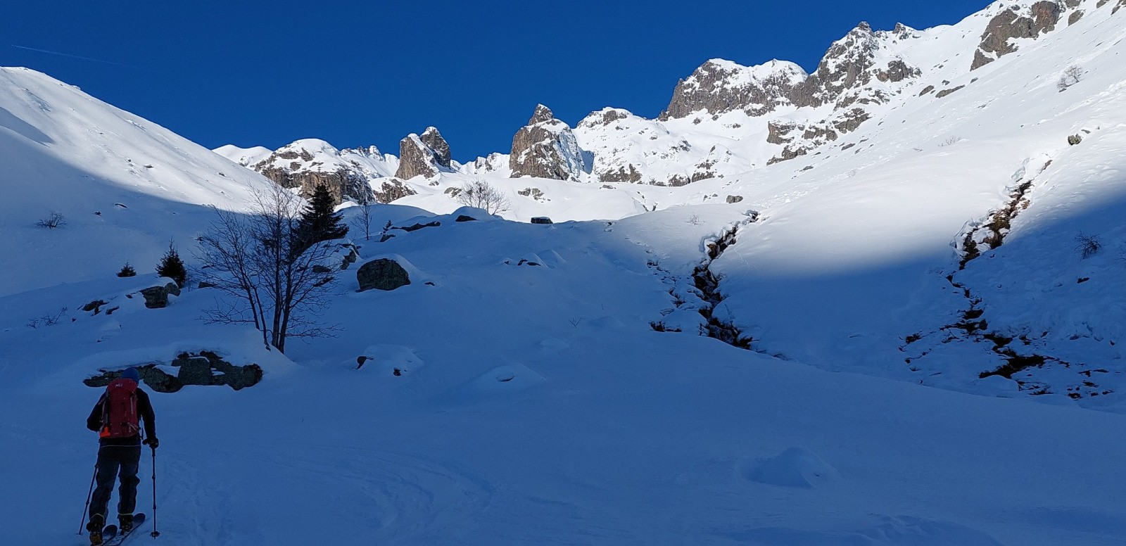 Conditions pour le ski : bonne moquette ou poudre dense >2200, en dessous en E (plus de soleil pour nous en S) correcte en snow mais moins bon en ski un peu carton, border cross neige souple sur les 4/5 du haut, des déchaussages pour passer les nombreux ruisseaux.