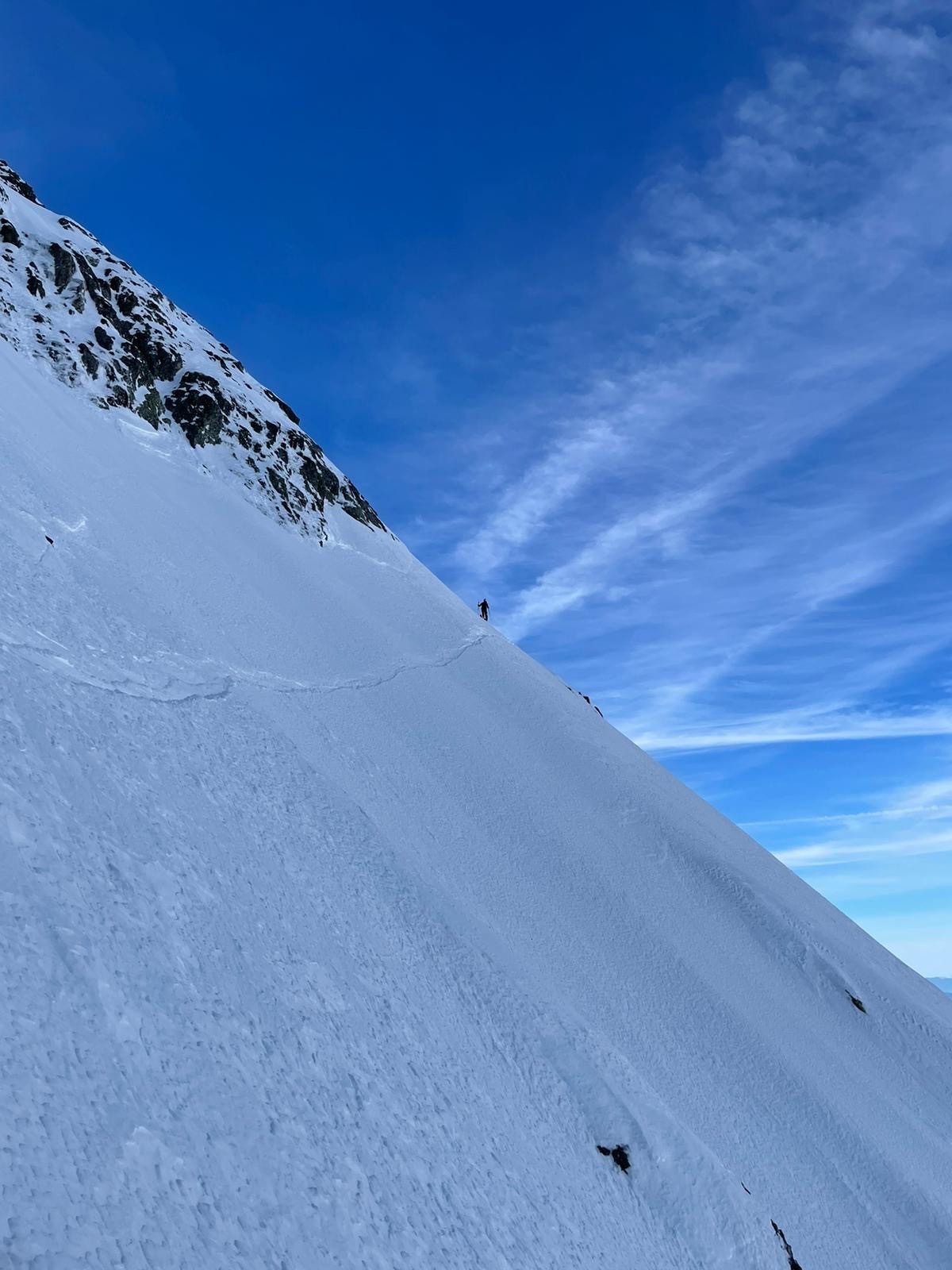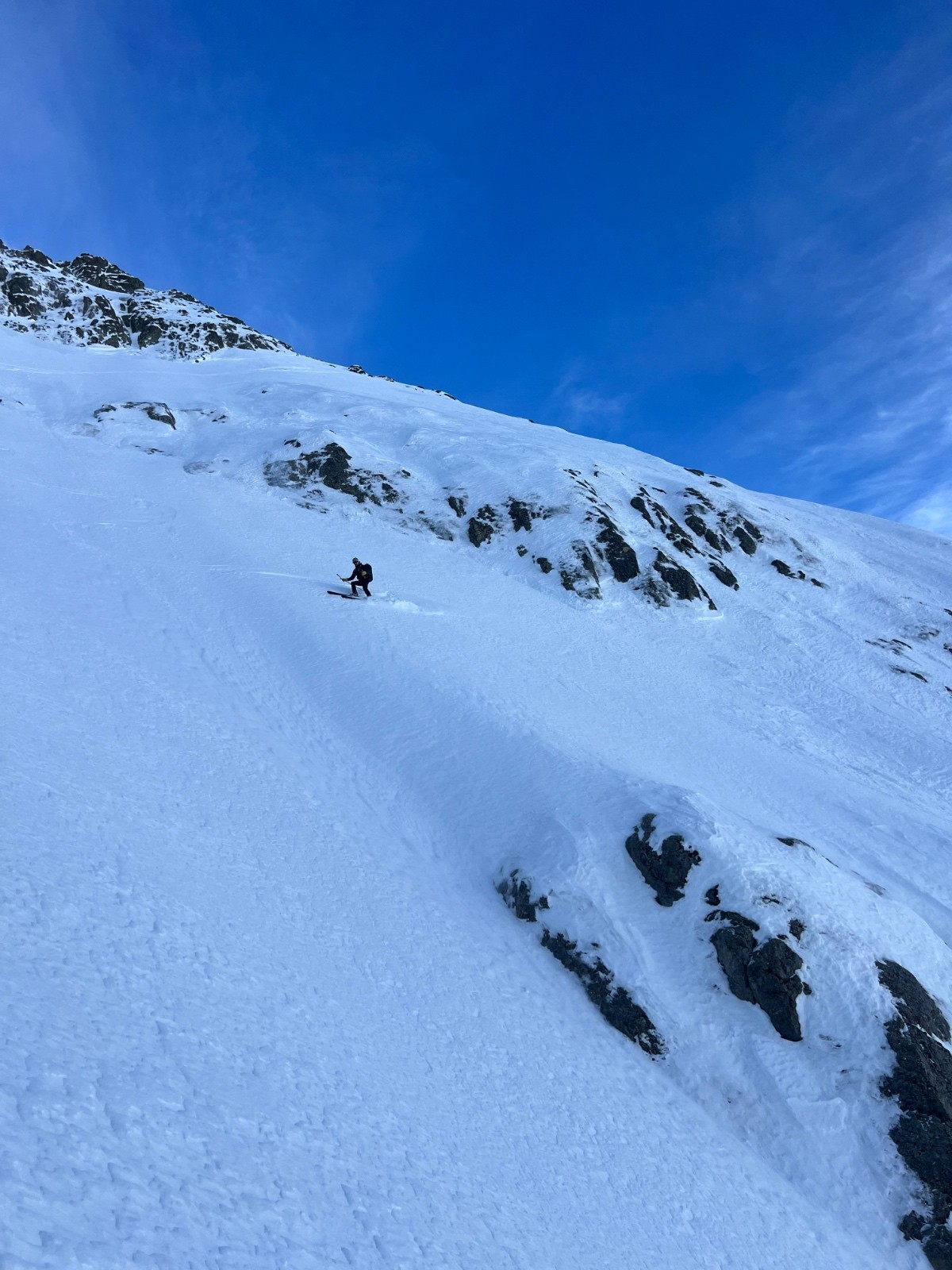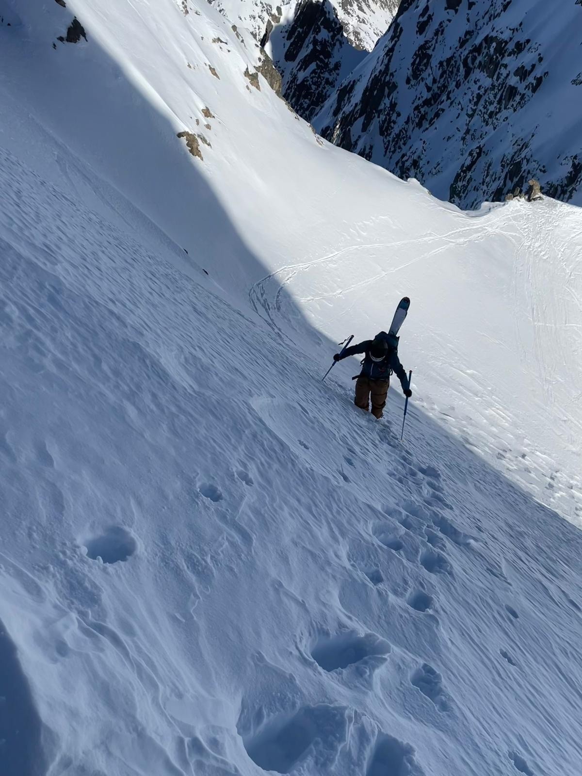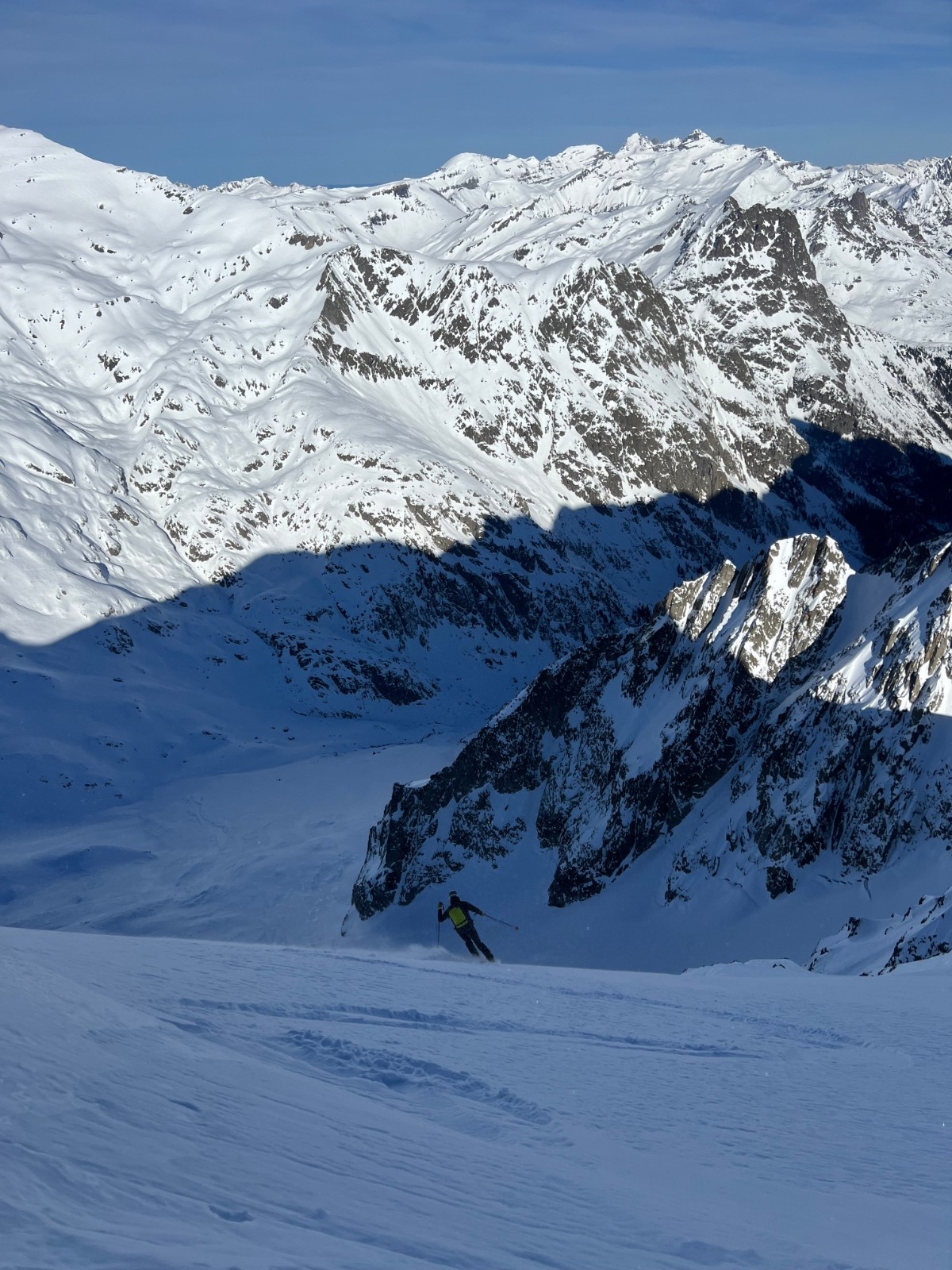 Conditions pour le ski : moquette en sud, petite poudre en nord. Le couloir nord était en super conditions. Pas assez de poudre pour lâcher les chevaux mais super grip dans une fine couche de poudre très agréable. En sud, il est possible de trouver de la bonne moquette, attention à quelques zones de neige carton