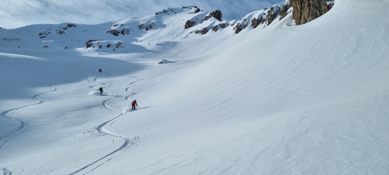 Conditions pour le ski : 30 cm sur fond dure, poudreuse un peu lourde du fait des températures douces et du travail du vent