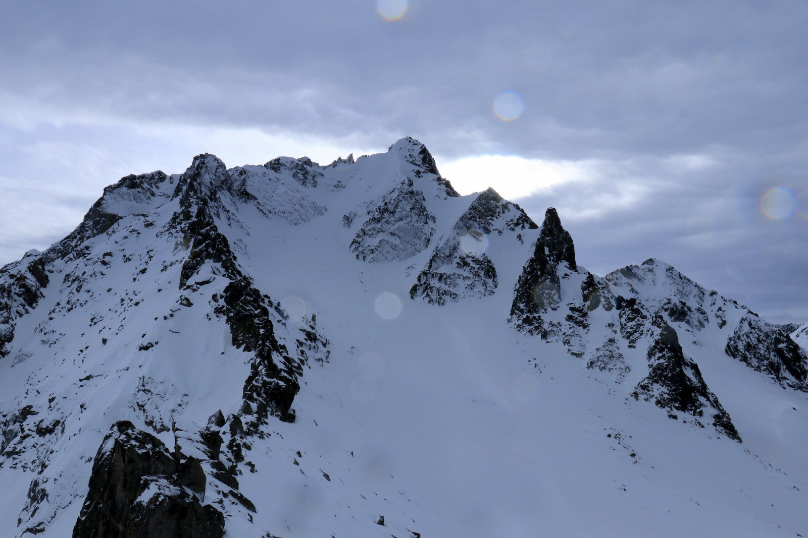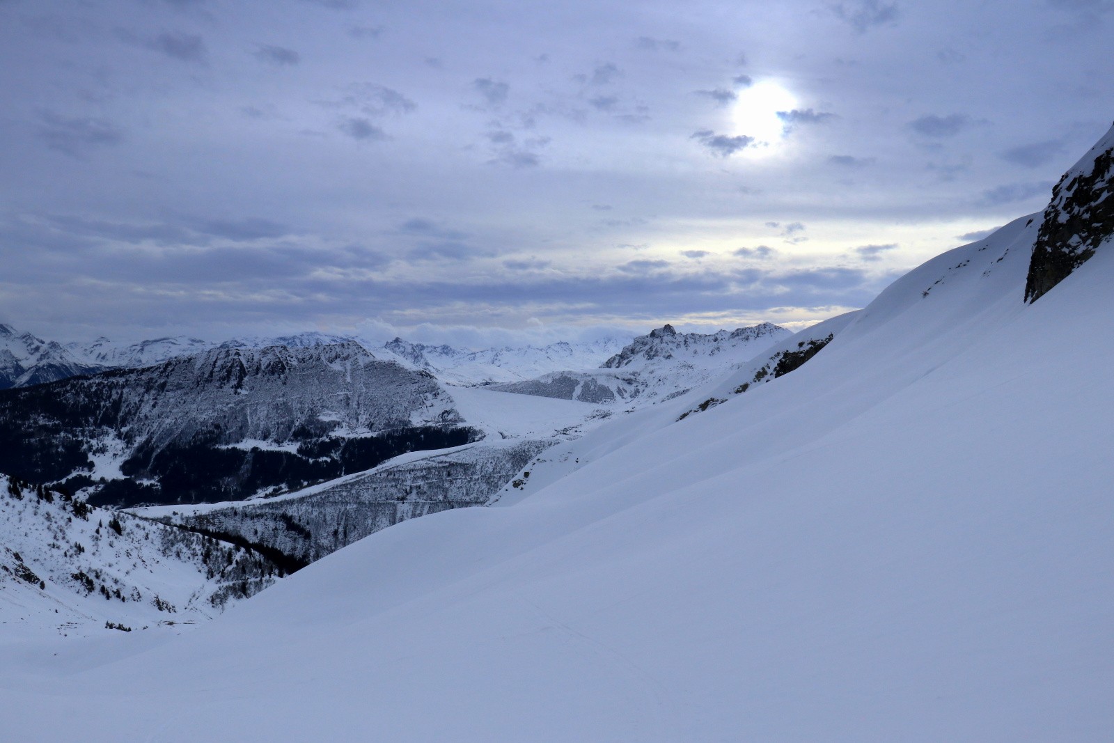 Conditions pour le ski : neige légèrement croutée sous le col entre 2500 et 2400. Poudreuse sur fond dur jusqu'à 1900. Gelée plus bas