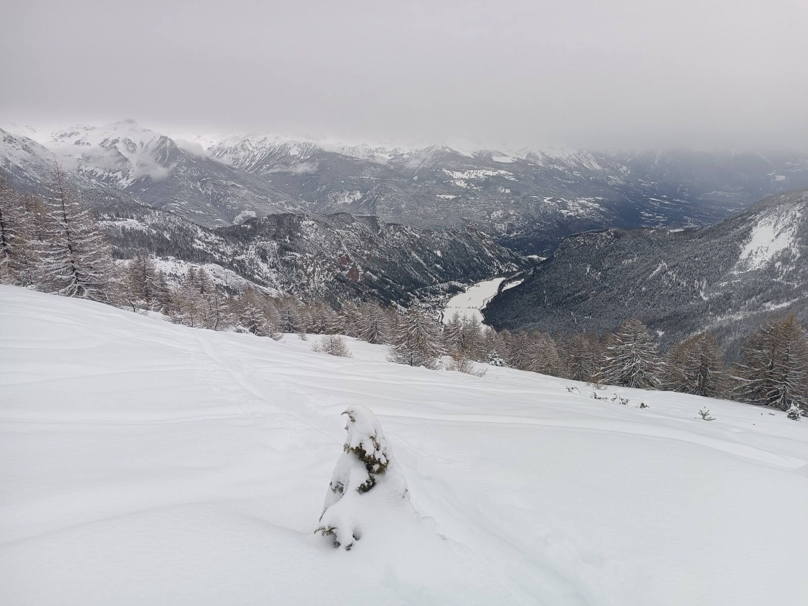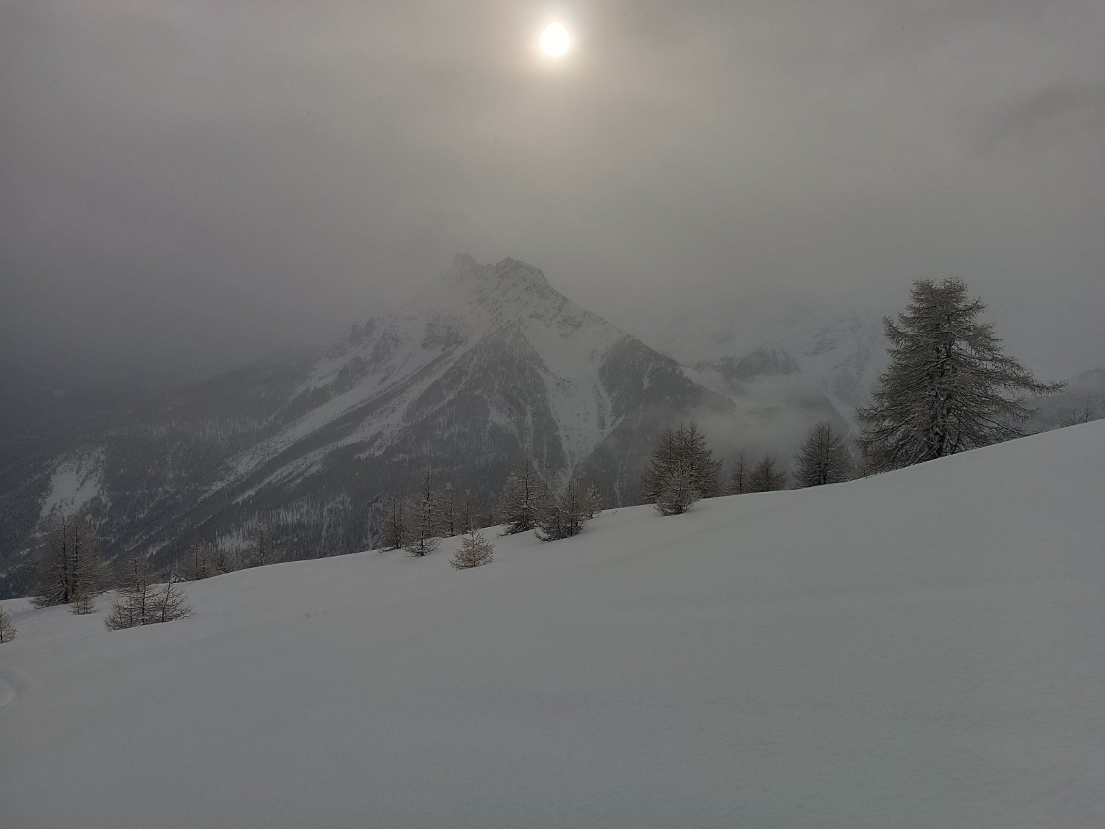 Météo/températures : couvert, neige faible, -1°C à 1400m, -4 à 2300. Bonne visibilité car plafond élevé ; l'altostratus laissait filtrer par moment un faible rayonnement solaire.