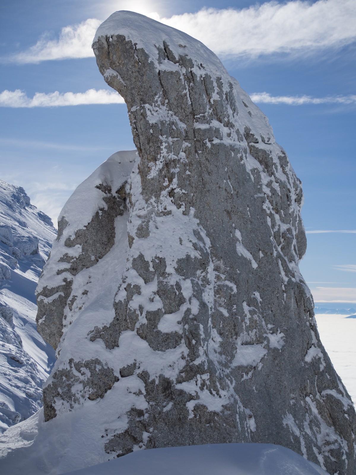 Au départ tout est conforme, 100m de d+ et hop au dessus des nuages, grand soleil au col des Ayes la journée s'annonce bien ! Le pas de l'oeil passe nickel sans voir un cailloux avec une neige qui semble sympa, par contre plus bas la sous couche manque un peu par endroit et c'est soufflé un peu mais bon là n'est pas le programme... On monte donc doucement direction la croix au sommet de la dent, une première sur les skis tant ça manque souvent de neige en plein sud par ici.