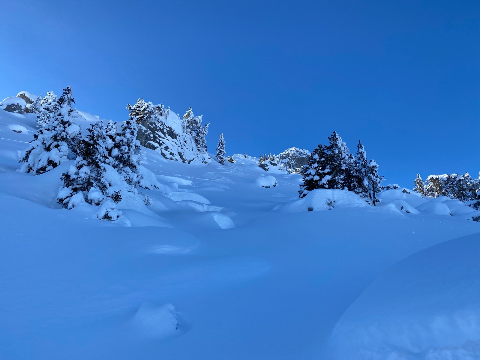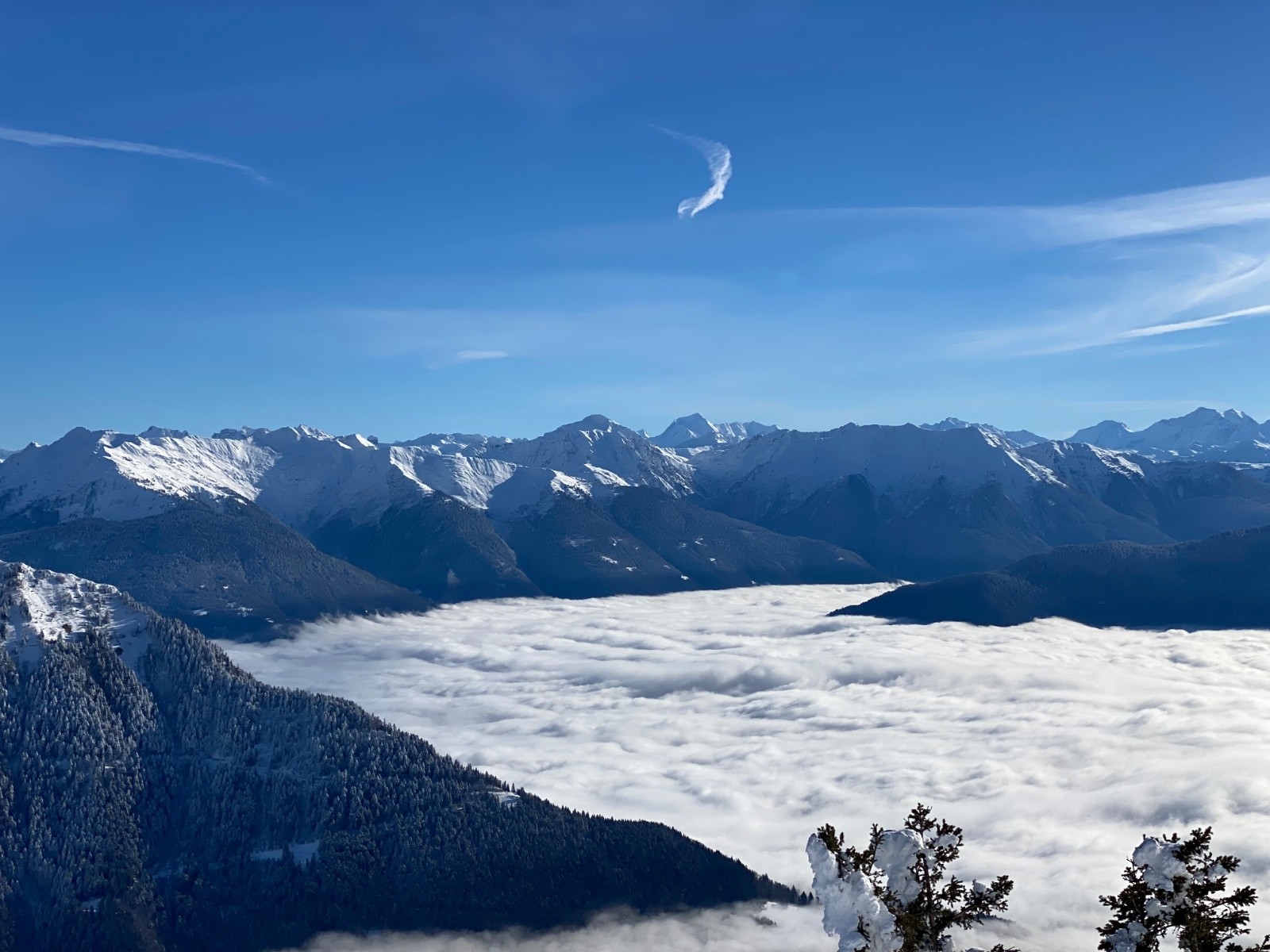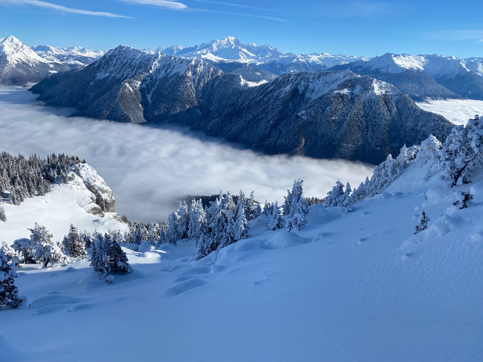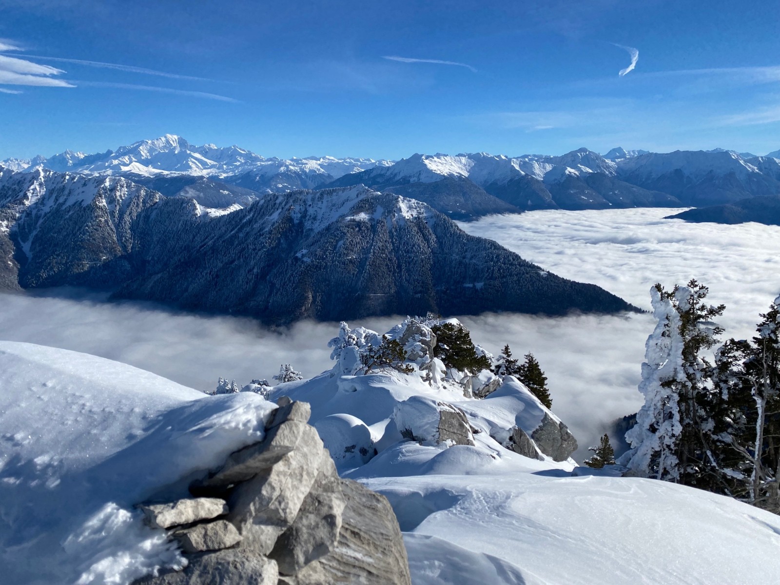 Bon , le plan échafaudé, partir de 900m, c’était osé…mais cet ascenseur par les Chaffauds m’a offert une belle rando nordique et je n’ai porté qu’à la descente ( 250m de D- environ ). Et puis, L’échafaud, ce n’est pas que pour les condamnés, c’est aussi synonyme de plateforme, et la mienne m’aura offert des points de vues à couper le souffle, au dessus d’une belle mer de nuage, dans un coin sauvage loin des pentes de la petite Sambuy sur tracées ! Cette croupe NE de la bouchasse, avec ses pins plâtrés, m’aura offert le calme et la sérénité, et le plaisir de faire sa trace.