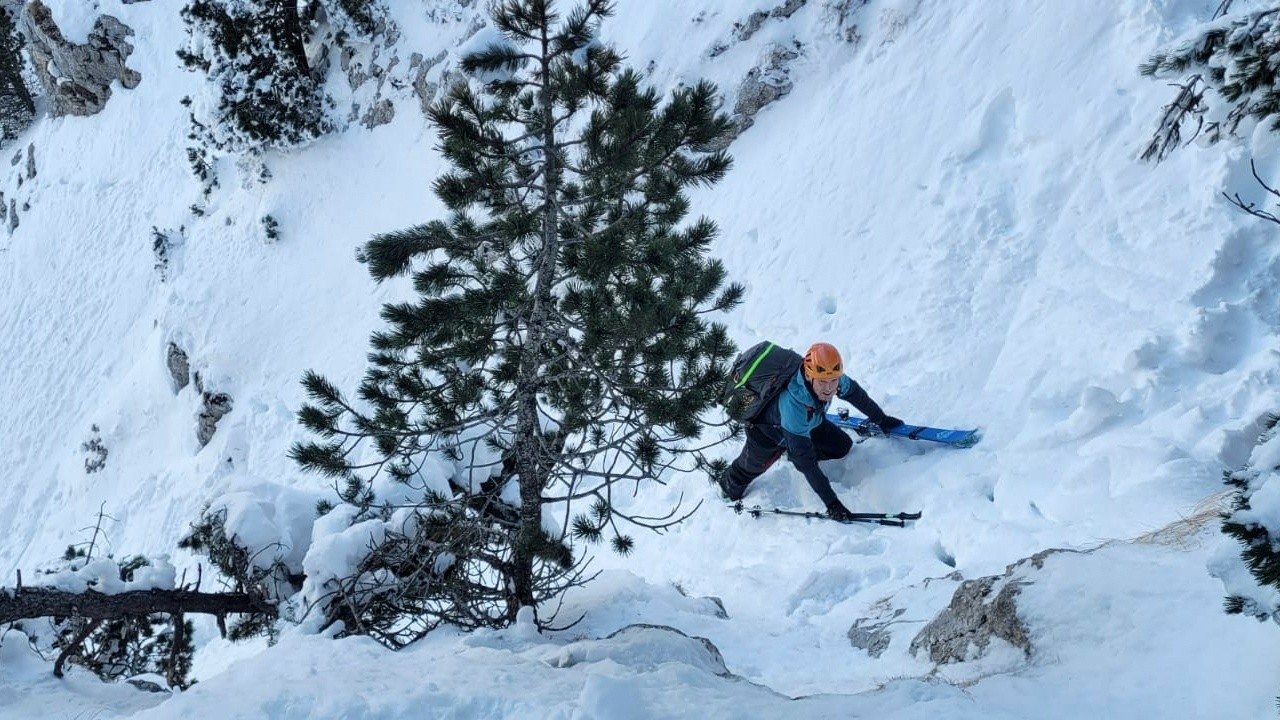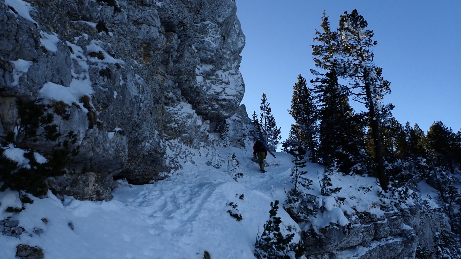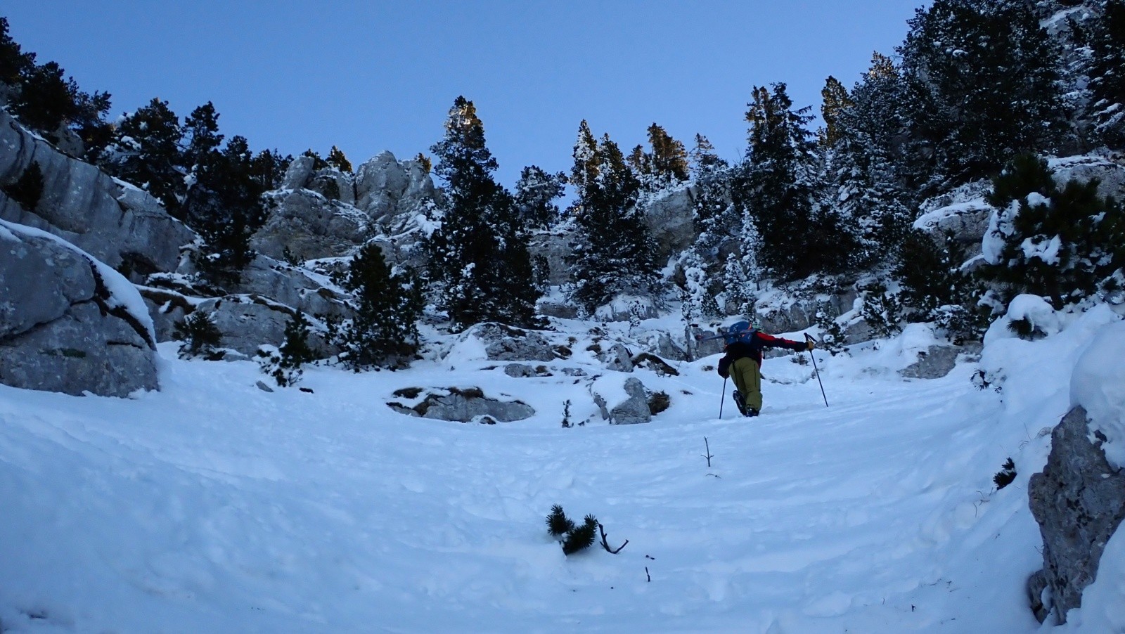 Conditions nivo et activité avalancheuse : stable, très peu de neige dès la grotte Colon en S et SW, c'est pourquoi on a basculé en NW en dehors de l'itinéraire théorique. C'est plaquée dans le couloir en NW, mais ça tient !