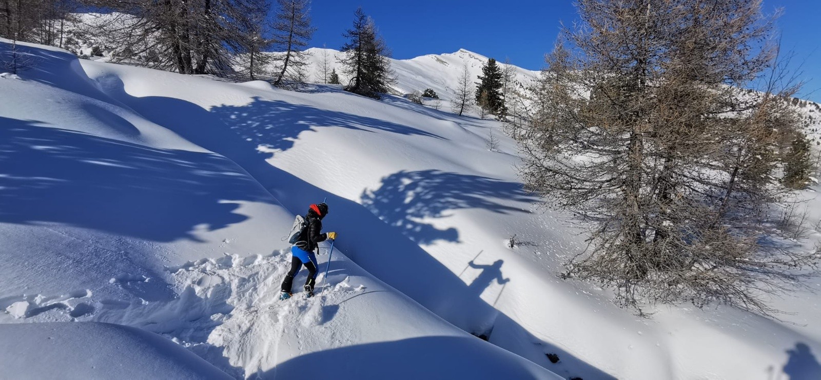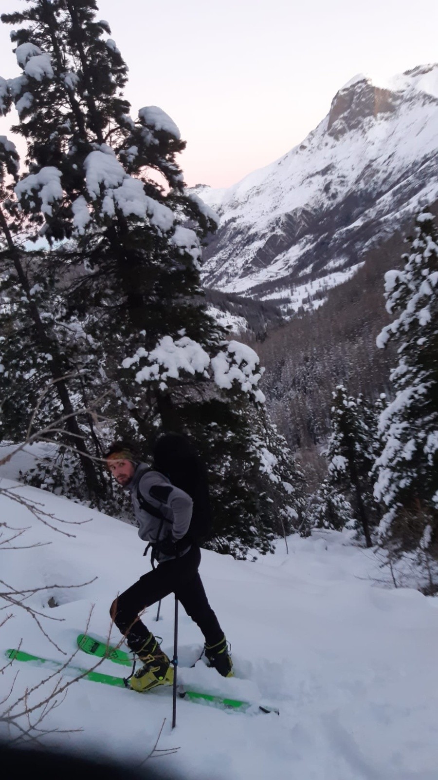 Nous commençons donc à enquiller la longue approche vers plan bas de nuit, continuons vers les aux tortes rive droit, sans suivre le chemin d'été. Le jour se lève et quelques zones ouvertes dans la forêt nous permettent d'admirer la petite séolane dans l'heure bleue.