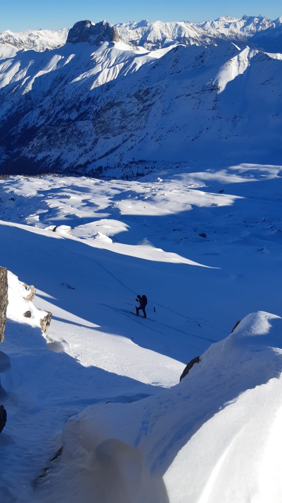 Conditions pour le ski : dégueulasse sous 2000/1900, excellente (15cm de poudre légère) dans les combes très abritées et mélézins, mélange de poudre,, carton, quelques pièges de glace, et poudre tassée ailleurs. j'hésite à mettre "bonne" skiabilité pour les excellentes sensations dans les belles pentes ombragées, mais ça fait environ le quart de notre parcours, alors pour l'ensemble on restera gentiment sur "correcte".