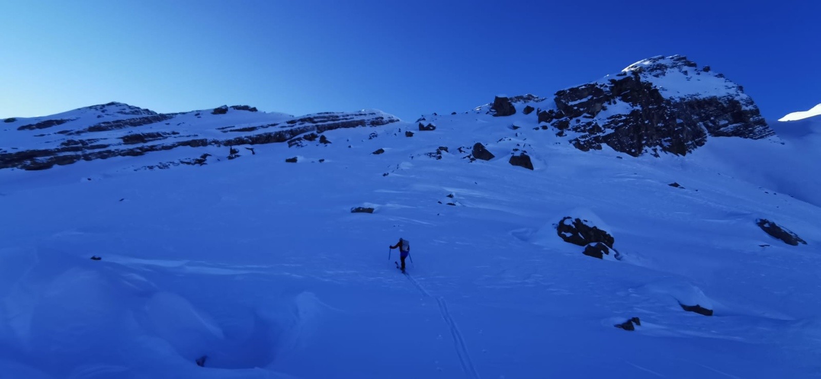 Une remontée sur plan gautier avec l'intention de remplacer la tête de chabrière par le pic de l'aupillon, sinon nous ne serons jamais rentré dans les temps. on commence à être un peu fumés et vincent botte puis voit ses peau se décoller.