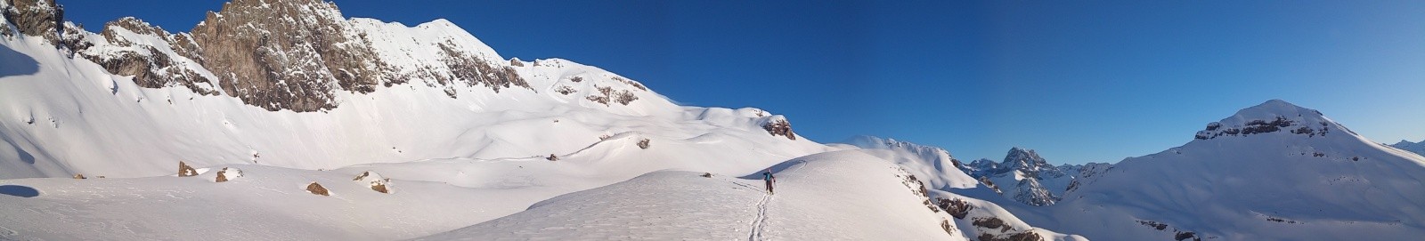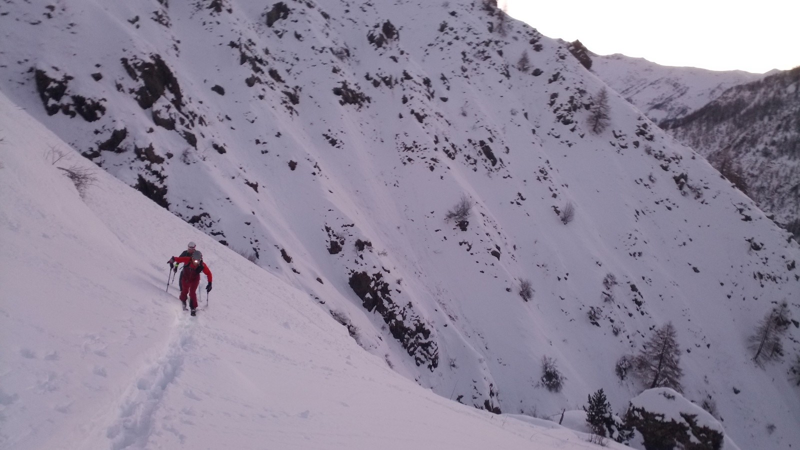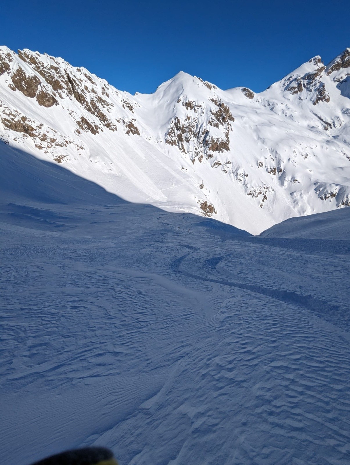 La montée au refuge du Tourond est magnifique dans cette neige fraiche, puis une belle trace nous emmène au col des Moutières. Pas de corniche. La décente est excellente dans une poudreuse qui commençait à être travaillé par le vent. Nous avons pris la combe de droite en longeant la plaque partie (surement liée à une rupture de corniche plus haut)