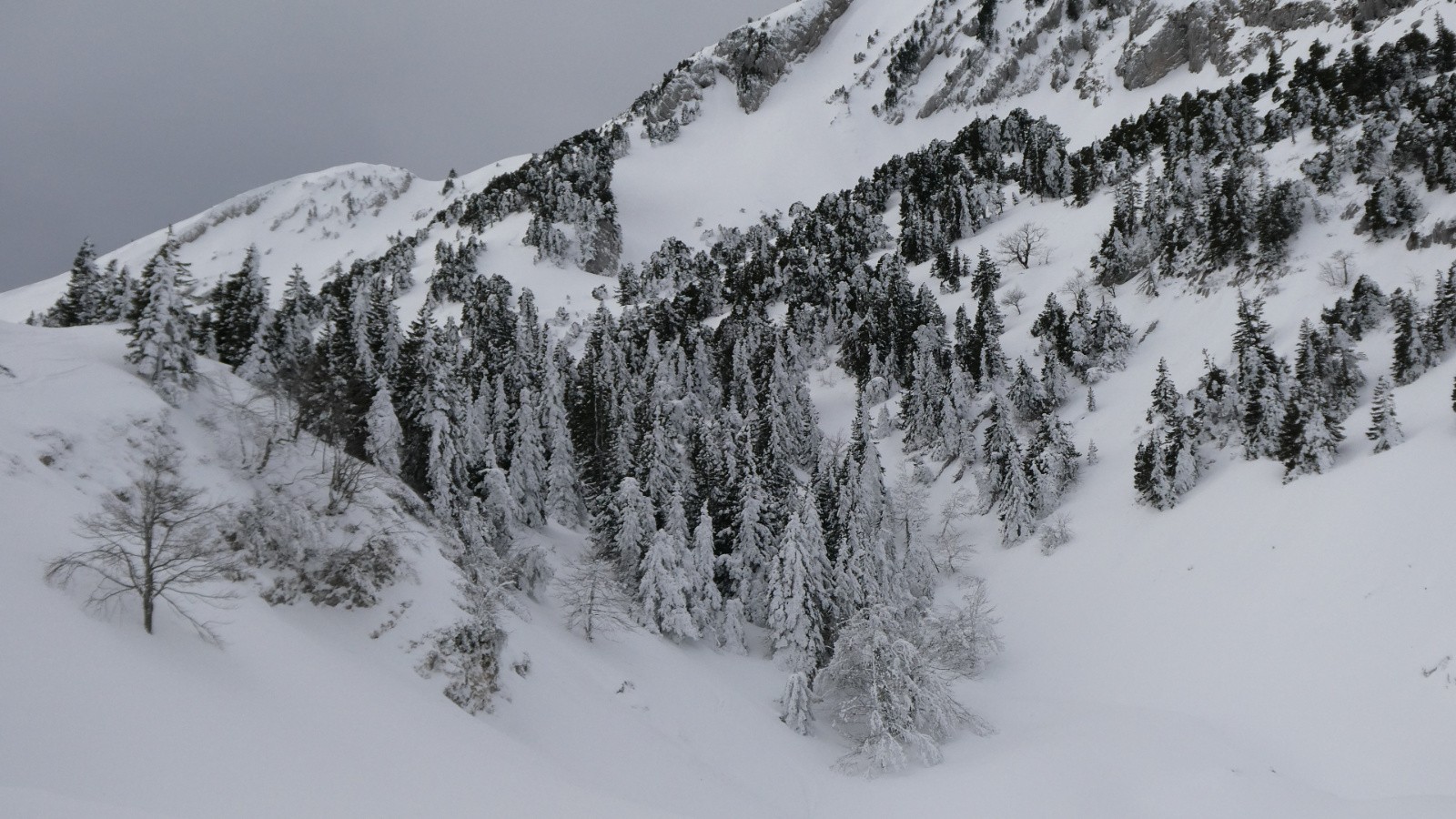 La seconde fois où j'ai serré les fesses, c'est au Cul de Lampe. Ne me croyez pas soudainement devenue vulgaire ! J'ai déjà eu l'occasion d'expliquer ce qu'est un cul de lampe : c'est un ornement architectural, sur un pilier dans une église. Mais ornement architectural ou non, autant l'arrivée au lieu dit Cul de Lampe a été relativement aisée, autant la traversée en montagne russe jusqu'à la forêt ne l'a pas trop été. Une pente lisse de poudre profonde rapportée. Mais quoiqu'il en soit : rien n'a bougé. Il était sans doute écrit là-haut qu'aujourd'hui ne serait pas encore le point final. Amen.