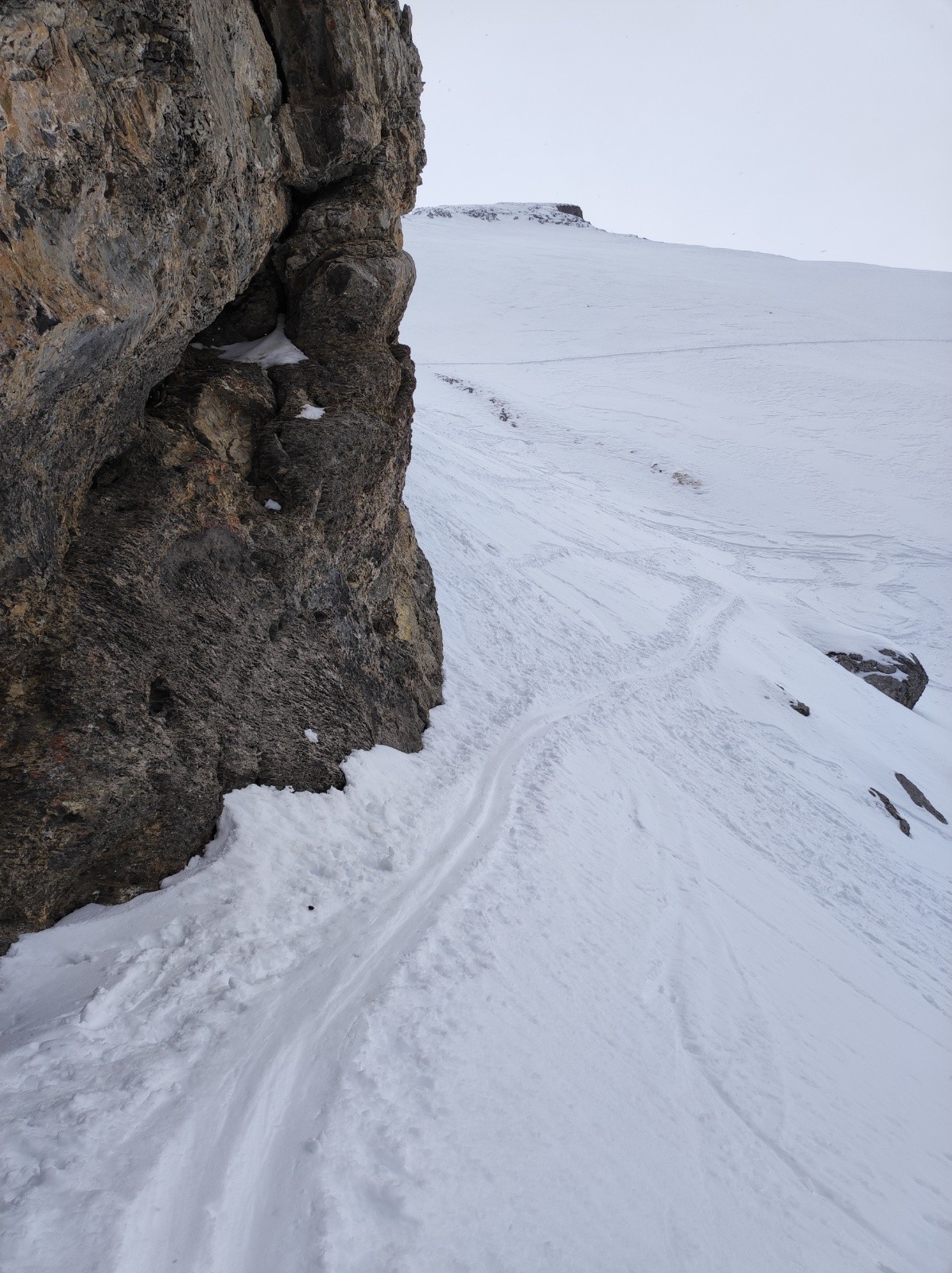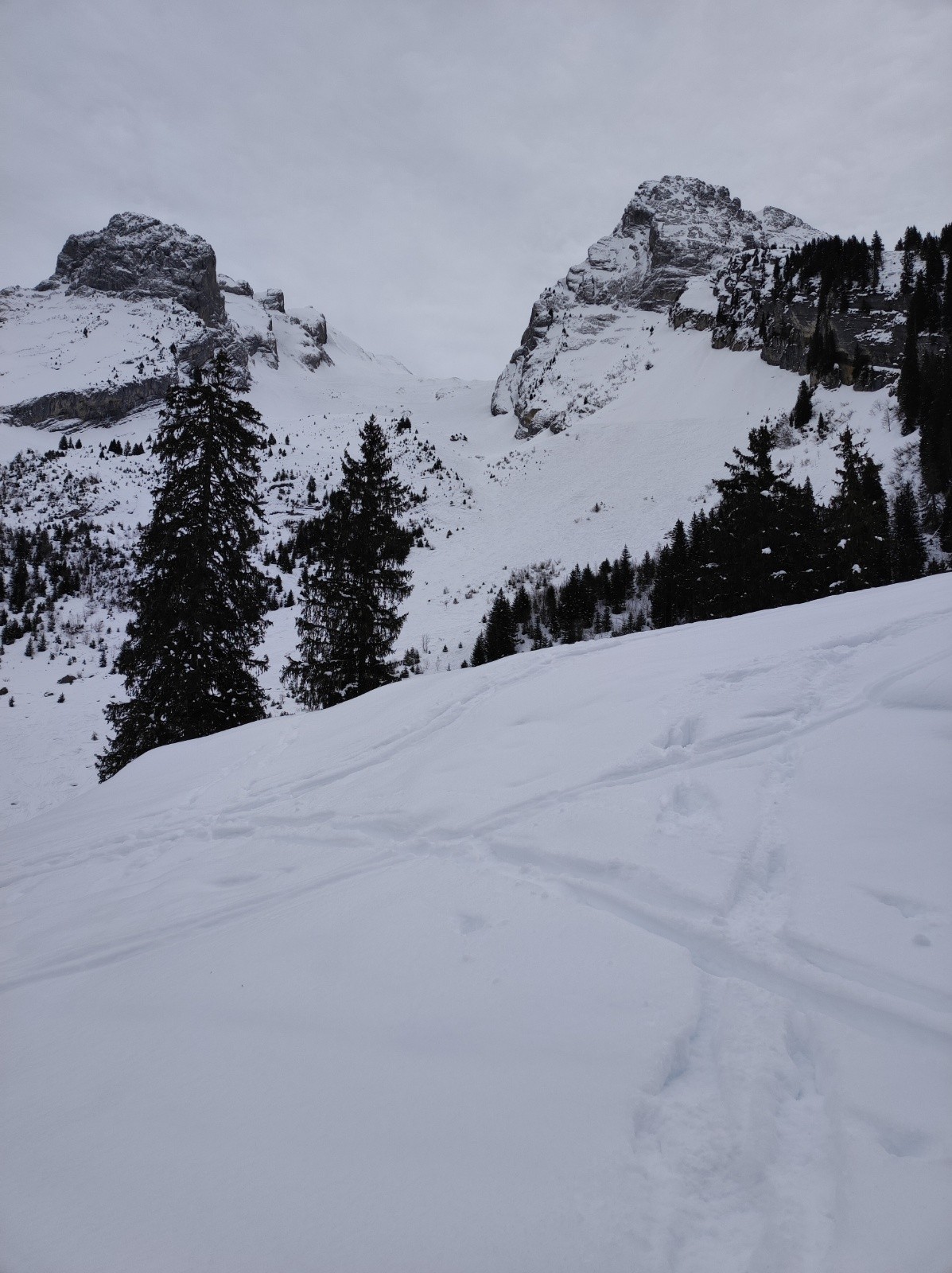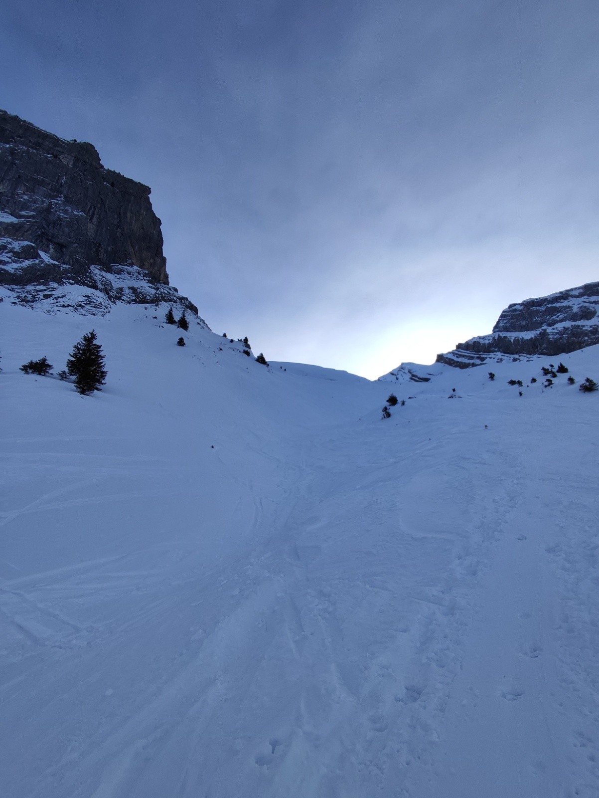 Conditions pour le ski : différentes neiges. En bas de la combe de Bella cha la forêt 2 petits portages pour passer la zone de racines et le rocher.
