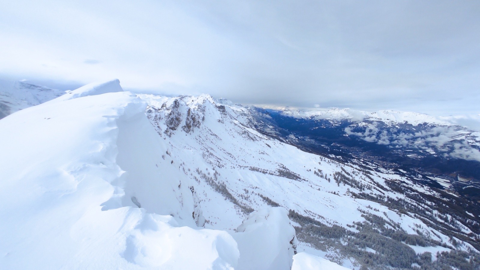 Itinéraire suivi : De la Rente, téléski du dôme, col du vallon Julien, crêtes jusqu'à la Tête des Fanets, photo des corniches qui auraient dû être dissuasives, quelques virages (photo prise quelques jours plus tard), une première avalanche, un rétablissement semble-t-il d'après la montre, puis un déclenchement qui fait descendre Alex de 400 m pour finir à 55 km/h contre un mélèze. Probable mort immédiate vu l'état d'Alex, dos plié autour de l'arbre.