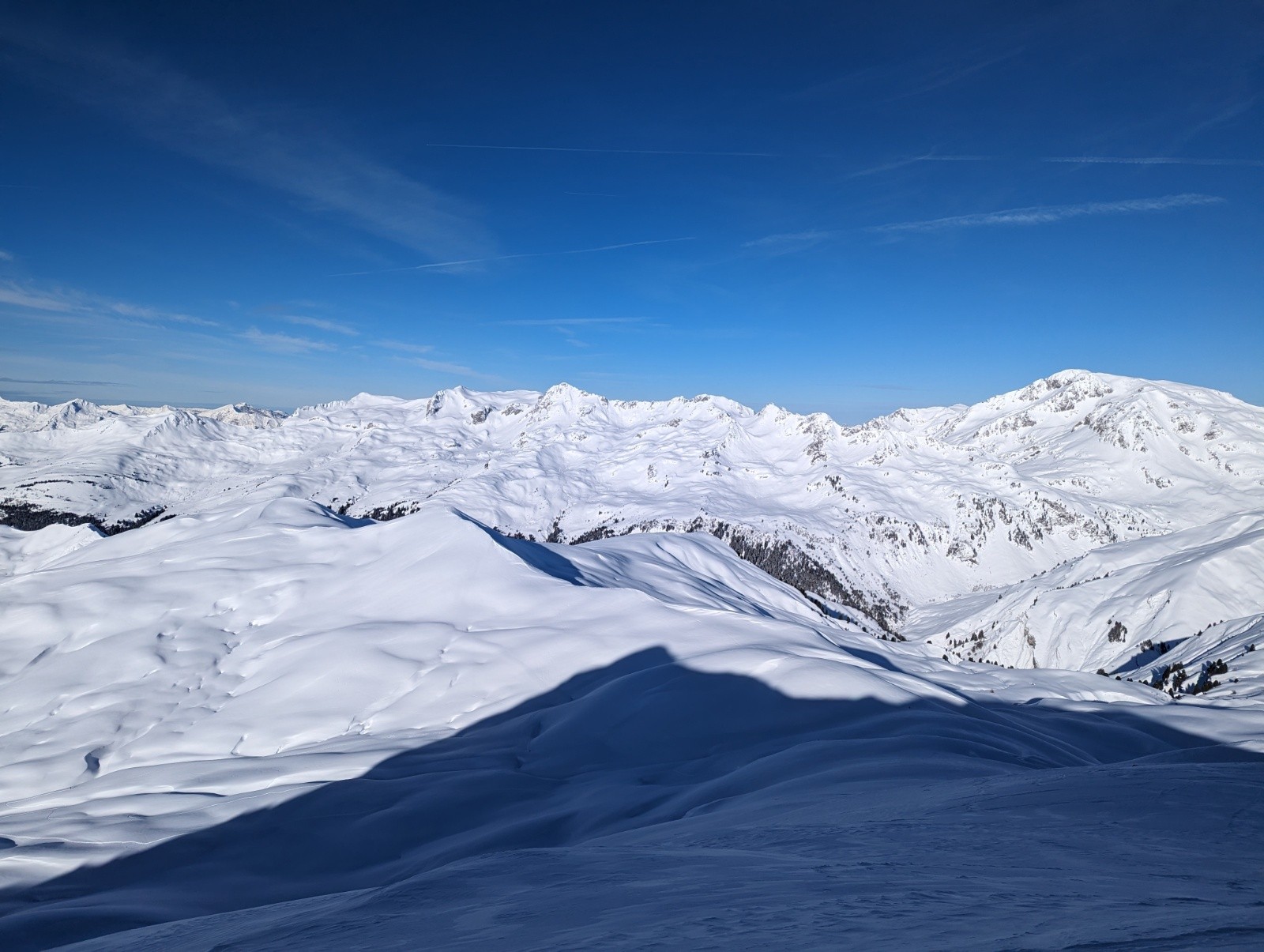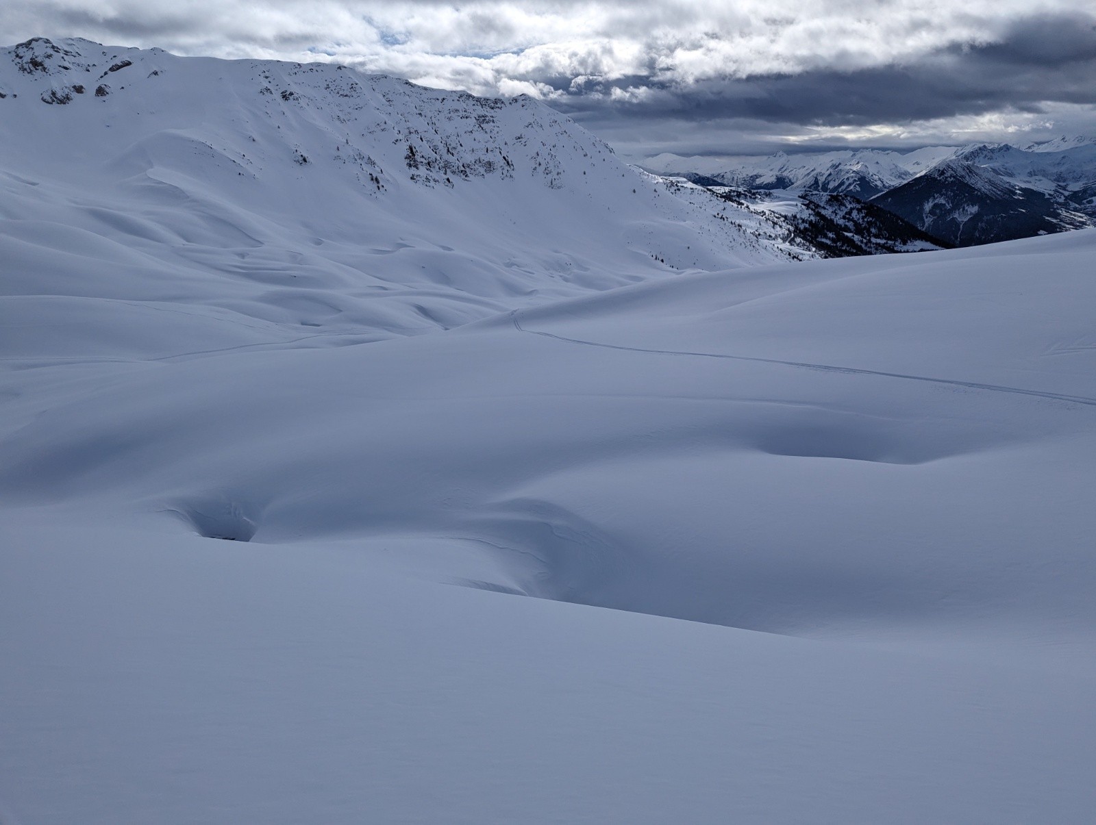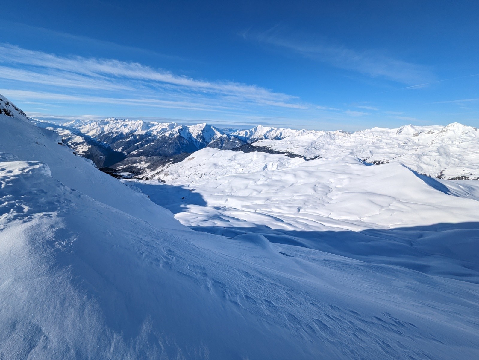 Conditions pour le ski : 15cm tombé la veille, mais le vent à bien travaillé, il y a des petites accumulations (surtout en Est) et un peu de carton (surtout sur les crêtes et en Ouest)