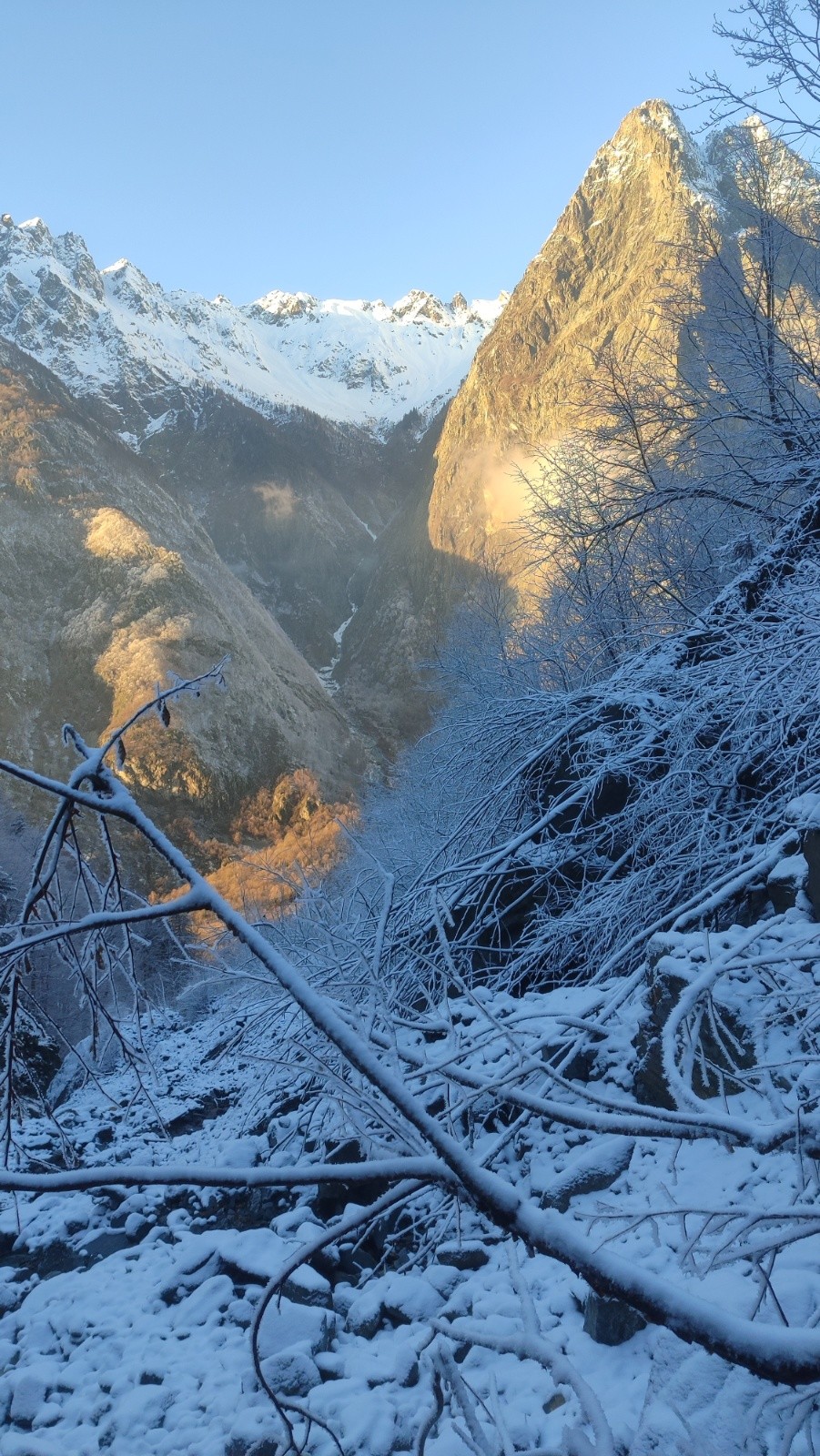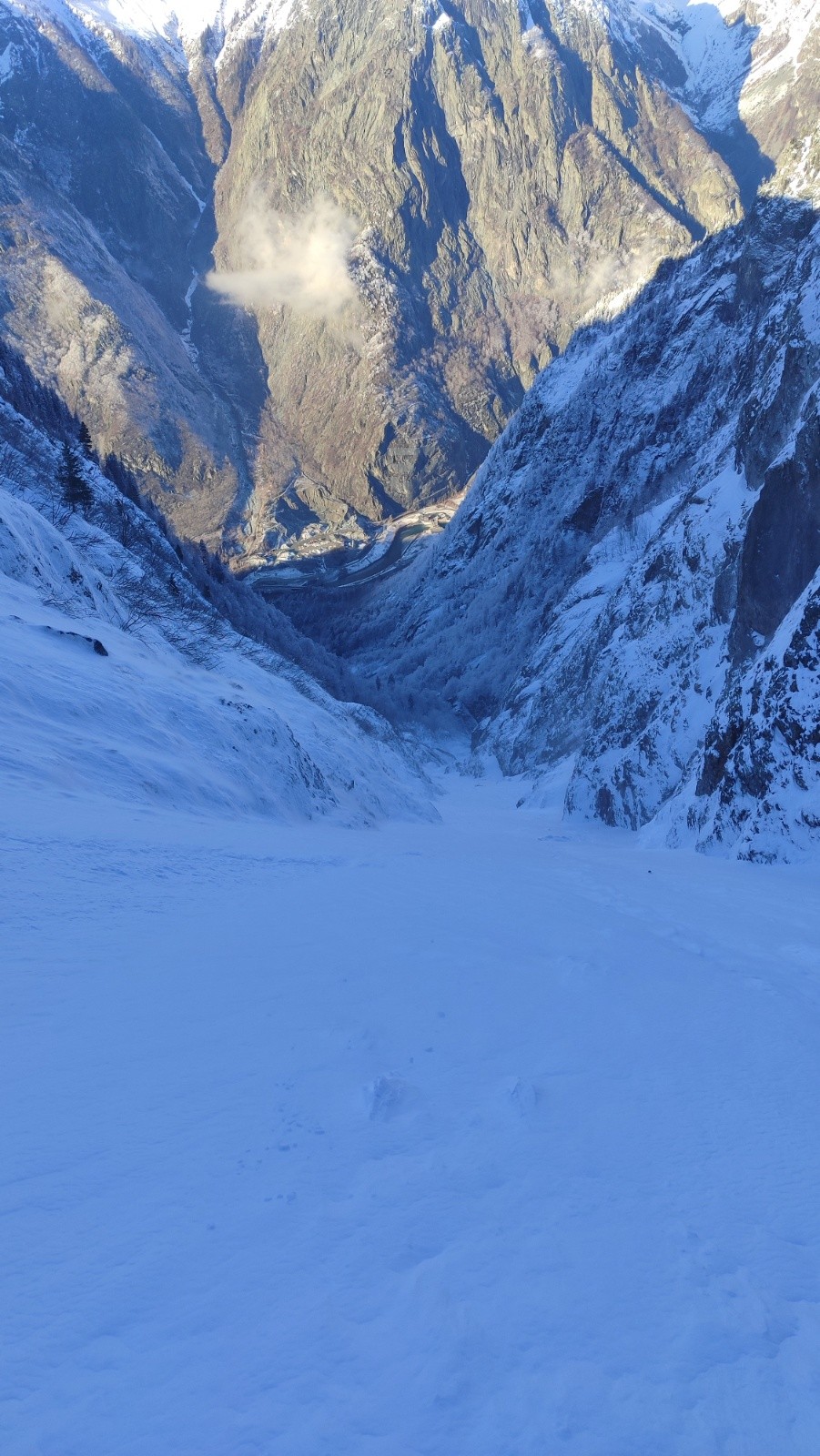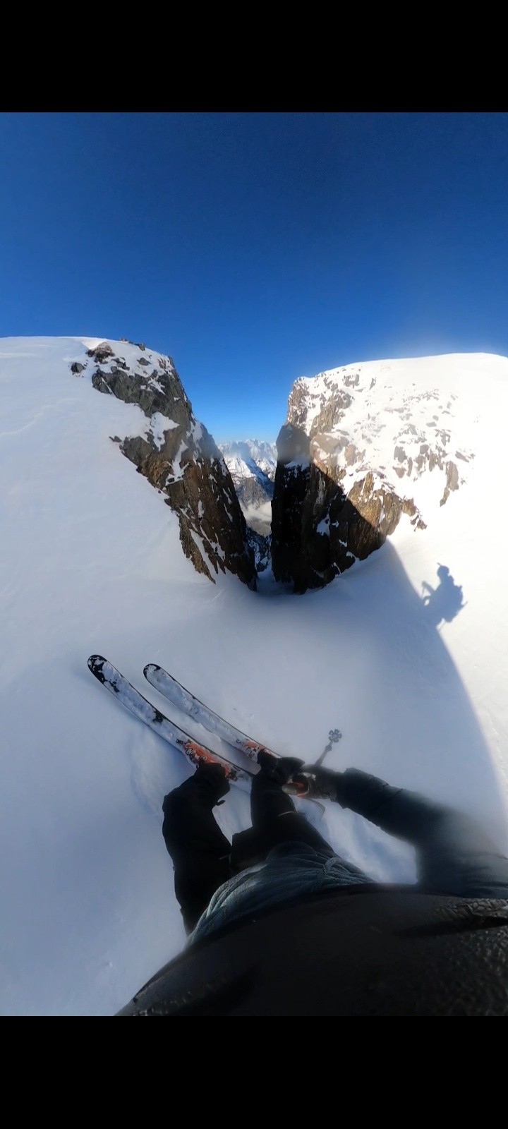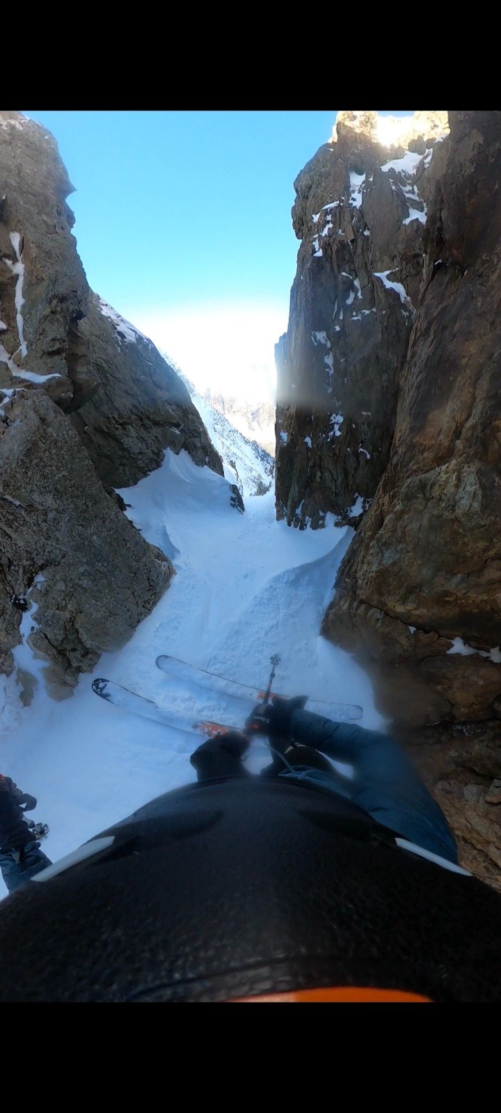 Bon un 6e infernet. Je passe dans le coin et ca demange ce grand voyage toujours plein de surprises. La surprise commence là où on ne l'attend pas. La route d'oulles. Etroite, pas d'accotements ou peu. Ca pisse fort sur la route il y a beaucoup de glace mais ca monte. Questionnement pour le retour. Comment je vais faire. Reponse immediate, 1km avant le hameau, bloqué je ne force pas j'amorce la descente. Le van part en crabe. Je frole le ravin. Meme en mettant 45 min pour 5km j ai tremblé comme jamais, le putin de crux du jour 😂 me vla en bas ca valait 5.6 ca. Un habitant remonte en pneu clous. Il me monte bien gentiment et va mettre le panneau fermé. 12h38 depart donc. Toujours à l'heure hein. Je suis collé comme celle que je me suis mis la veille 🫨. Skis lourds, corde lourde tout lourd. J'arrive liquide mais sans eau. Les abysses m'appelent. C'est rempli comme jamais mais un vent et des spindrifts qui sont entrain de tout plaquer. Malheureusement le ski est bon mais pas assez pour freerider reellement . Le rappel est collé de neige. Corde emmelée superrrr. Plus bas un pin sorti de nul part est planté verticalement, cocasse. Ca ski bien jusque vers 1400 et les boules et glace. Sous 1300 carnage comme prevu je finirai en crabe puis tranquille au chemin. 1er pouce et 1ere voiture, la chance et me voilà au pied d'oulles avant la nuit. Beai voyage encoreee