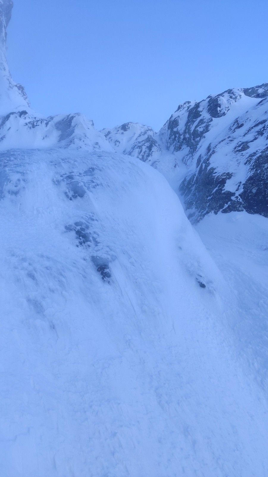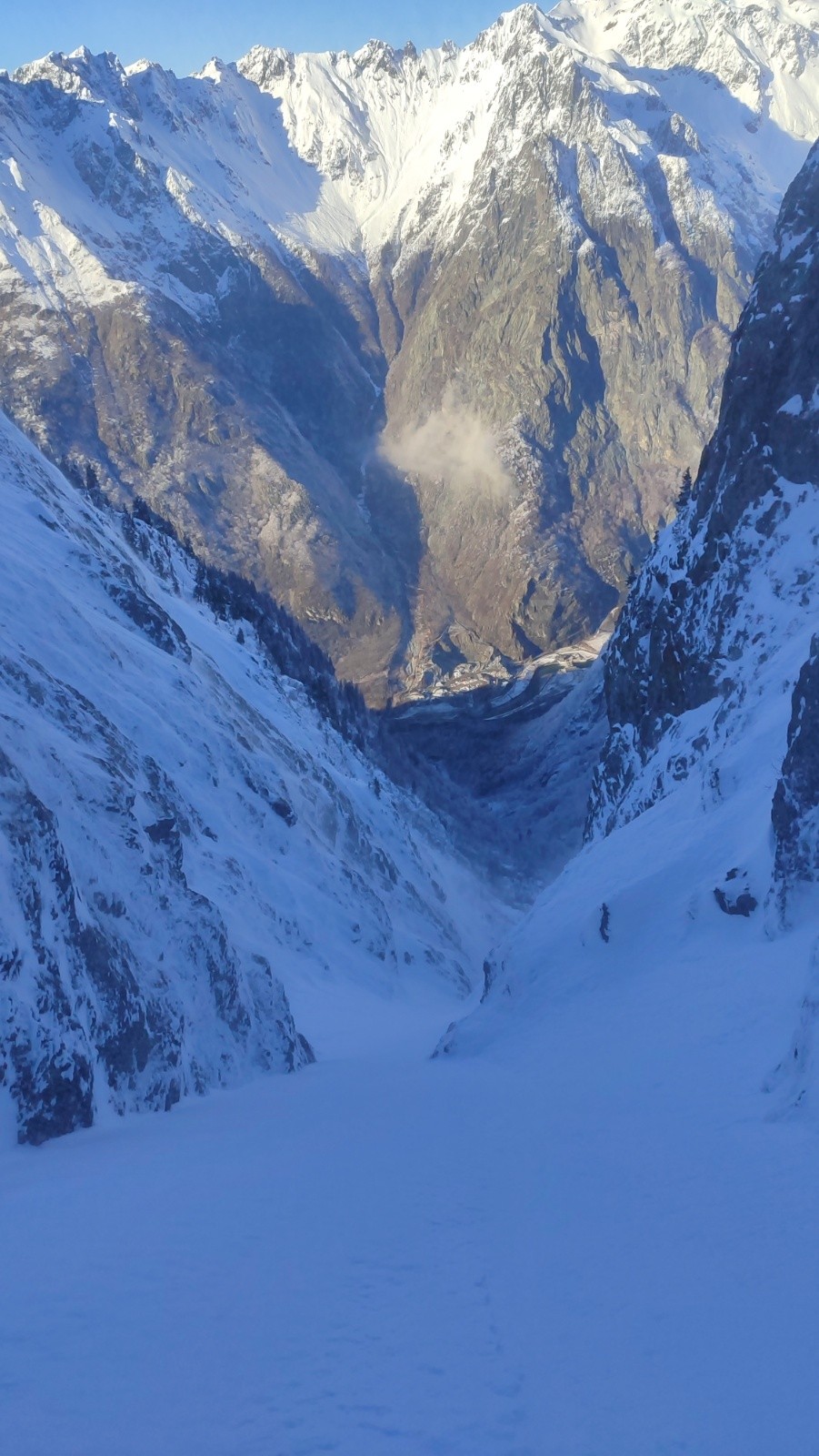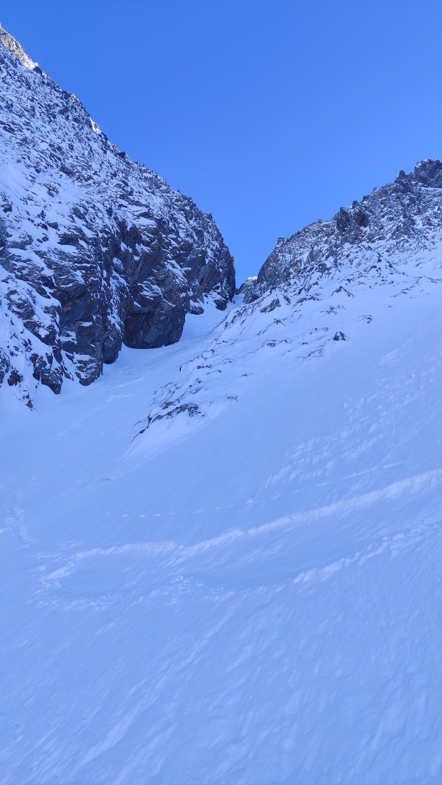 Conditions pour le ski : Variable avec les spindrifts. Typique de l'infernet. Froide dense à dure. Un peu de poudre. Glace et boules sur le tout bas inskiable
