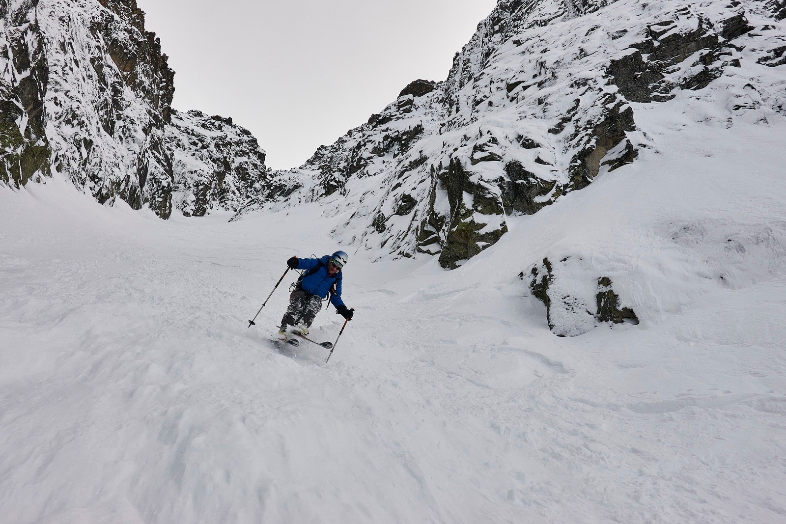 L’ambiance est assez exceptionnelle avec l’À-Pic en bordure du couloir. La remontée est physique, la neige plutôt bonne, on est confiant pour le haut… Sauf qu’on retrouve cette satanée couche verglacée déjà présente la semaine dernière aux abords des crêtes. Le crux est assez inskiable dans ces conditions, alors on arrête au pied sans insister. Tant pis, on reviendra pour les quelques hectomètres manquants !