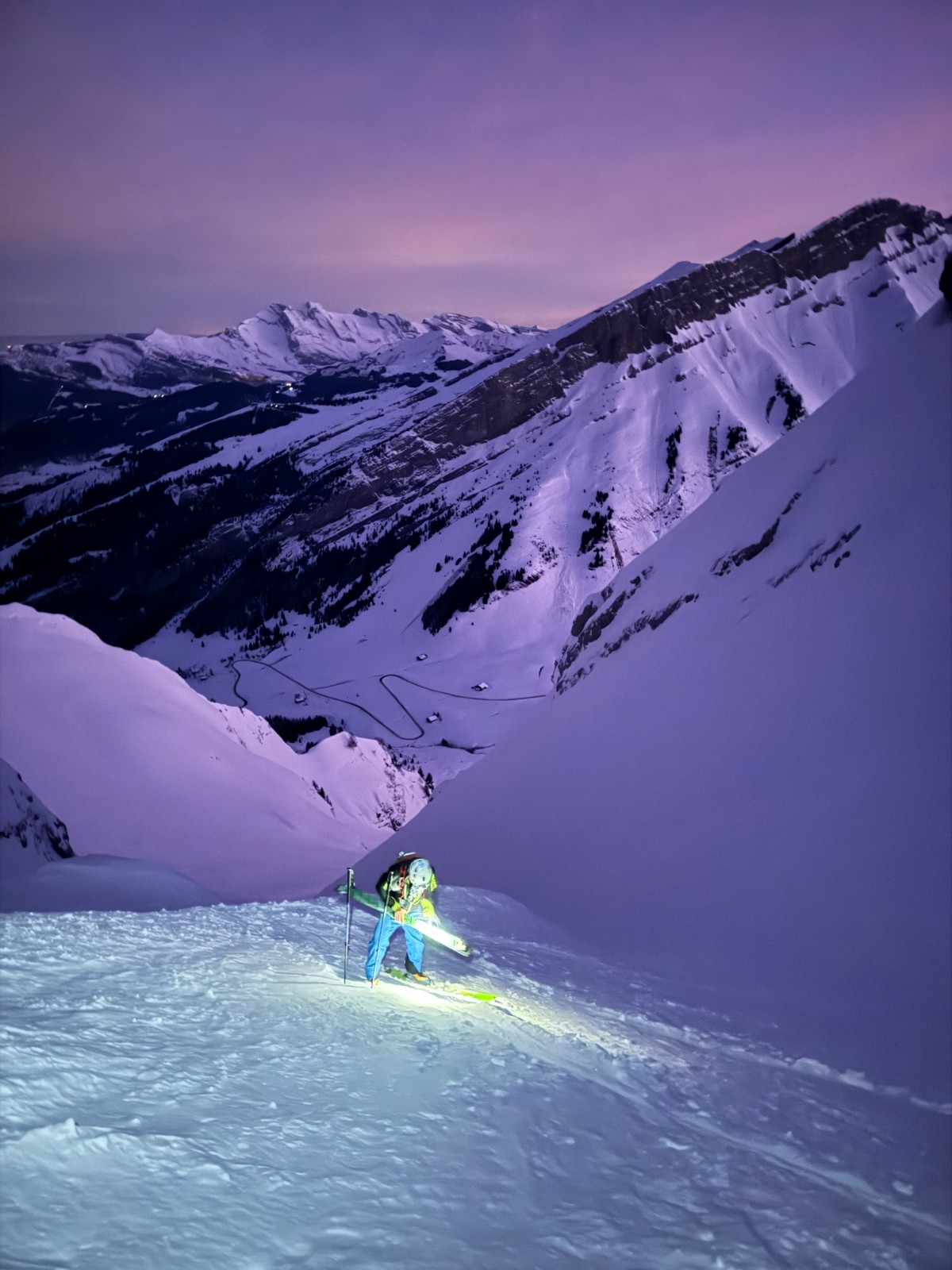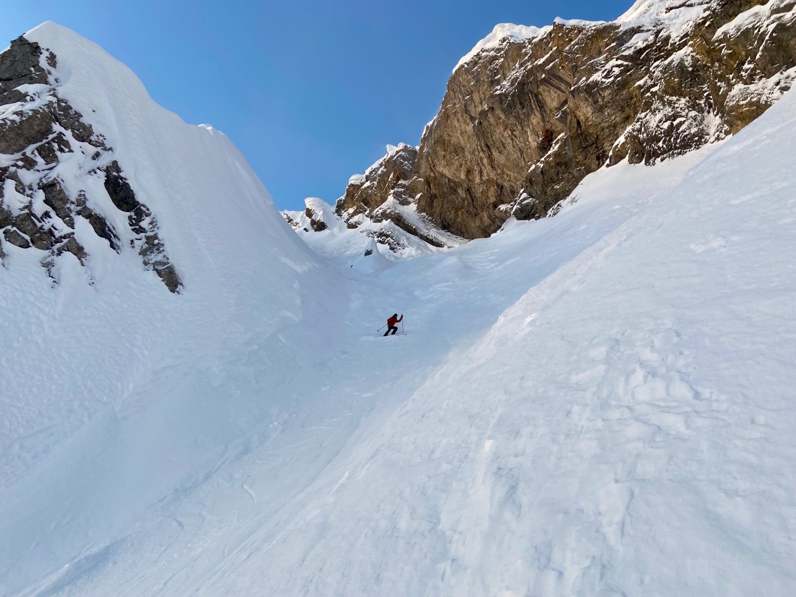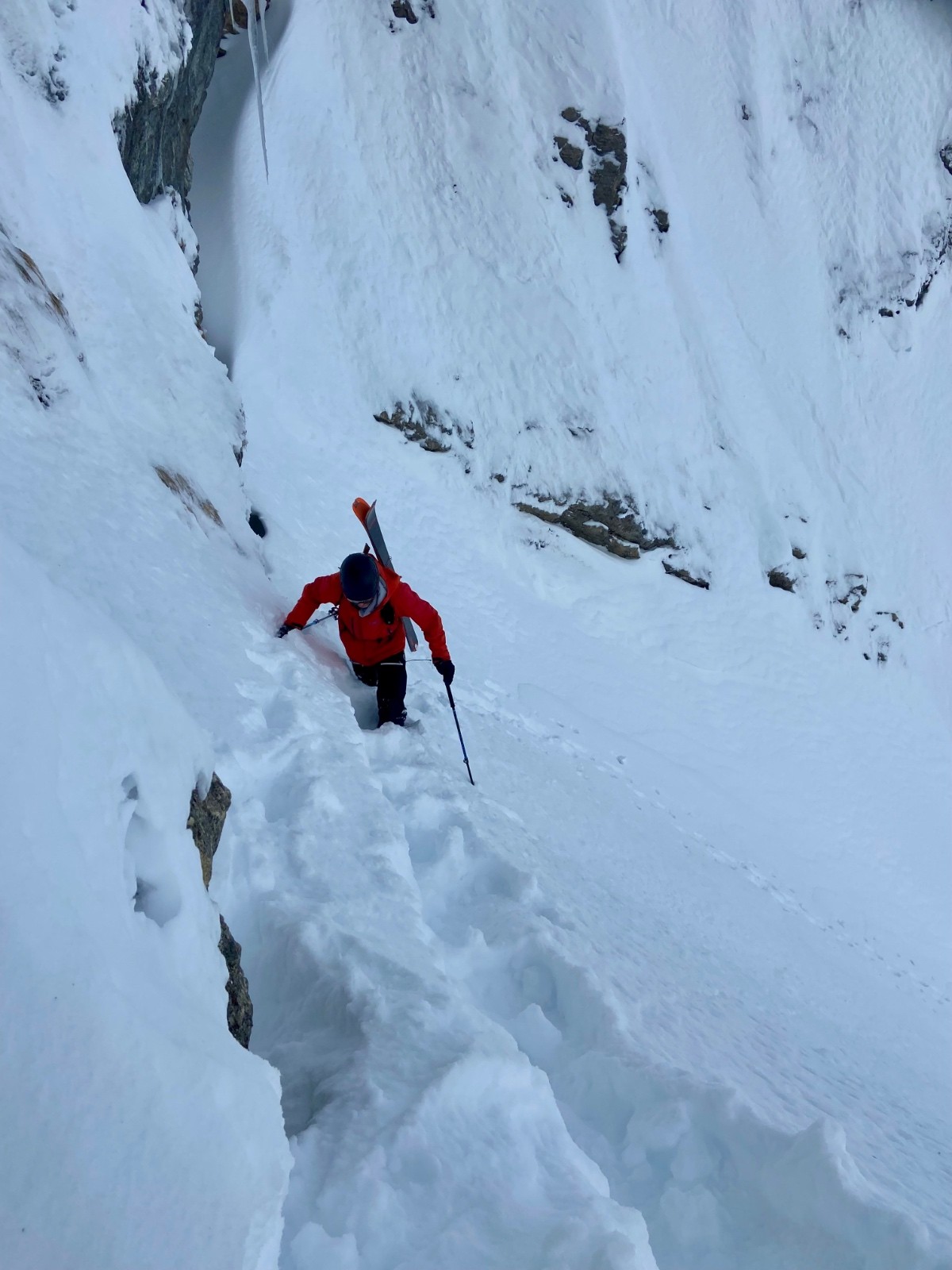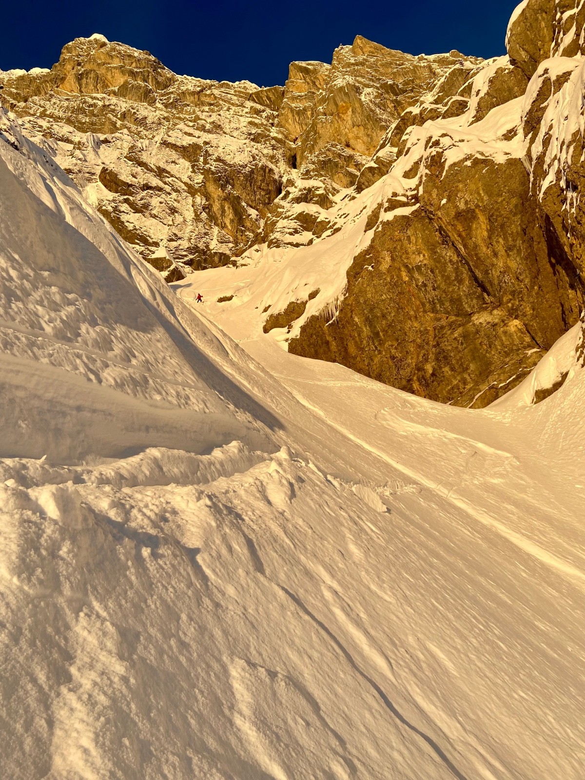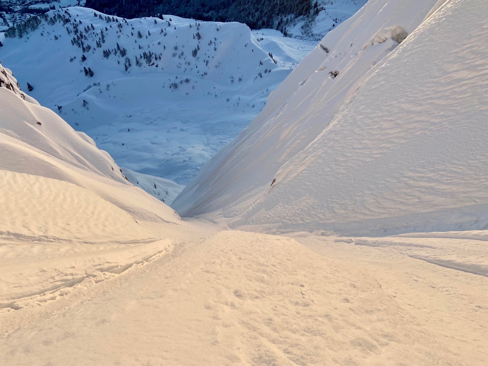 Une super sortie de papaz viellissants. On avait (je crois) tous les deux le souvenir d’une rampe Chauchefoin pépère, et j’étais persuadé que ce serait tracé, que nenni! La montée par la Marion déroule presque malgré une trace raide et des peaux capricieuses. Arrivée dans la Blonnière avec de superbes lumières, on rejoint l’entrée sans encombre. L’entrée est bien masquée par contre, et barrée par une énorme corniche. Heureusement qu’on connaît bien, ce qui permet de s’approcher malgré tout prudemment de la seule faiblesse pour rentrer dans la rampe par un petit saut/tout droit. Des plaques énormes ont bien purgé le haut, mais en louvoyant on trouve de la neige froide dense ou de la poudre jusqu’à la traversée bien bien chargée. Je suis passé en mode concentré piolet en main pour ne pas baser la barre, conditions idéales en fait… En dessous c’est full peuf, pas de ressaut couloir large et contrepentes ultraraides en chantilly, à se prendre pour de jeunes frirailleudeurs. Au final on n’a pas trouvé ça si facile!