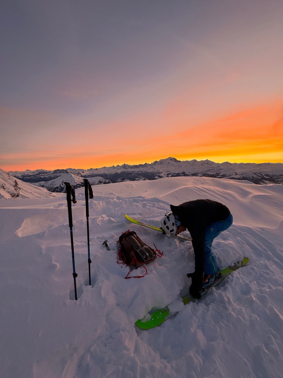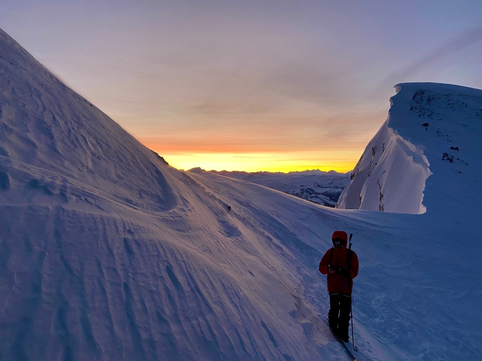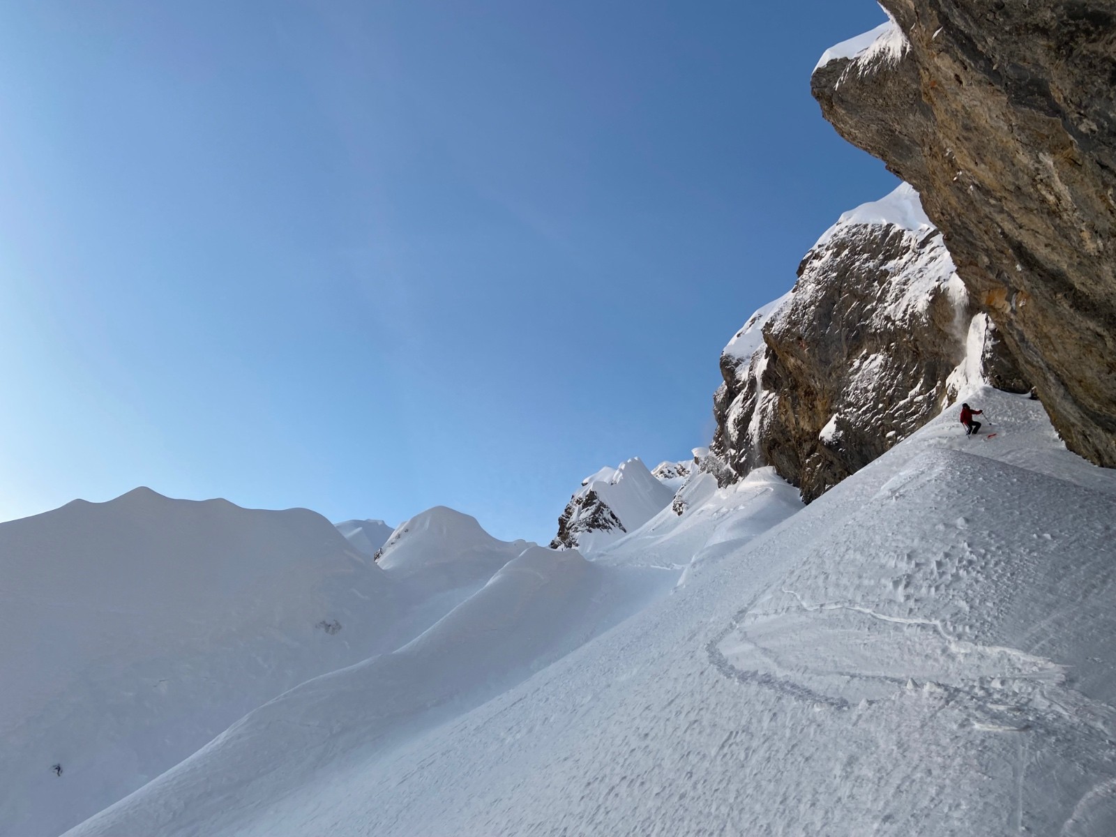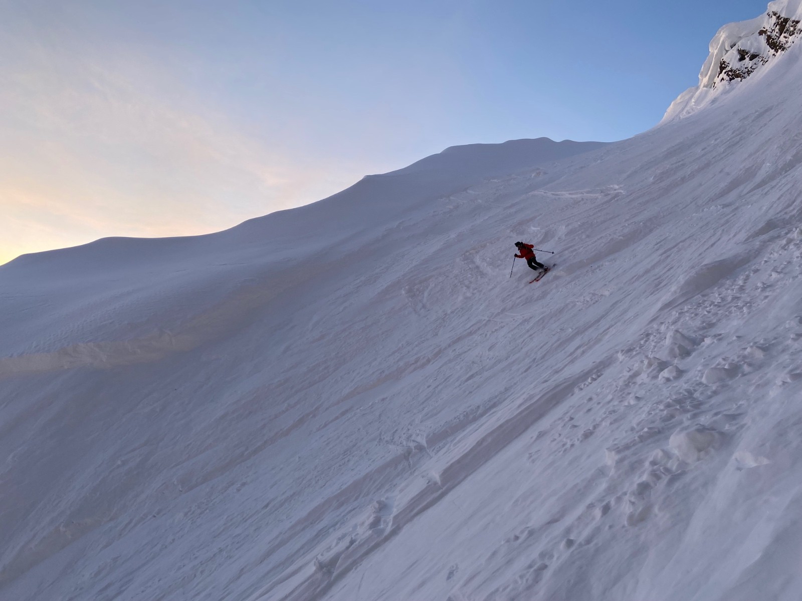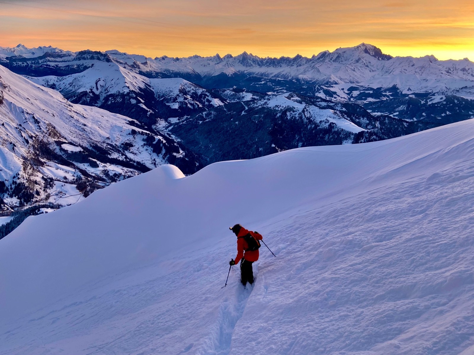 Une super sortie de papaz viellissants. On avait (je crois) tous les deux le souvenir d’une rampe Chauchefoin pépère, et j’étais persuadé que ce serait tracé, que nenni! La montée par la Marion déroule presque malgré une trace raide et des peaux capricieuses. Arrivée dans la Blonnière avec de superbes lumières, on rejoint l’entrée sans encombre. L’entrée est bien masquée par contre, et barrée par une énorme corniche. Heureusement qu’on connaît bien, ce qui permet de s’approcher malgré tout prudemment de la seule faiblesse pour rentrer dans la rampe par un petit saut/tout droit. Des plaques énormes ont bien purgé le haut, mais en louvoyant on trouve de la neige froide dense ou de la poudre jusqu’à la traversée bien bien chargée. Je suis passé en mode concentré piolet en main pour ne pas baser la barre, conditions idéales en fait… En dessous c’est full peuf, pas de ressaut couloir large et contrepentes ultraraides en chantilly, à se prendre pour de jeunes frirailleudeurs. Au final on n’a pas trouvé ça si facile!