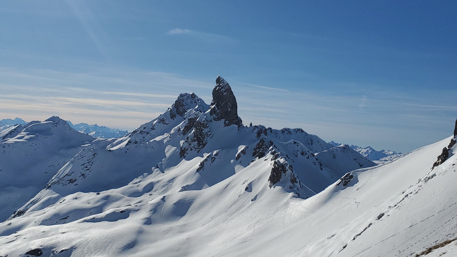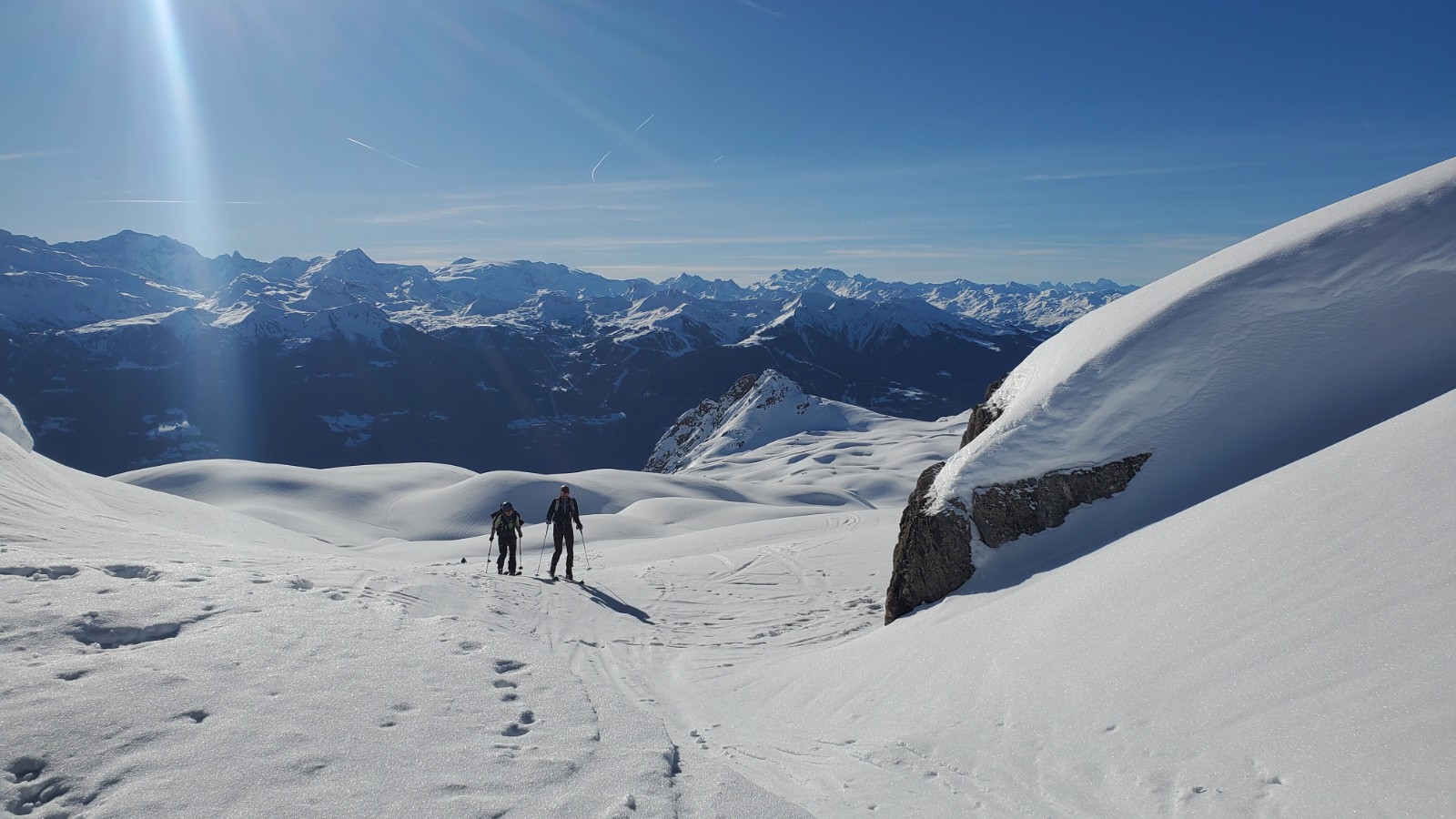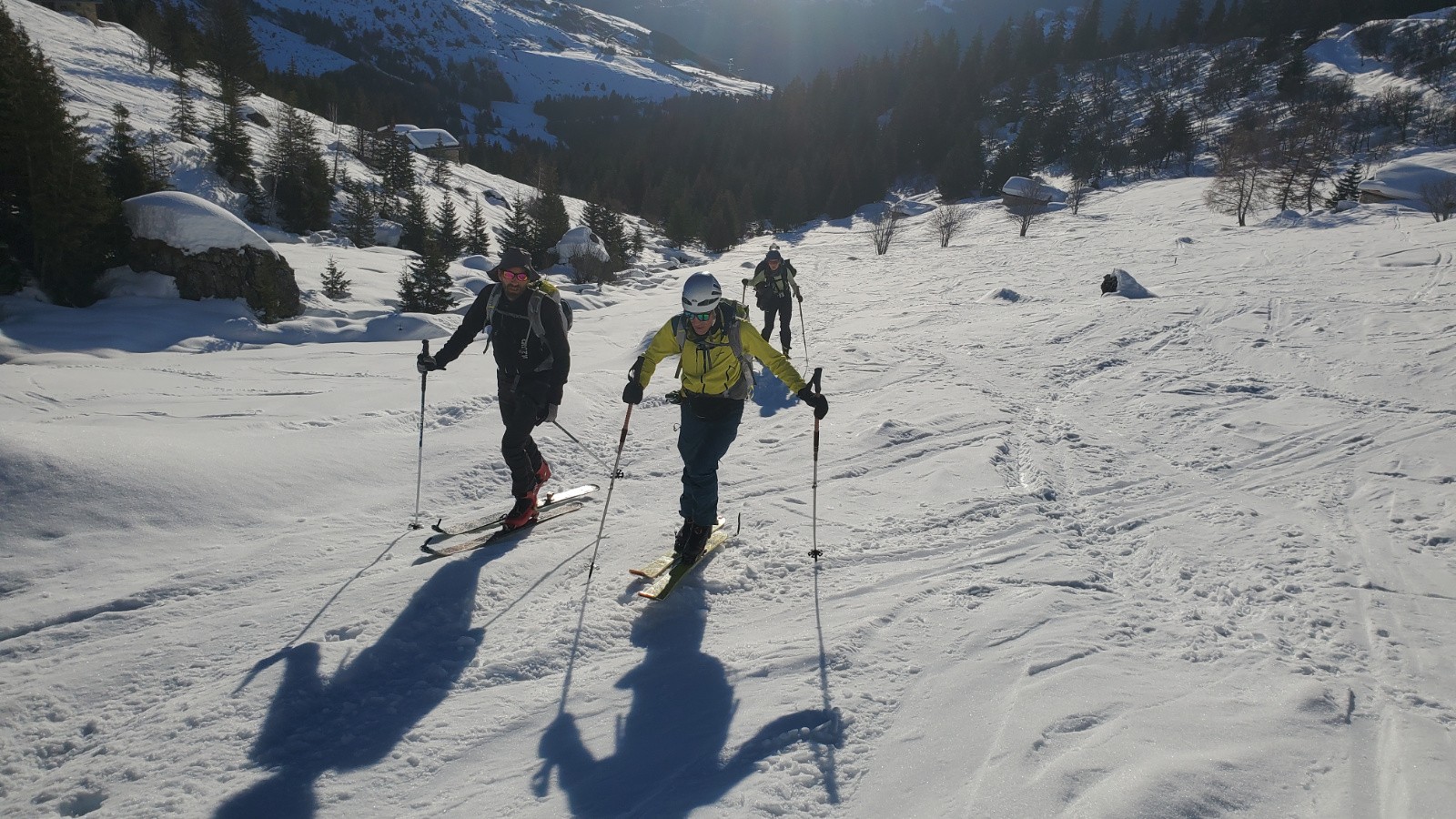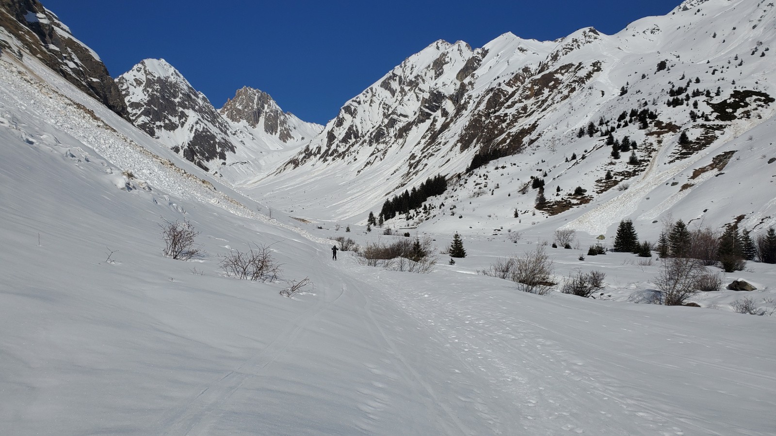 Avec Christian, Philippe et Juju. Peu de monde en montant dans le vallon, assez étonnant. La première descente est correcte avec un bon grip et quelques zones décaillées dans les contre-pentes. Remontée en couteaux à la pointe de Presset sauf pour Christian que je soupçonne d'utiliser la peau de vrais bébés phoques. Décaillage parfait à 13h. Certaines zones plus plates étaient encore dures car même si on a l'impression d'être au printemps, les rayons sont encore bas en ce mois de janvier. Une équipe qui trainait pas pour ce beau tour.