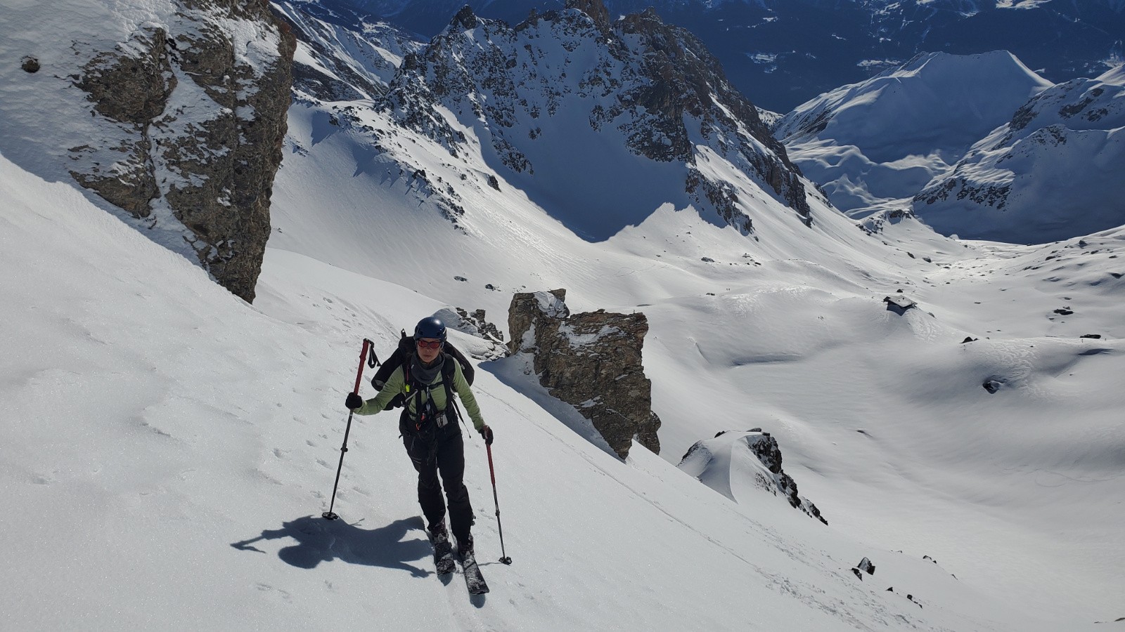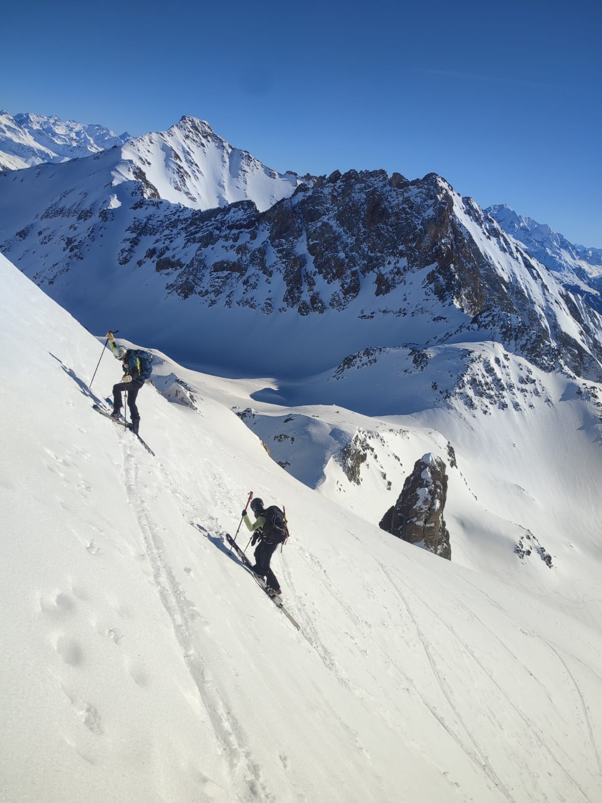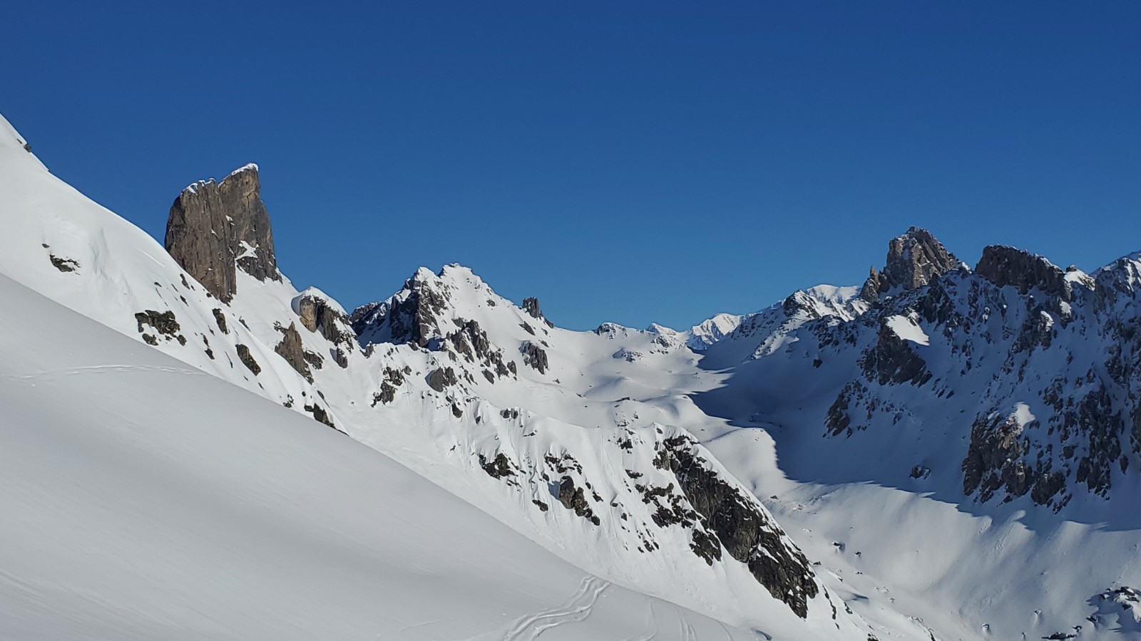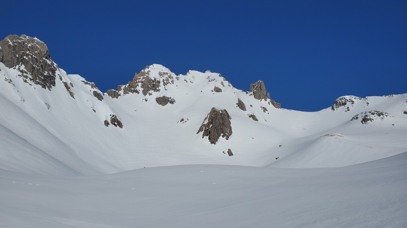 Avec Christian, Philippe et Juju. Peu de monde en montant dans le vallon, assez étonnant. La première descente est correcte avec un bon grip et quelques zones décaillées dans les contre-pentes. Remontée en couteaux à la pointe de Presset sauf pour Christian que je soupçonne d'utiliser la peau de vrais bébés phoques. Décaillage parfait à 13h. Certaines zones plus plates étaient encore dures car même si on a l'impression d'être au printemps, les rayons sont encore bas en ce mois de janvier. Une équipe qui trainait pas pour ce beau tour.