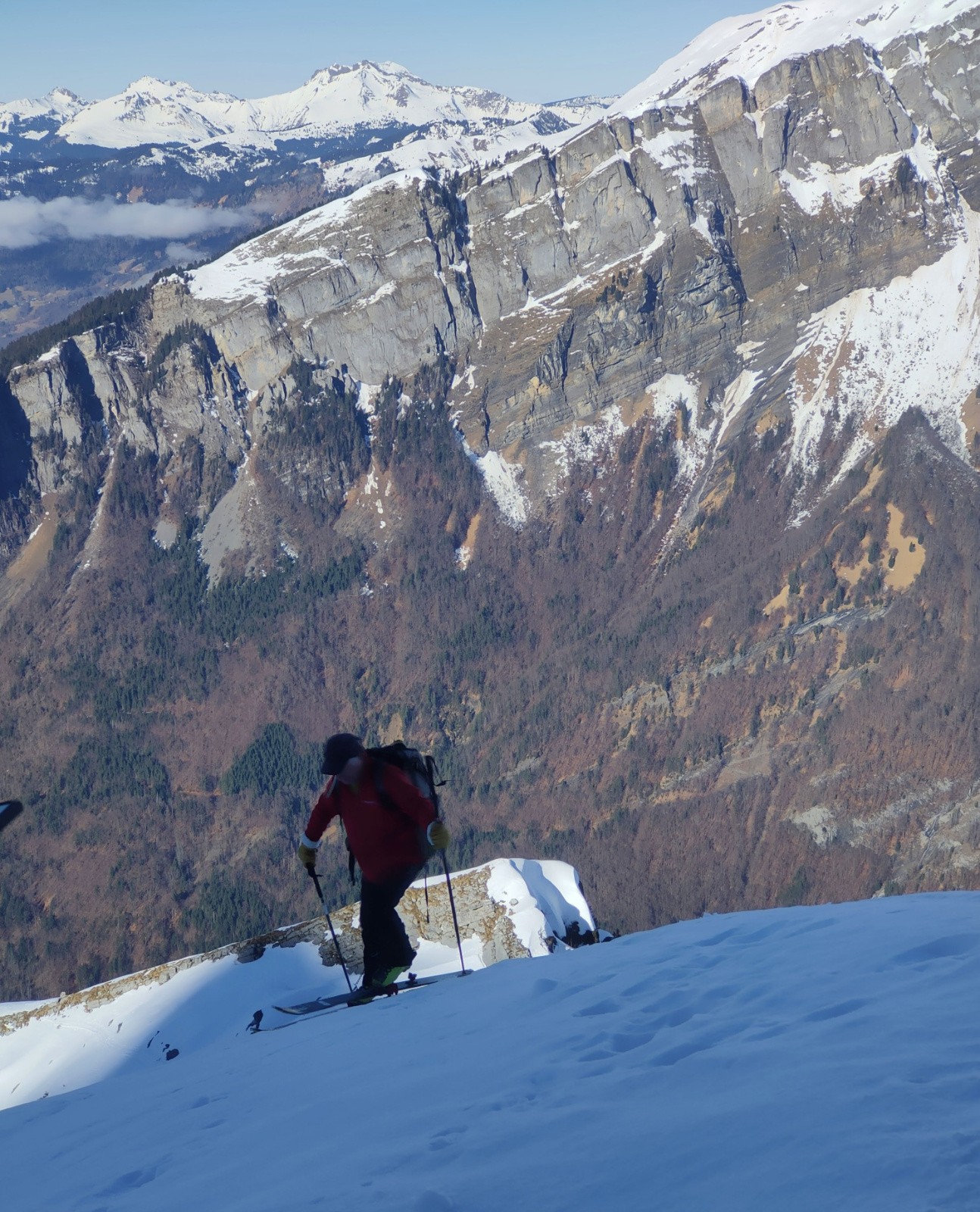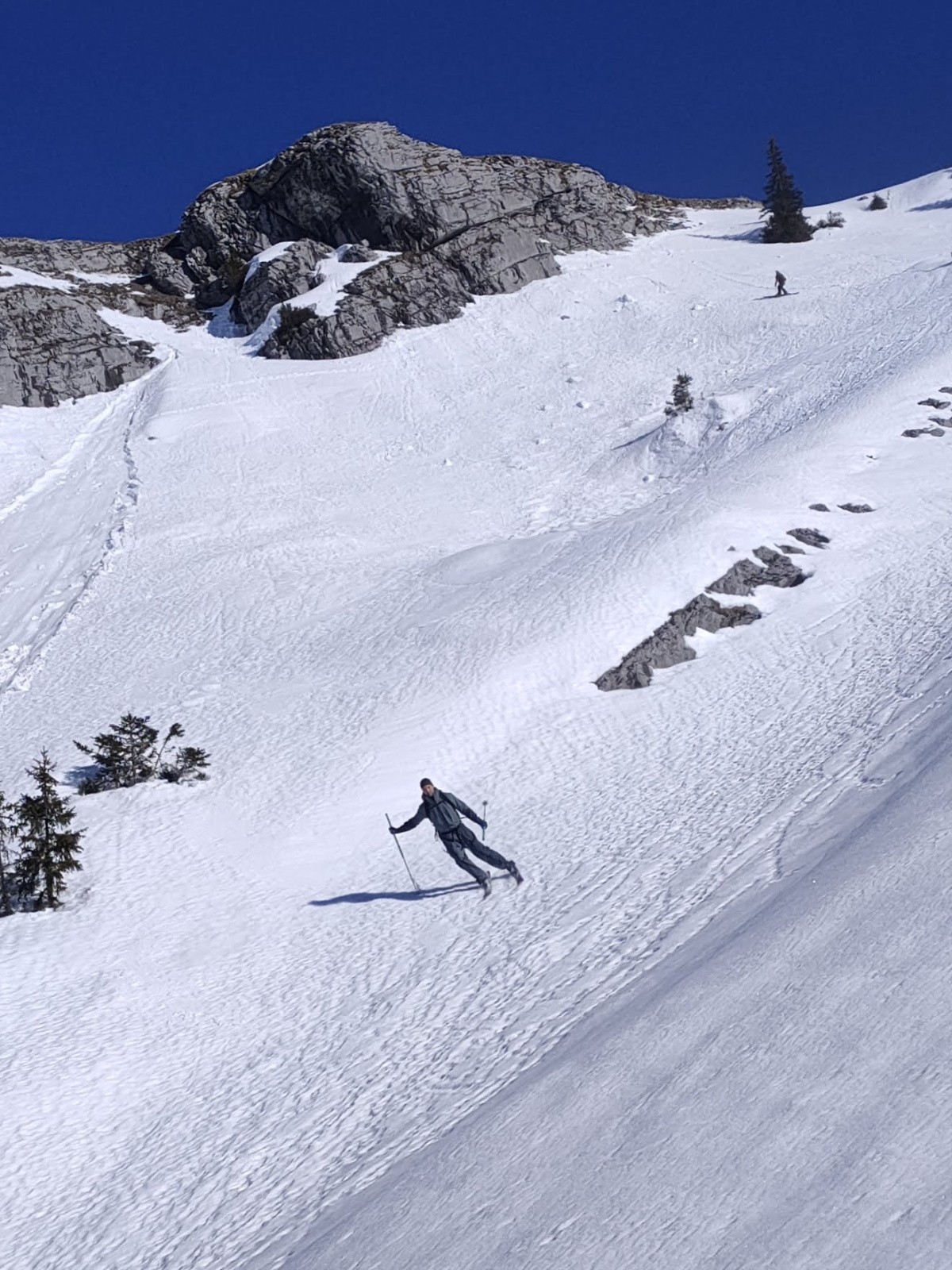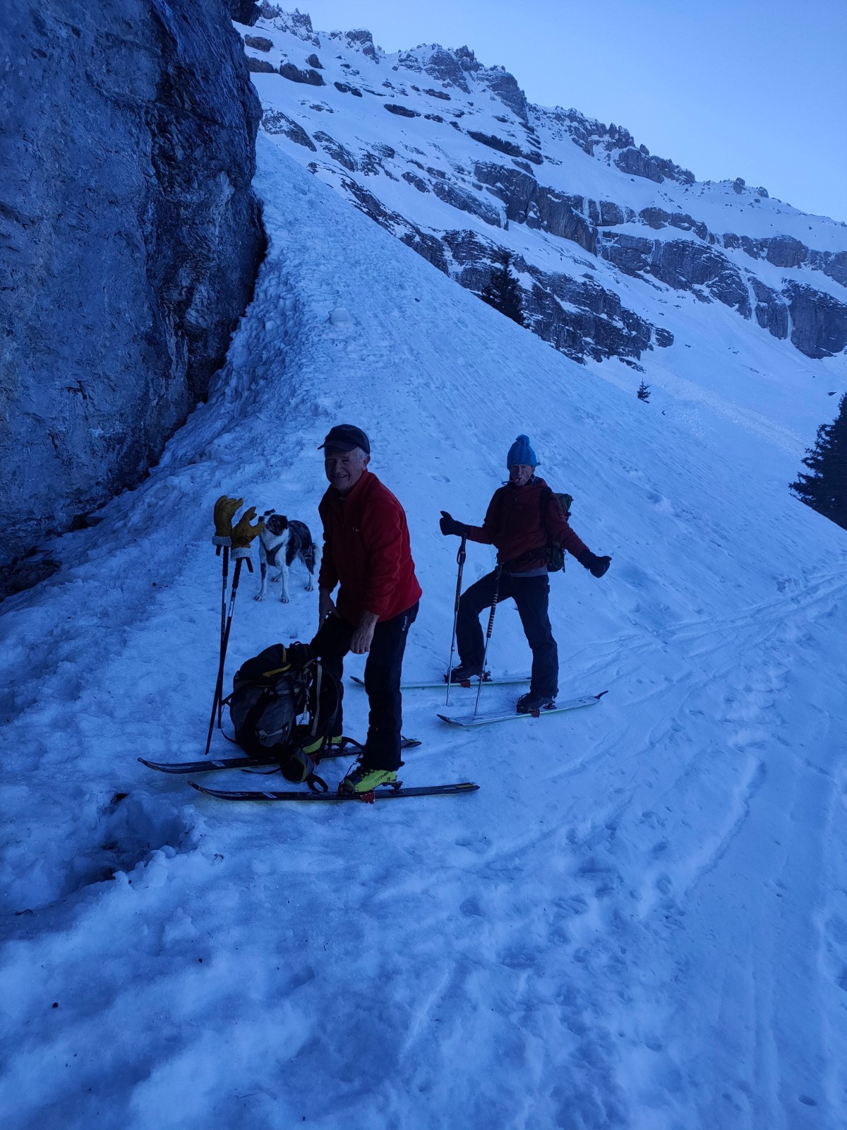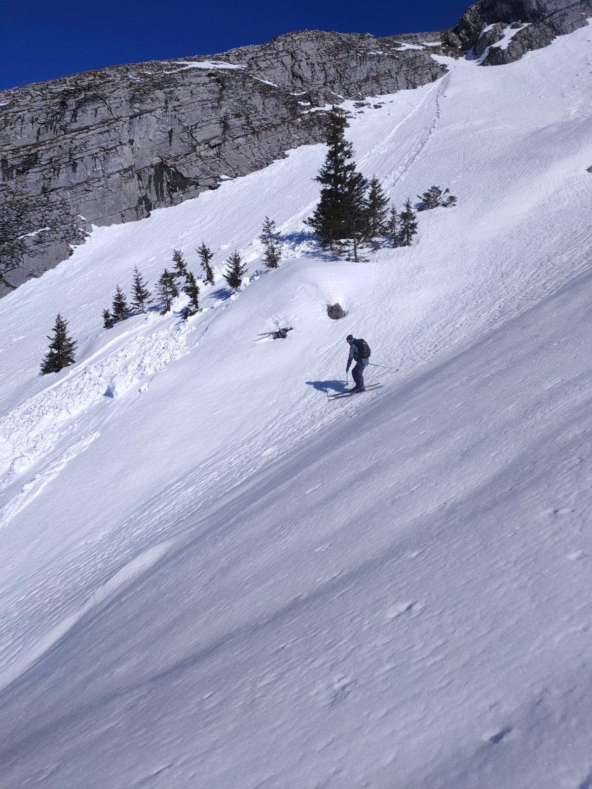 Conditions pour le ski : Neige béton au dessus de 1700m, voire vitrifiée par endroits ce qui rend la montée sans couteaux totalement interdite..! Je conseille même les crampons dans le sac..sans oublier la topette de gnole en attendant que ça décaille..!!