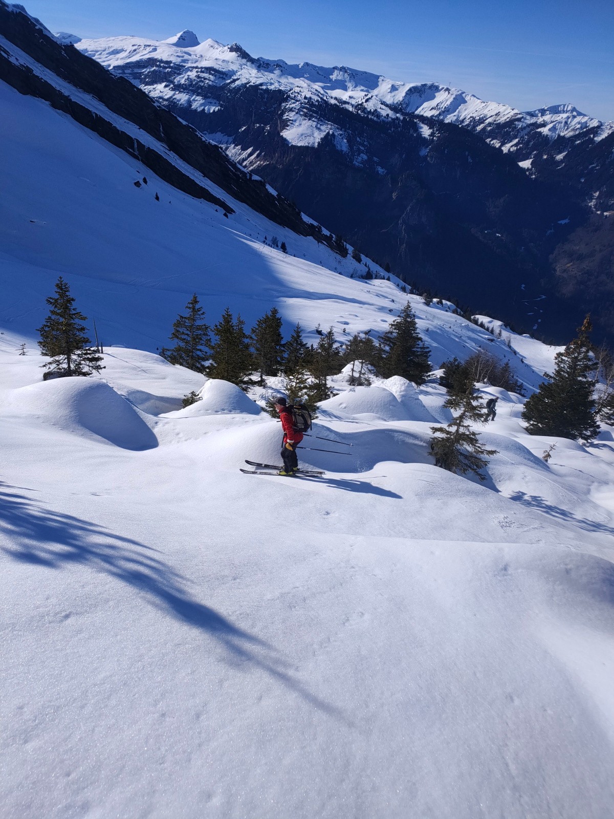Je reprends ce commentaire fait lors de cette rando en fin d'année 23.. et cette fois, je valide 1: les zones sèches. 2: les parties vitrifiées ou il bon de savoir faire les conversions sans avoir peur des dérapages possibles. 3: Ne pas craindre les descentes sur neige béton armé et les traversées de torrent chaotiques.. alors dans ces conditions, on peut juger qu'une pente à 35° représente un danger si on perd le contrôle de ses spatules... Faut pas tomber hein..!