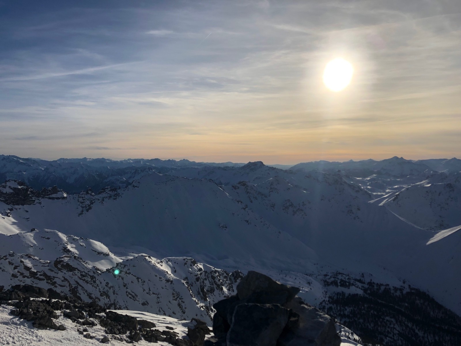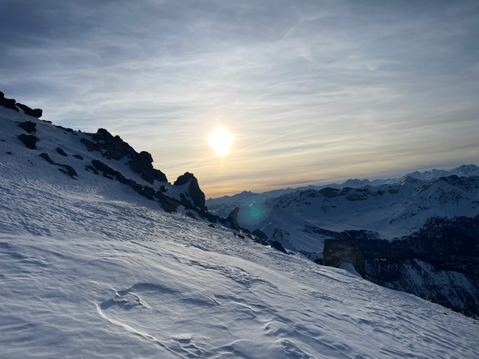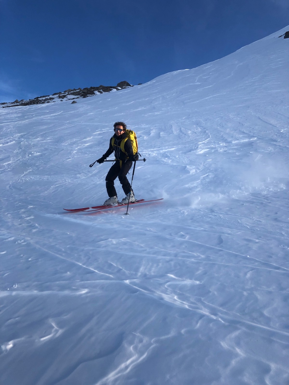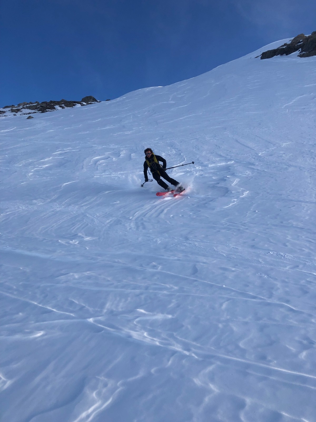 Conditions nivo et activité avalancheuse : pas d’avalanche récente constatée . Mais ça chauffait beaucoup au sud est avec neige humide vers midi . Conditions Nivo : le frais et le regel de cette nuit ont cartonné la neige de printemps humide dans presque toutes les orientations . 100m de poudreuse trouvés en Nord vers 2500m sur une descente de 2300m c’est bien maigre