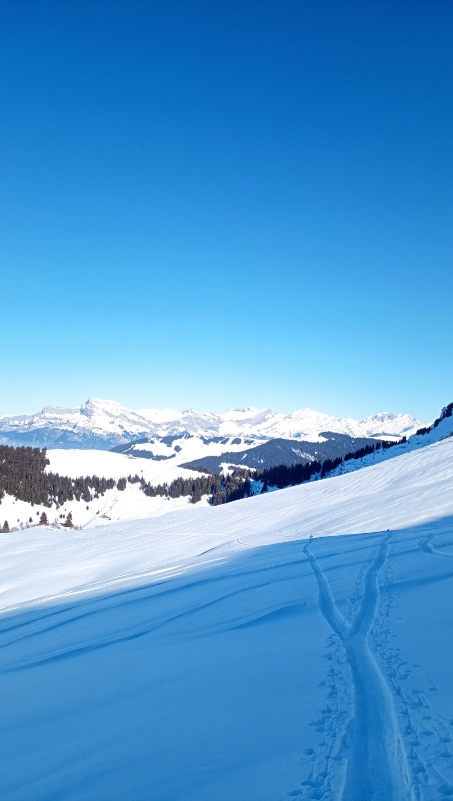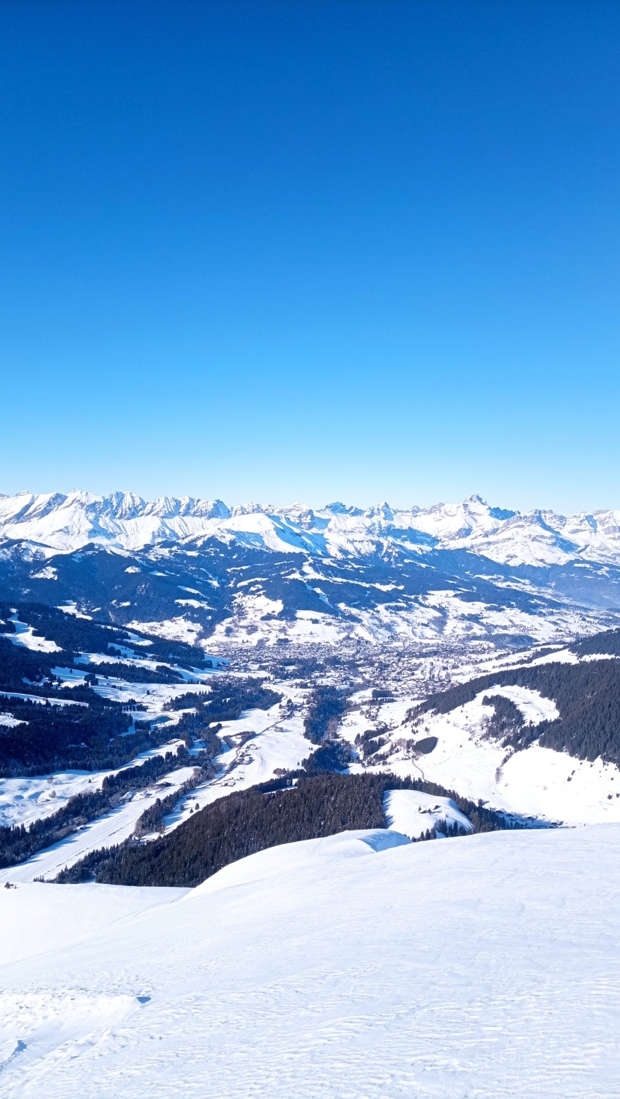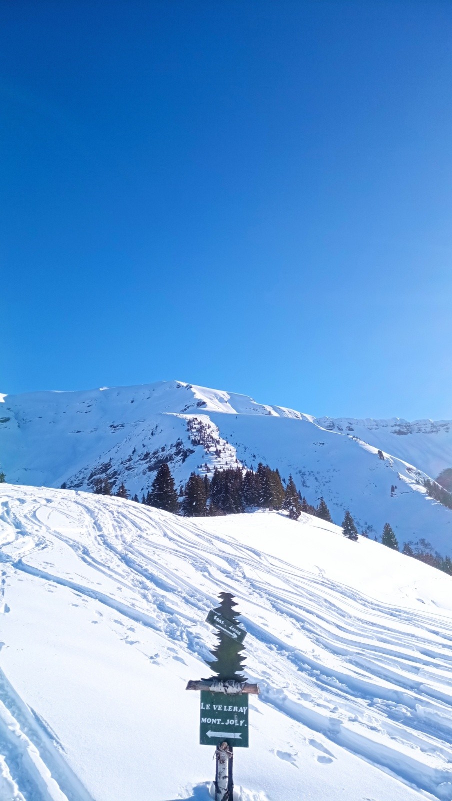 Itinéraire suivi : depuis le parking de côte 2000 Megève, téléski de lanchette et col de very, descente dans les alpages sur Belleville pour rejoindre les RM des contamines, prendre le téléski du veleray pour faire cette superbe descente N avec la vue sur la vallée de Megève